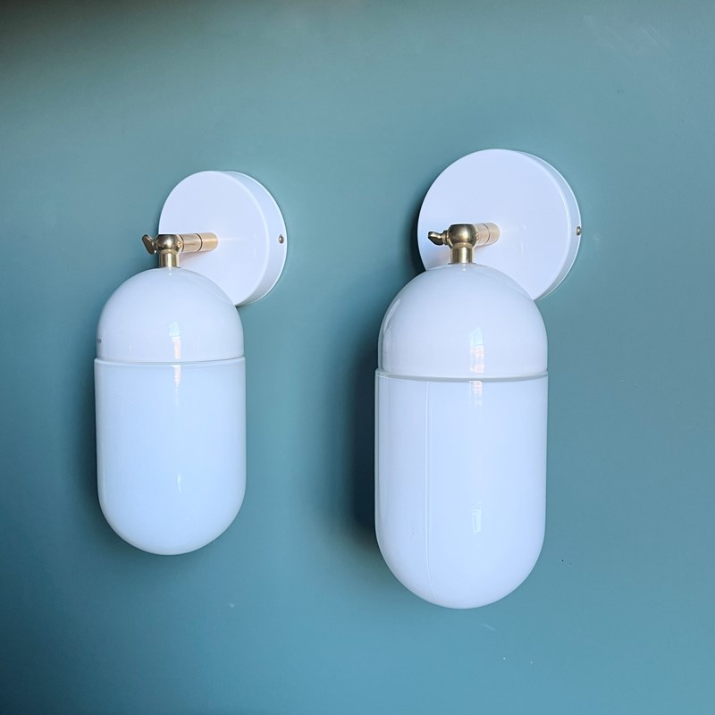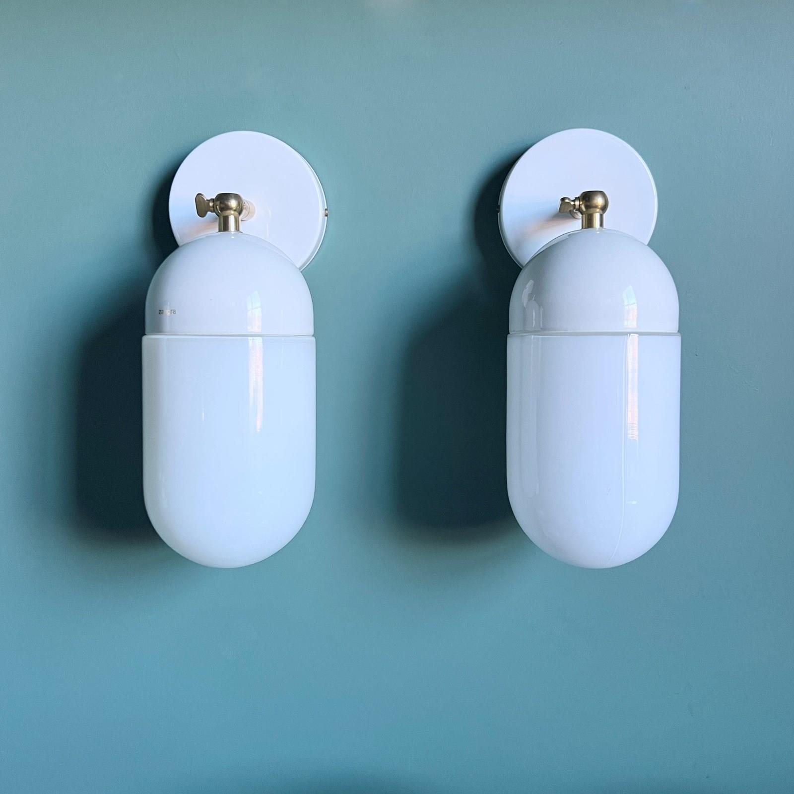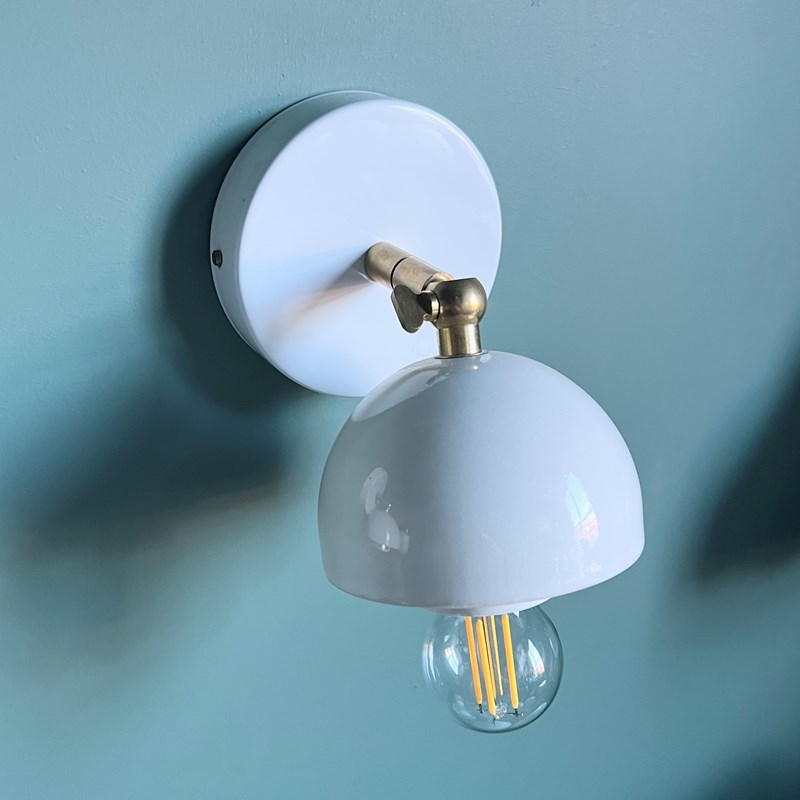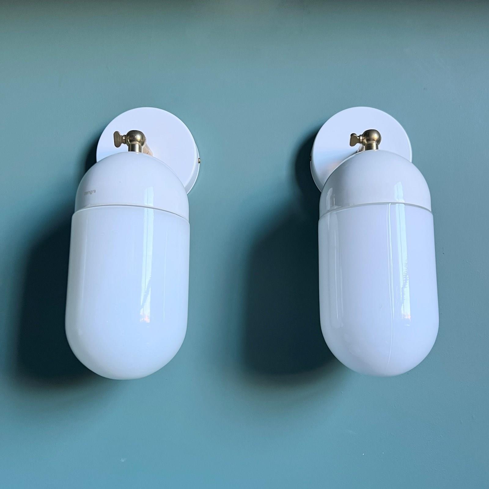 This contemporary wall light has a white polished glass enclosed shade and white porcelain fitting. The brass bar fitting is adjustable and moves through 90 degrees. These pieces are IP21 rated. The light requires one E27 bulb. This is not included.