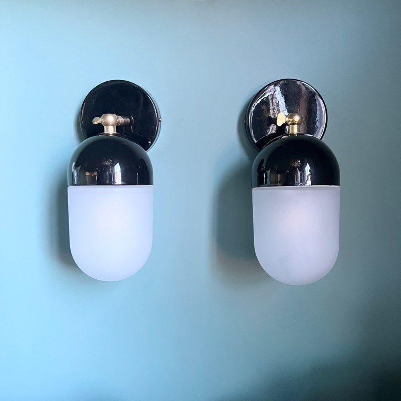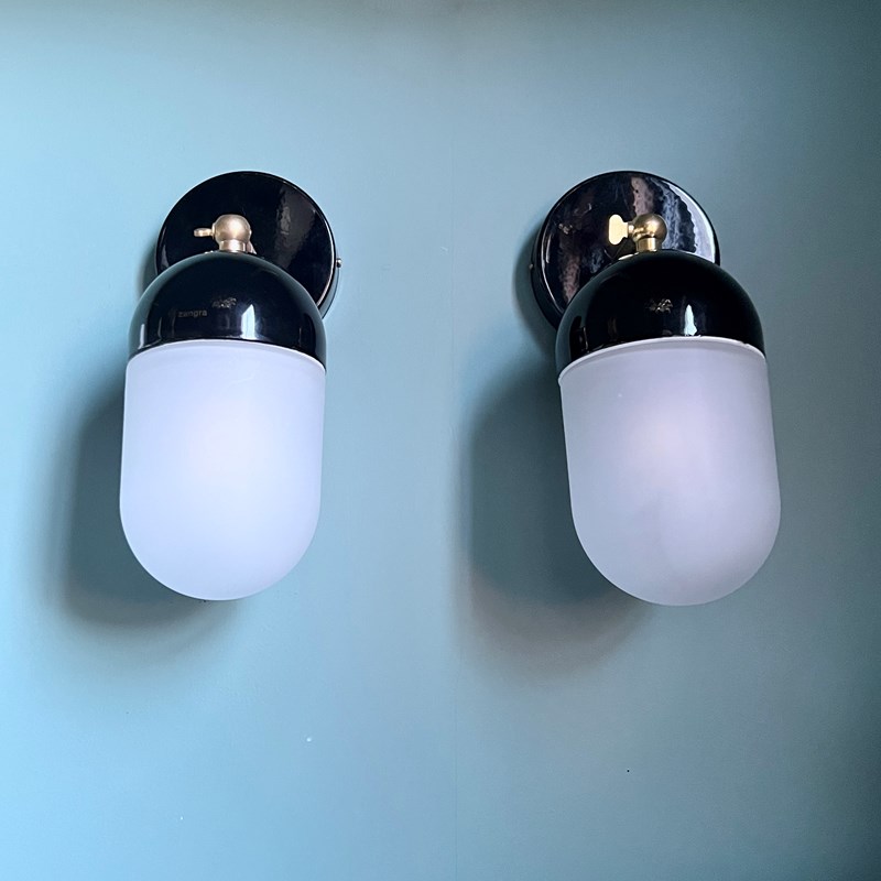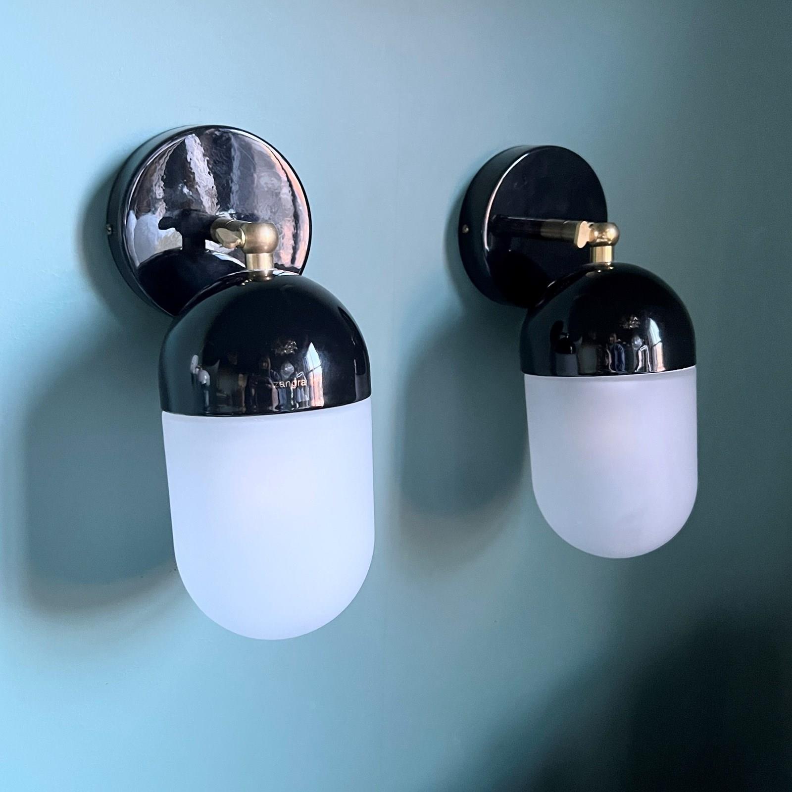 This contemporary wall light has a frosted glass enclosed shade and black porcelain fitting. The brass bar fitting is adjustable and moves through 90 degrees. These pieces are IP21 rated. The light requires one E27 bulb. This is not included.