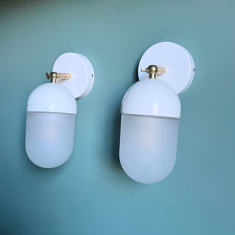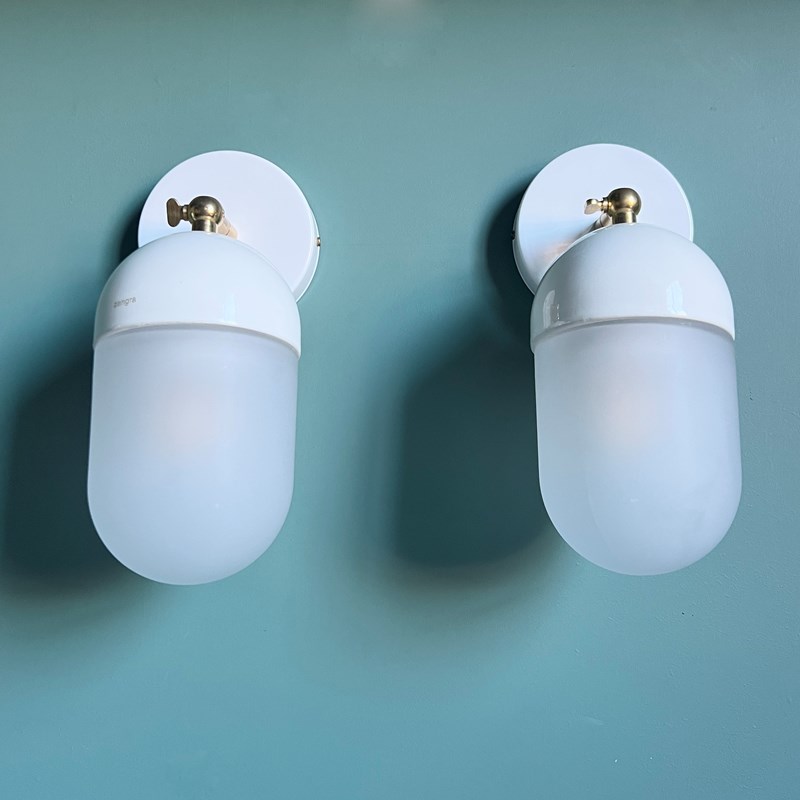 This contemporary wall light has a frosted glass enclosed shade and white porcelain fitting. The brass bar fitting is adjustable and moves through 90 degrees. These pieces are IP21 rated. The light requires one E27 bulb. This is not included.