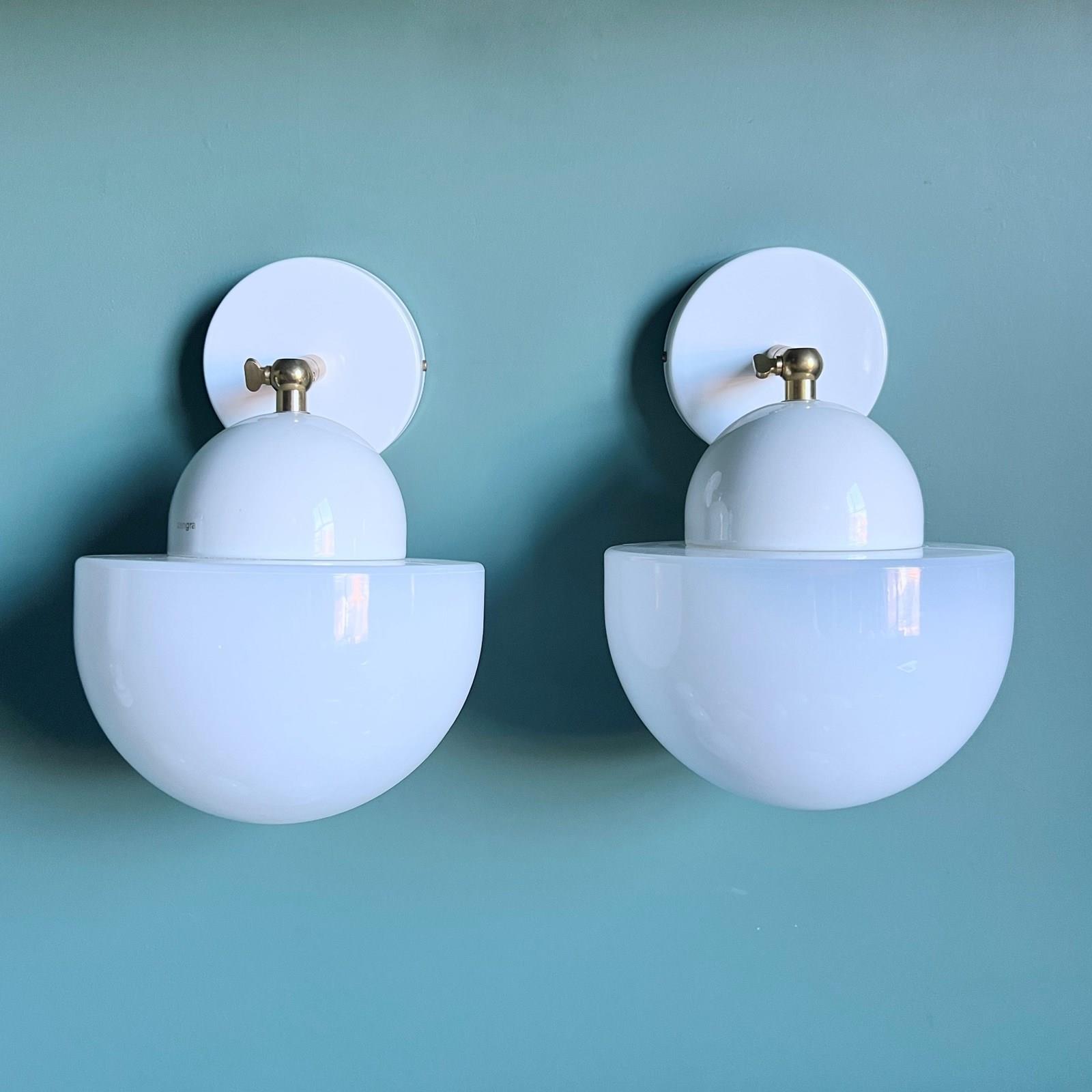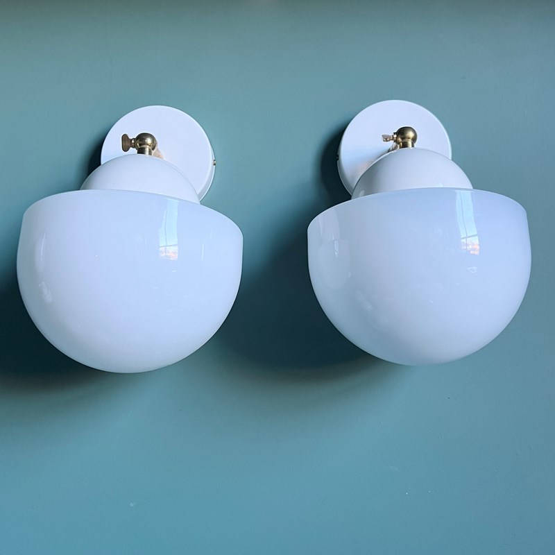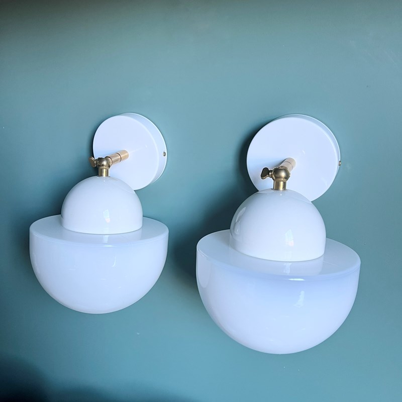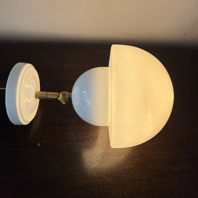 This contemporary wall light has a white polished glass domed shade and white porcelain fitting. The brass bar fitting is adjustable and moves through 90 degrees. These pieces are IP21 rated. The light requires one E27 bulb. This is not included.