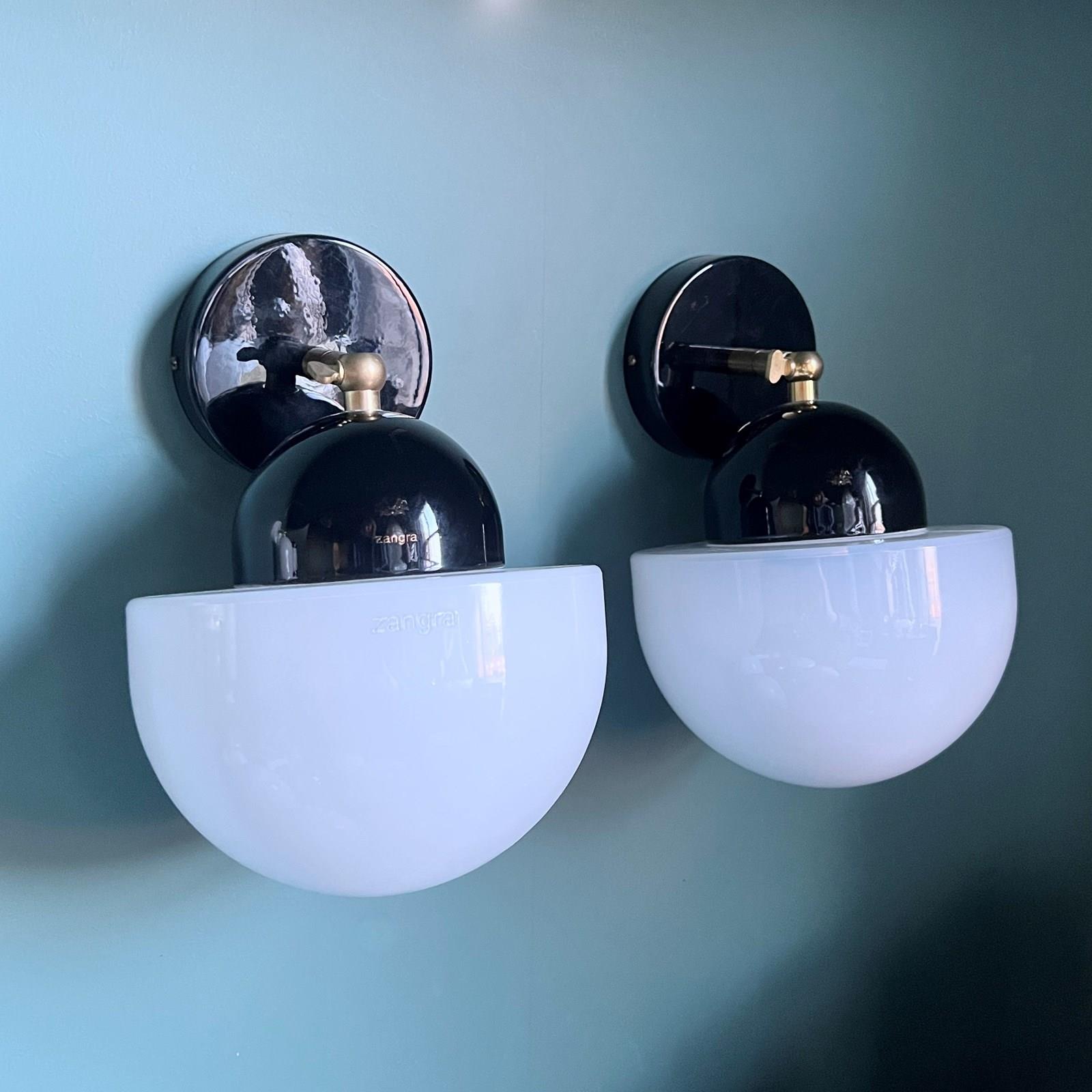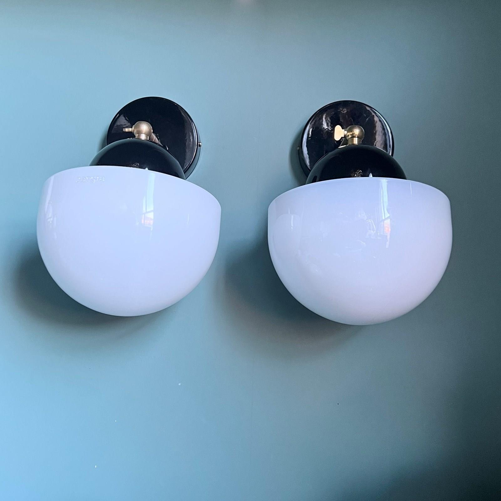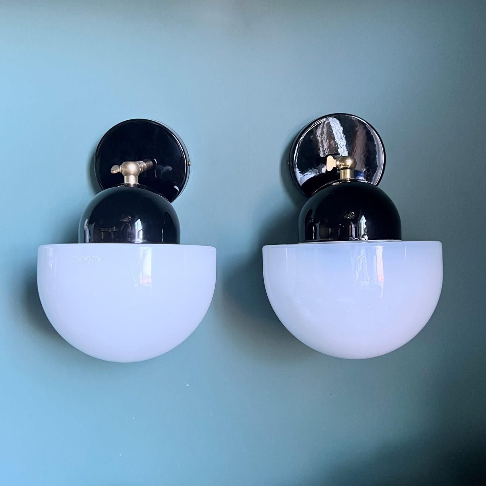 This contemporary wall light has a white polished glass domed shade and black porcelain fitting. The brass bar fitting is adjustable and moves through 90 degrees. These pieces are IP21 rated. The light requires one E27 bulb. This is not included.