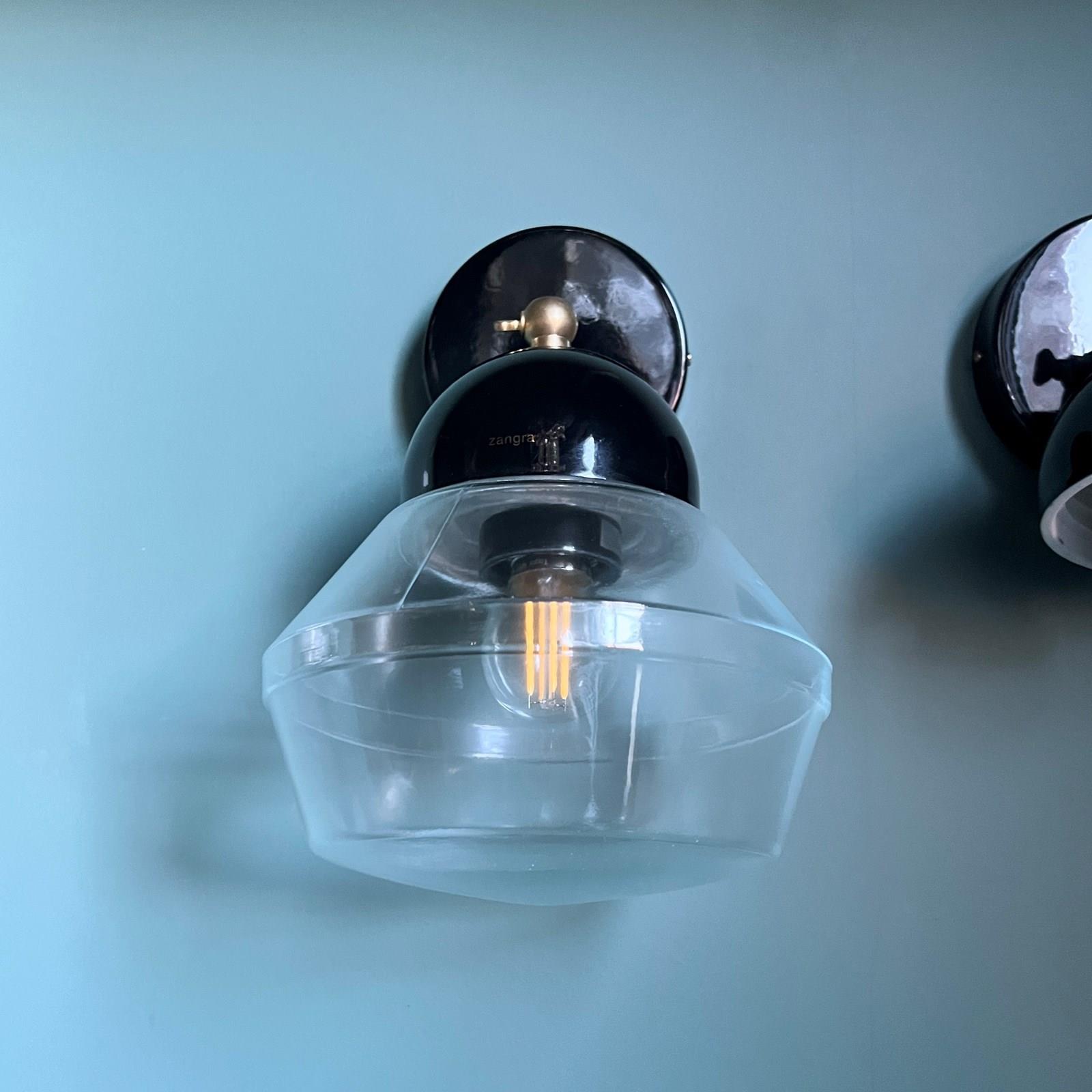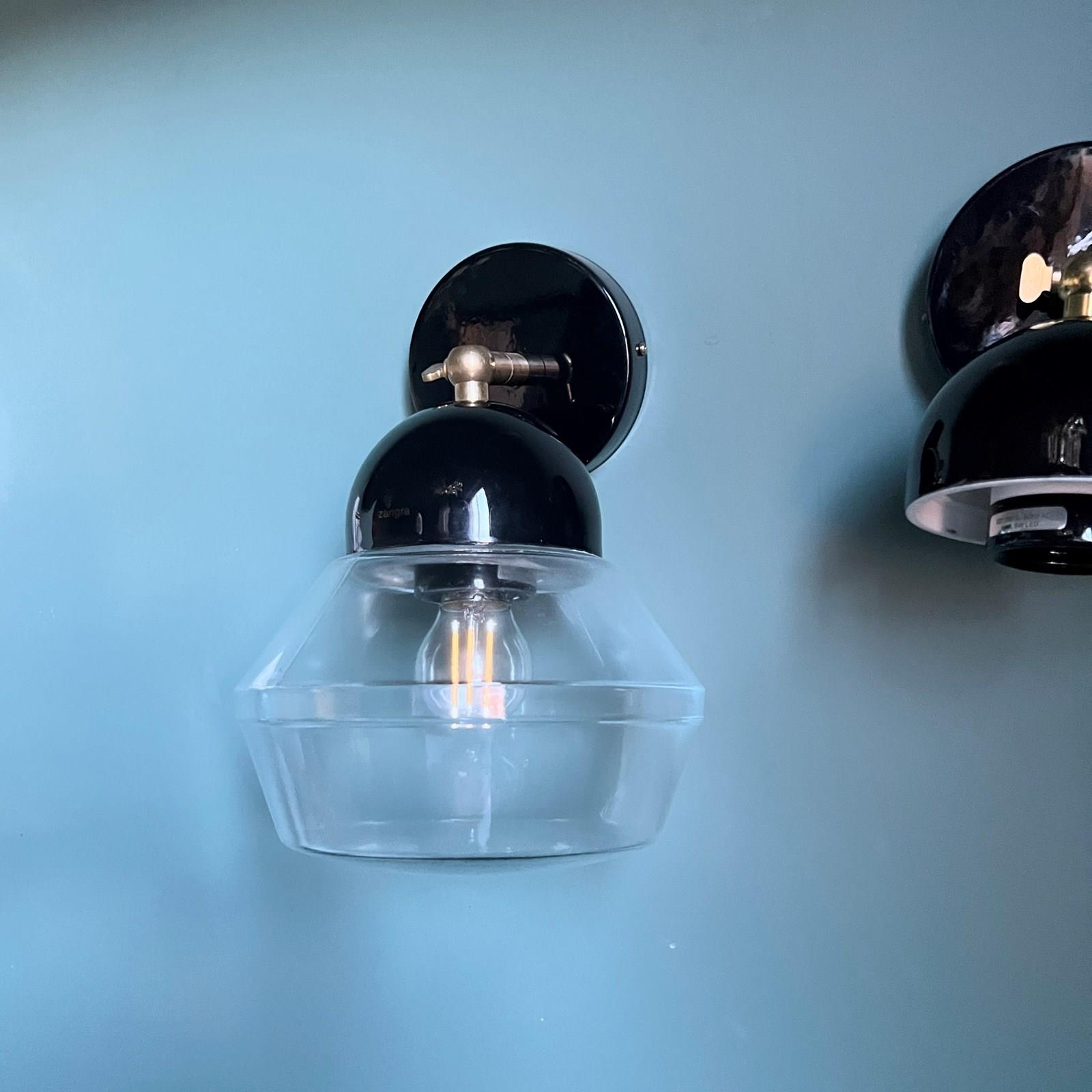 This contemporary wall light has a clear polished glass angular shade and black porcelain fitting. The brass bar fitting is adjustable and moves through 90 degrees. These pieces are IP21 rated. The light requires one E27 bulb. This is not included.