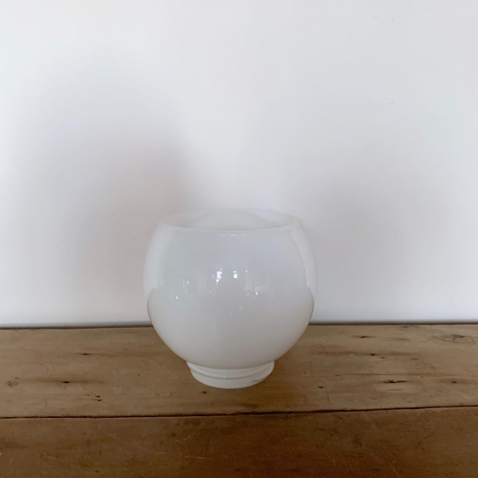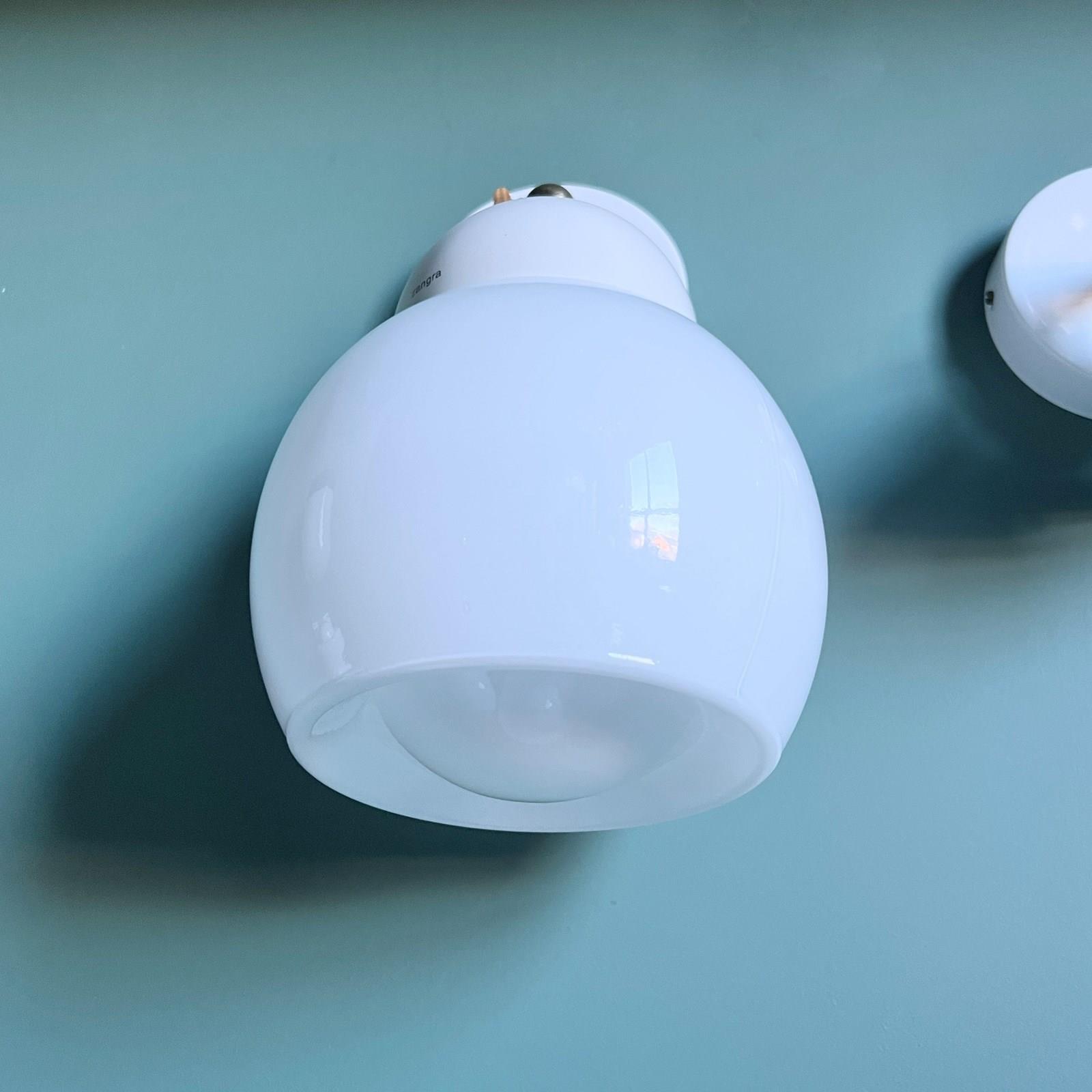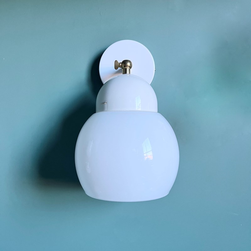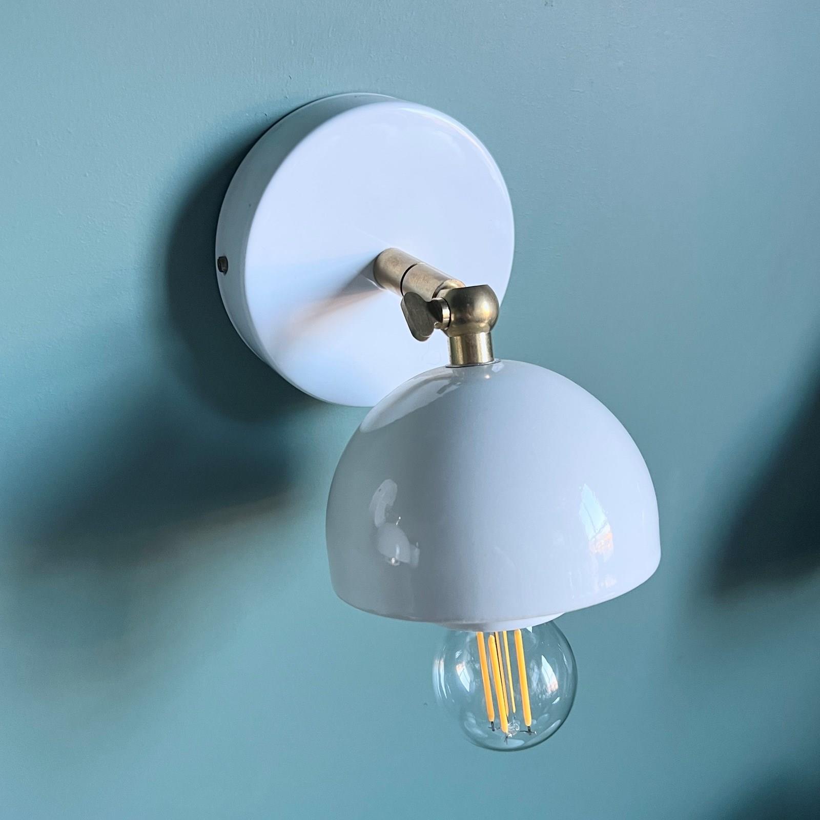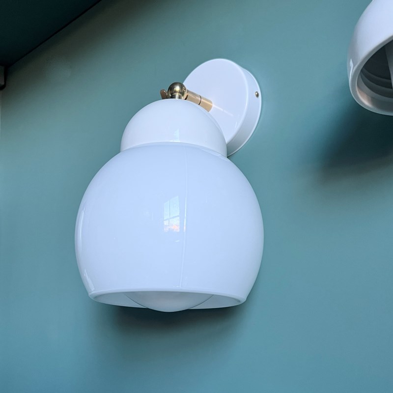 This contemporary wall light has a white polished glass inverted shade and white porcelain fitting. The brass bar fitting is adjustable and moves through 90 degrees. These pieces are IP21 rated. The light requires one E27 bulb. This is not included.