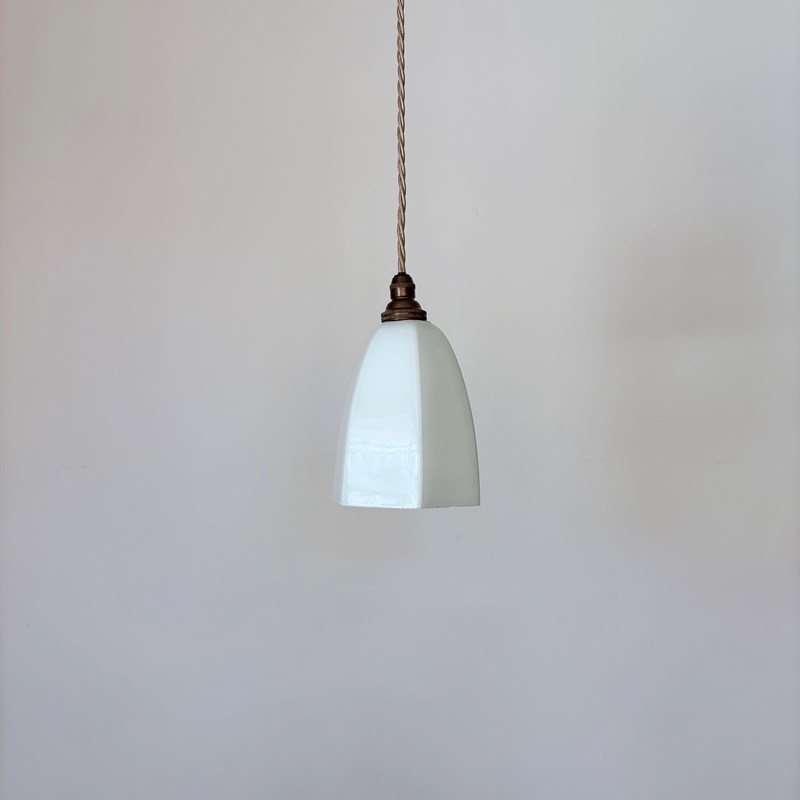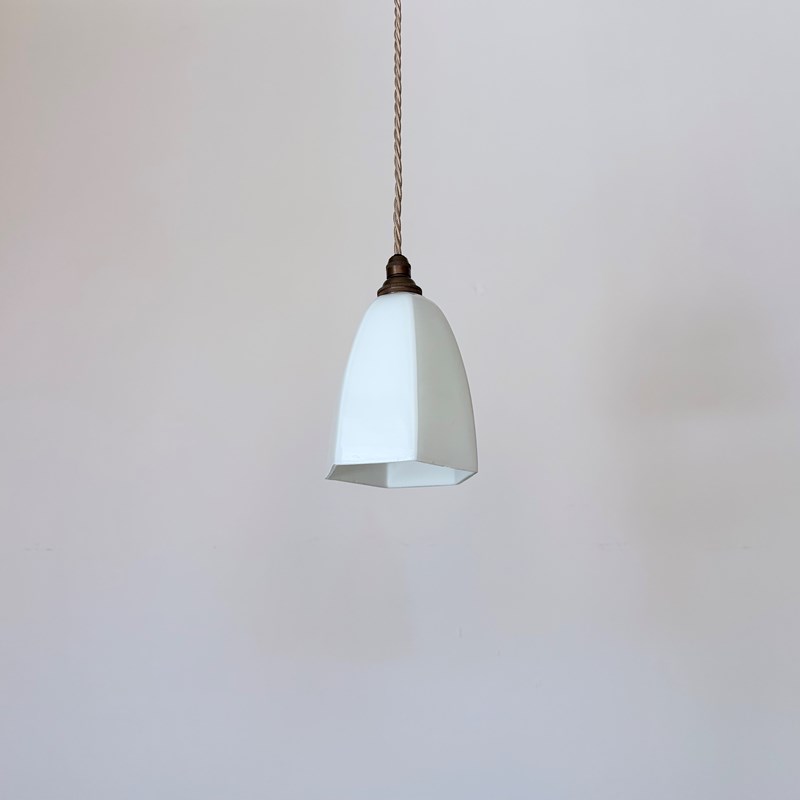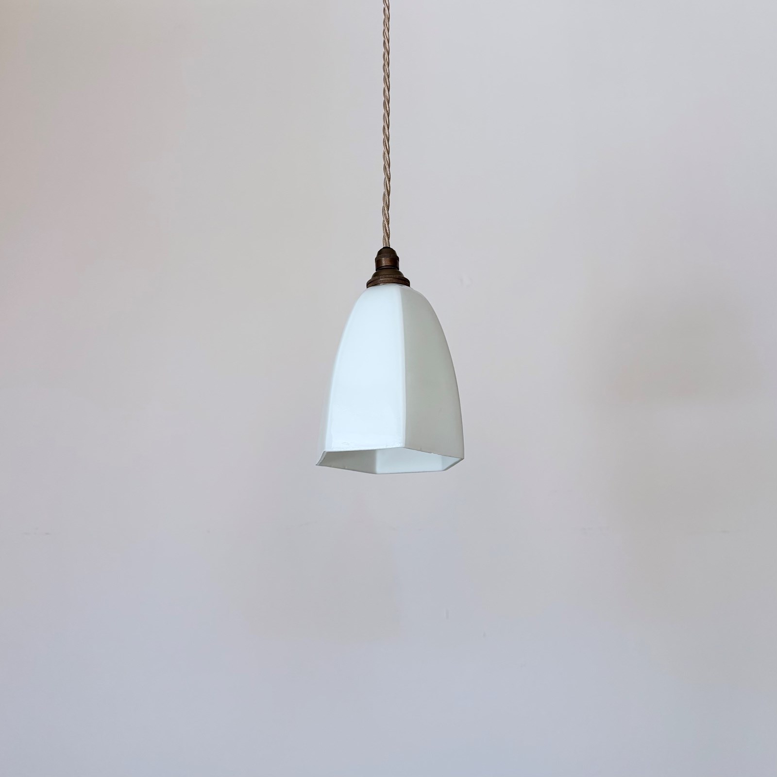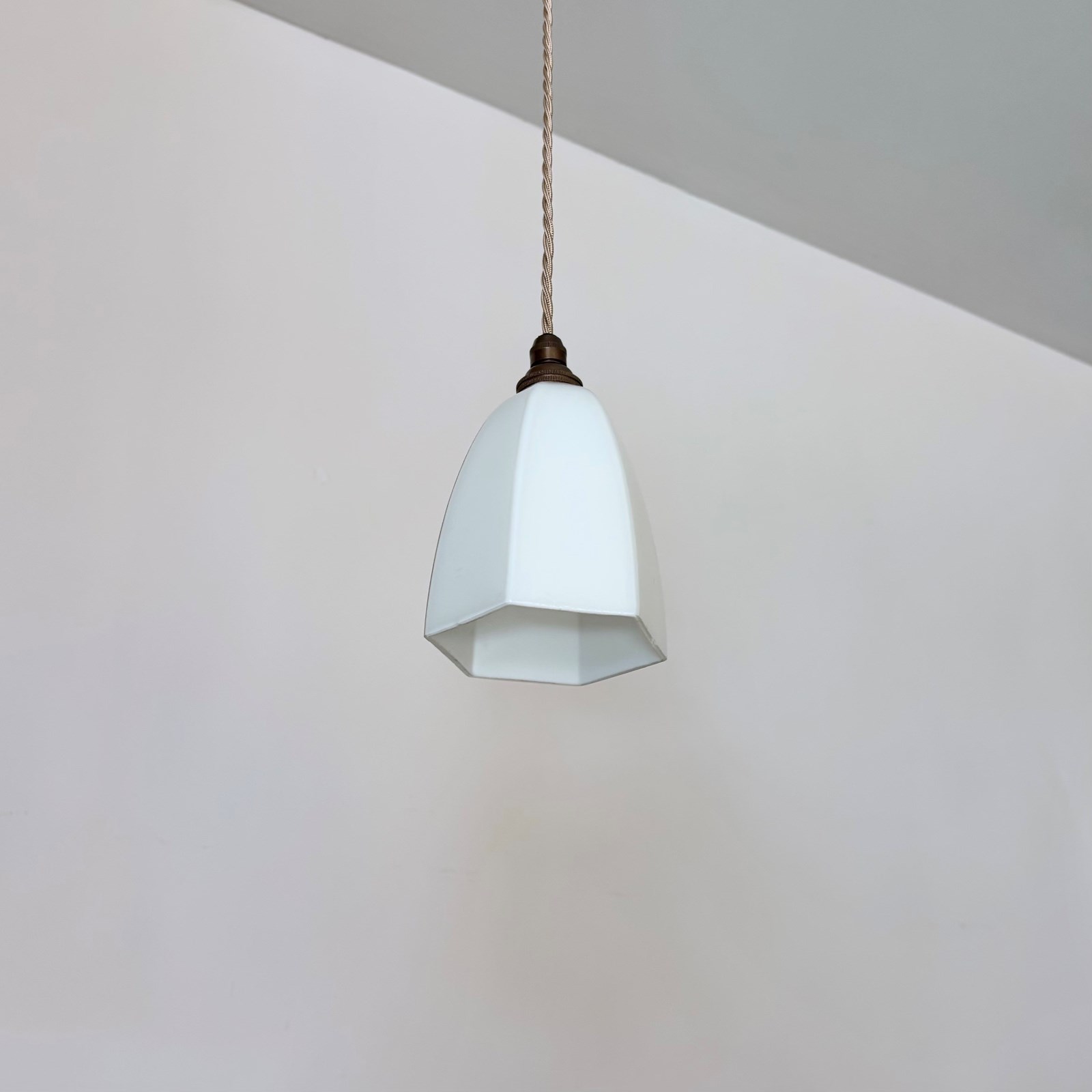 Newly made contemporary white hexagonal glass shade finished with antique brass finish fittings and pigeon pink braided cable. The coloured braided flex can be changed to your preference and a matching ceiling fitting is supplied.