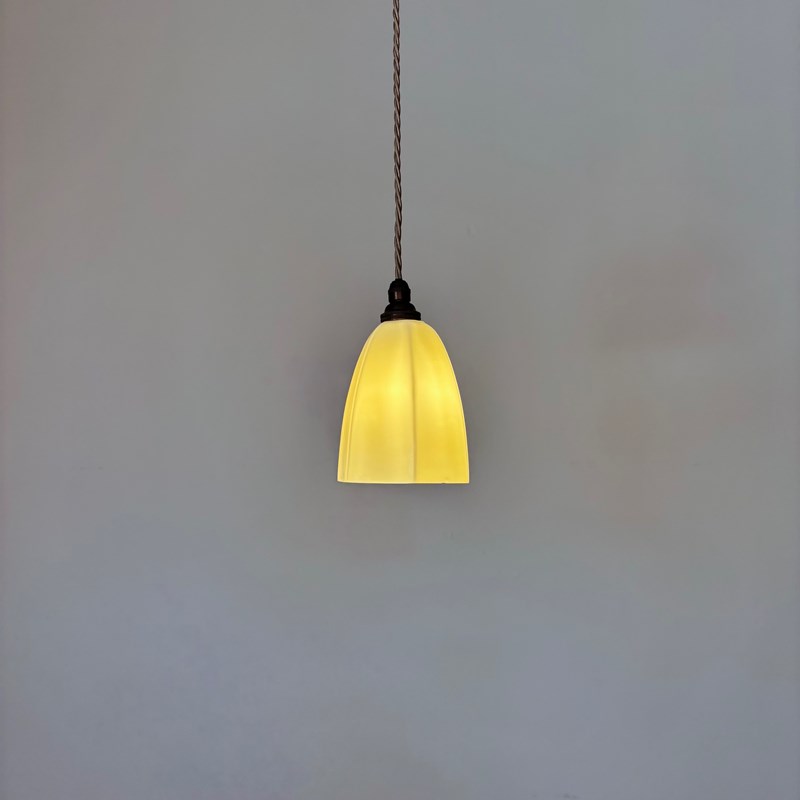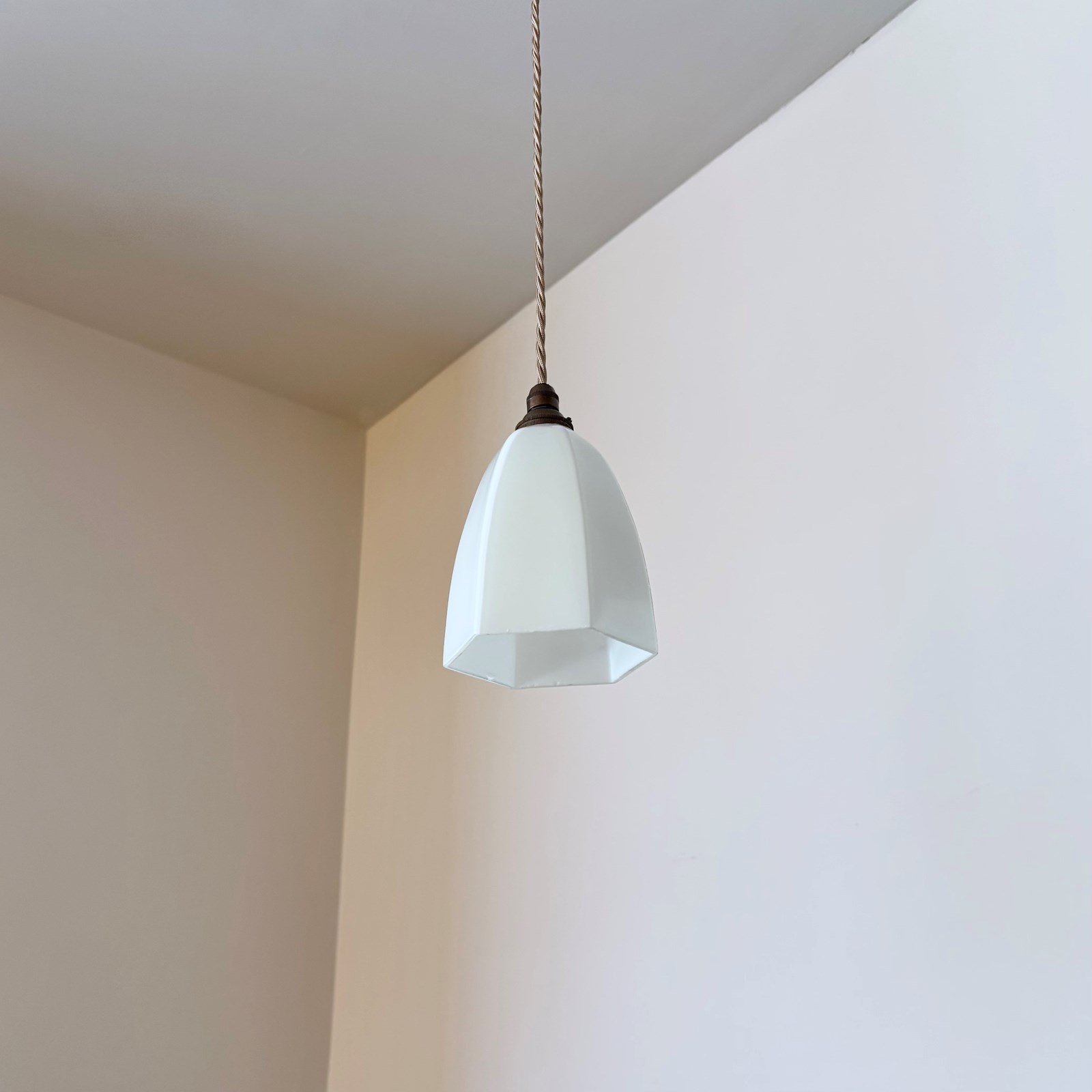 This shade has been fully rewired here, in Stockport, near Manchester by our small team of experts and is now ready to be installed. We recommend that this is installed by an electrician into a joist or a supporting noggin. To clean dust the flex and brass components regularly with a soft cloth. The glass shade can then be wiped with a glass wipe or a cloth that has been sprayed with glass cleaner. A final wipe with a paper towel will give a polished finish.