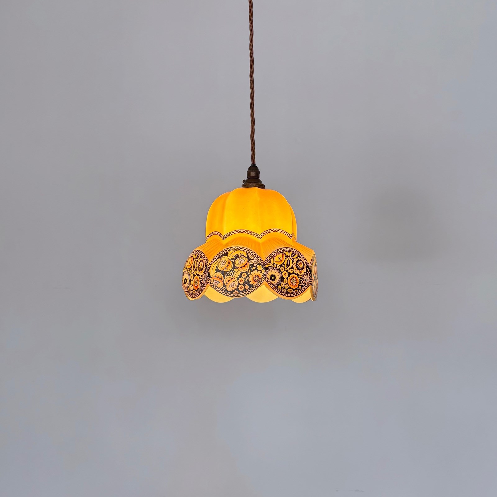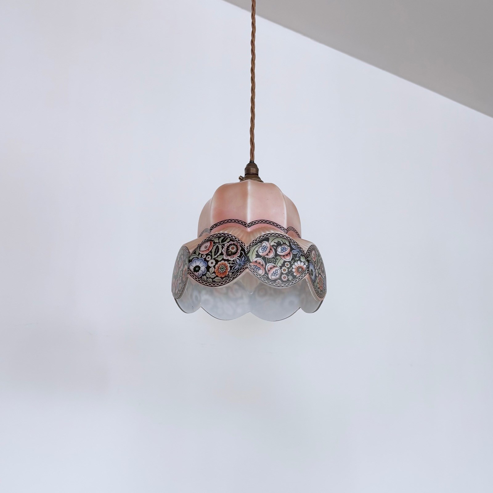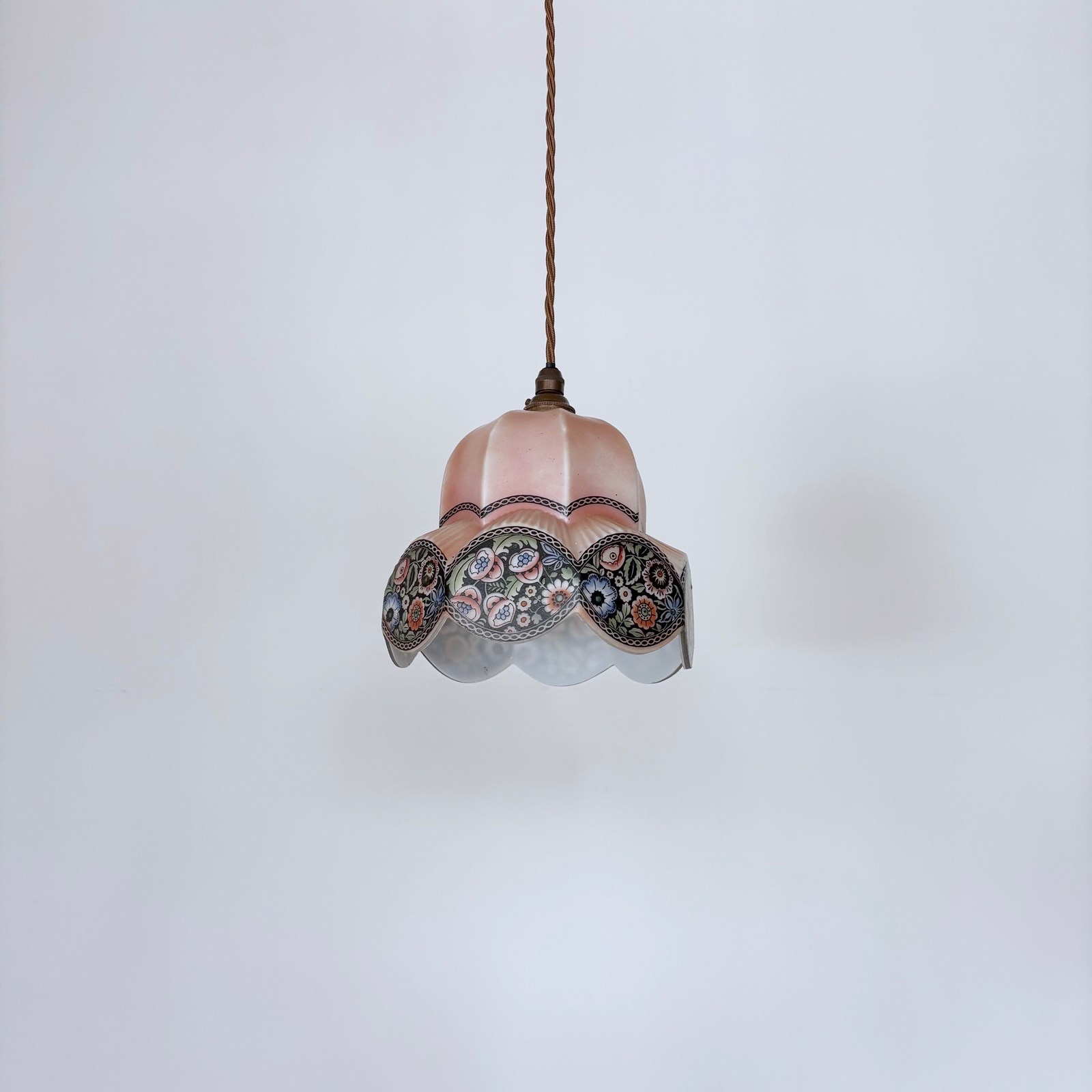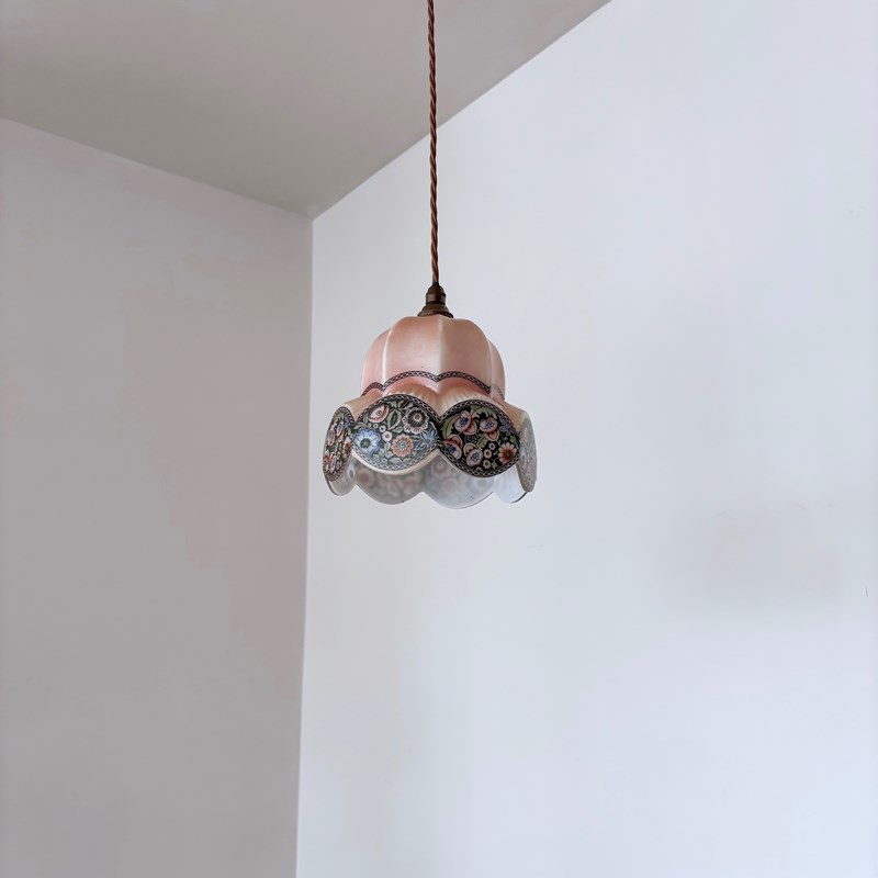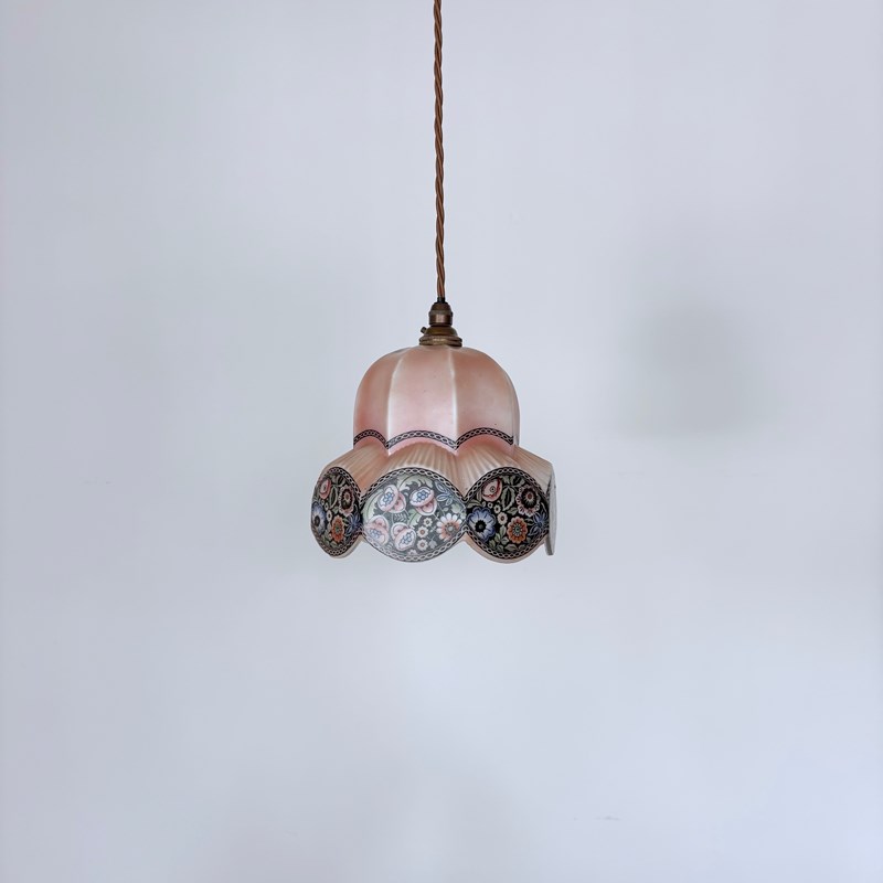 This beuatuful shade dates from the 1930s and was made in what was then called Czecho-Slovakia. Made from thick pink glass which softens when lit with a hand-painted floral motif. Rewired with an antique brass finish fitting and light brown braided flex. This shade requires one B22 lamp this is not included but can be supplied. The coloured flex can be changed to your preference and a matching ceiling fitting is supplied.