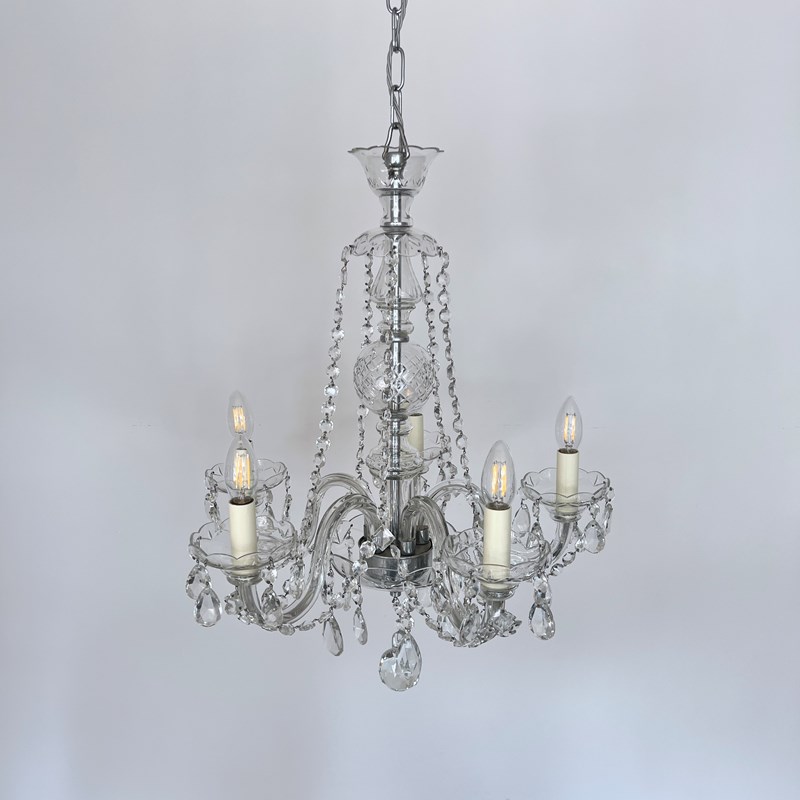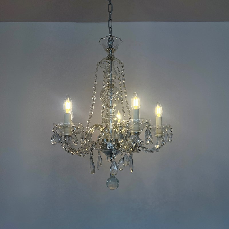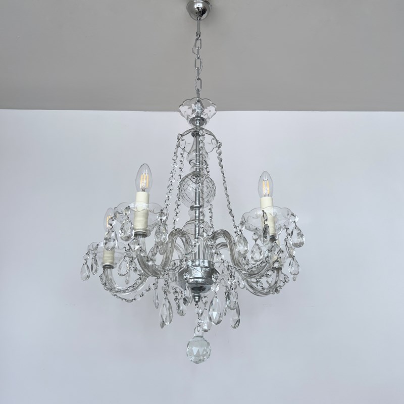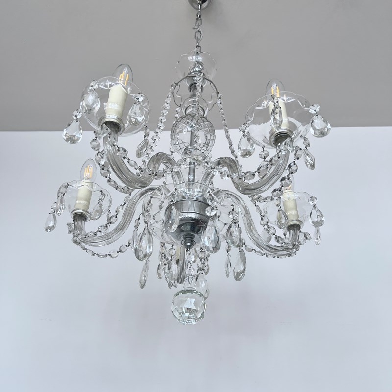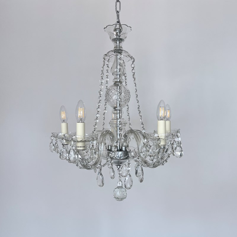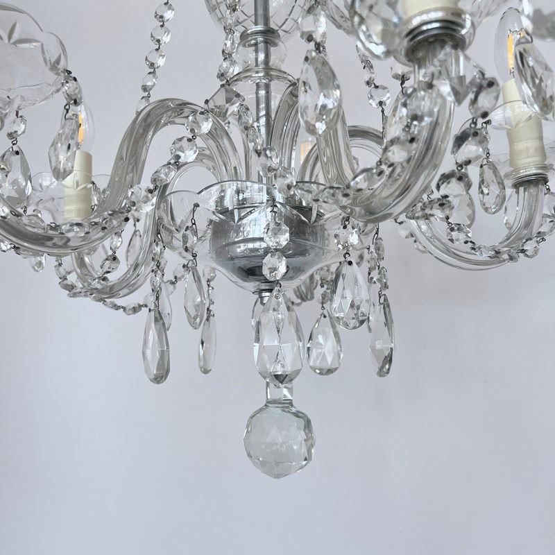 This chandelier has been fully restored and rewired here, in Stockport, near Manchester by our small team of experts and is now ready to be installed. We recommend that this small Bohemian crystal chandelier is installed by an electrician and into a joist or a supporting noggin. To clean the chandelier dust the crystal components regularly with a soft cloth. The crystal can then be wiped with a glass wipe or a cloth that has been sprayed with glass cleaner. A final wipe with a paper towel will give a polished finish.