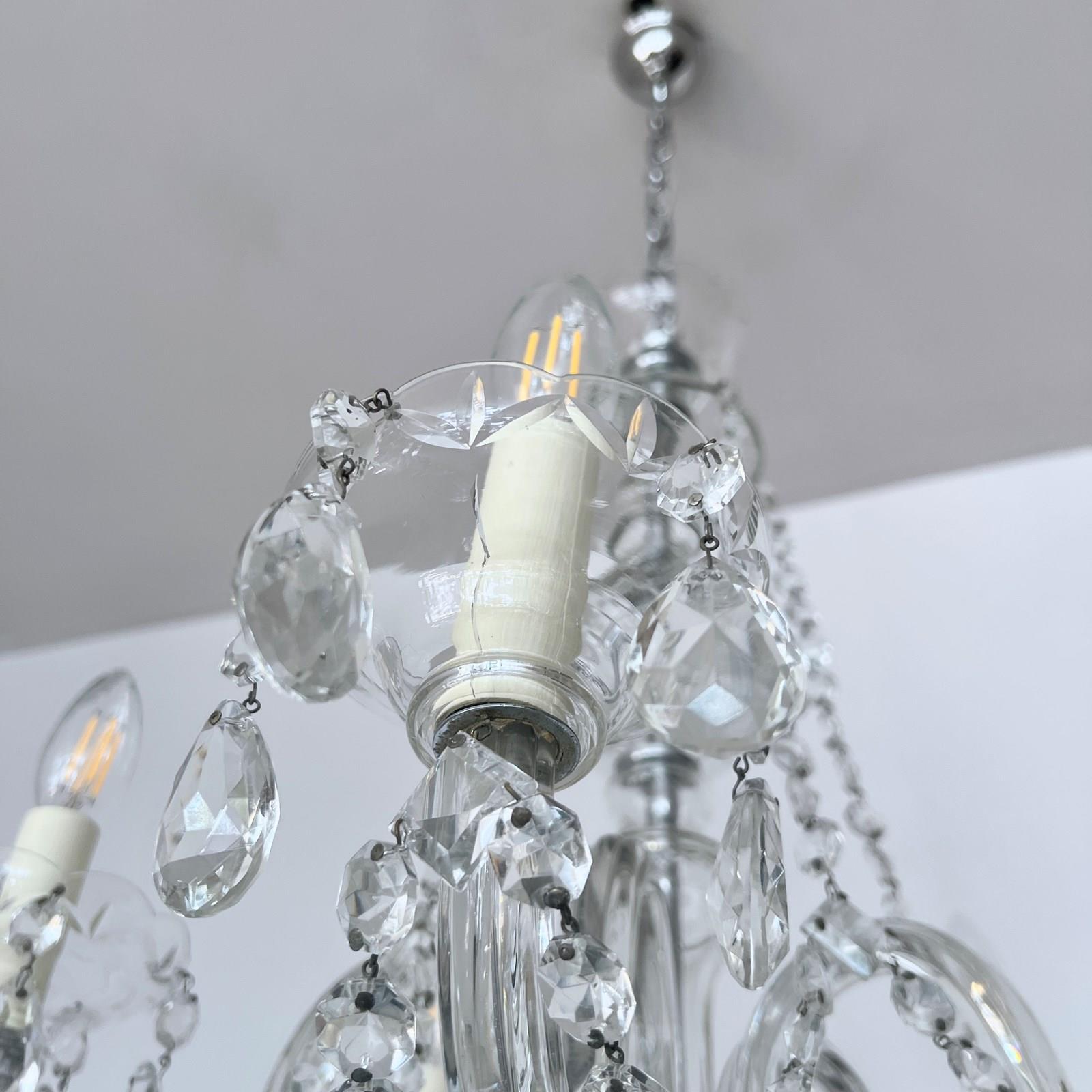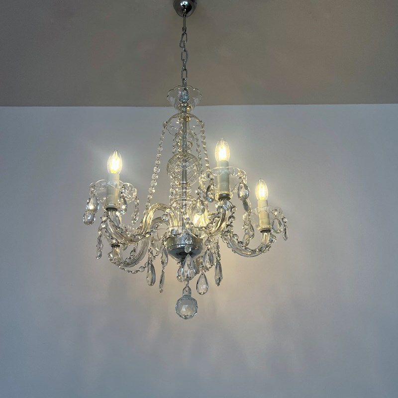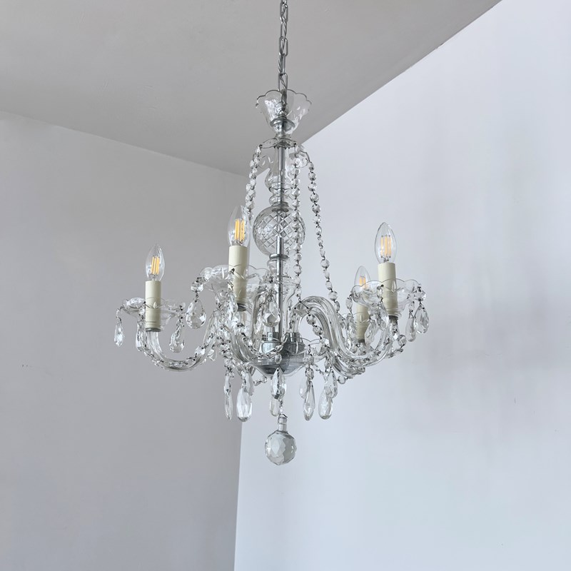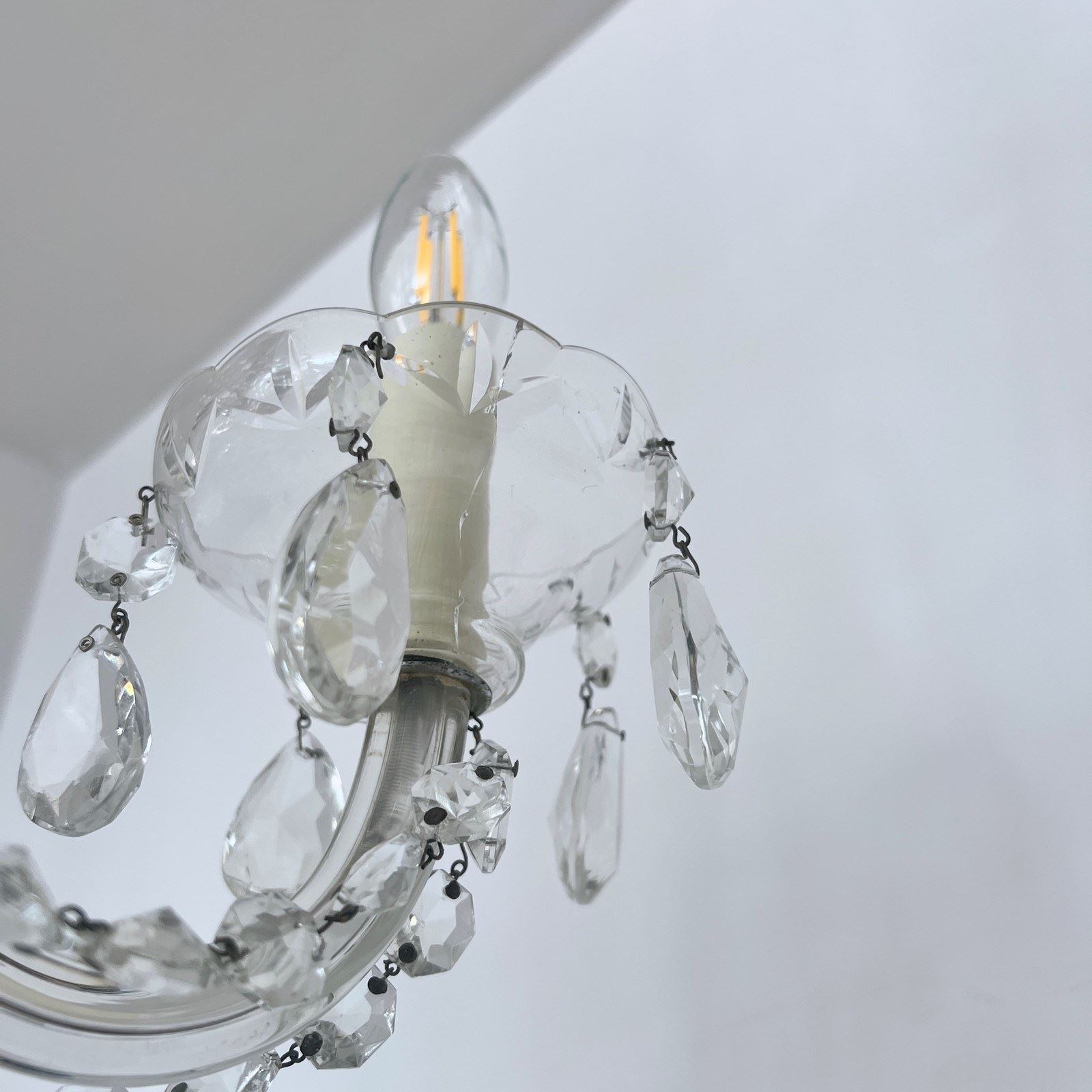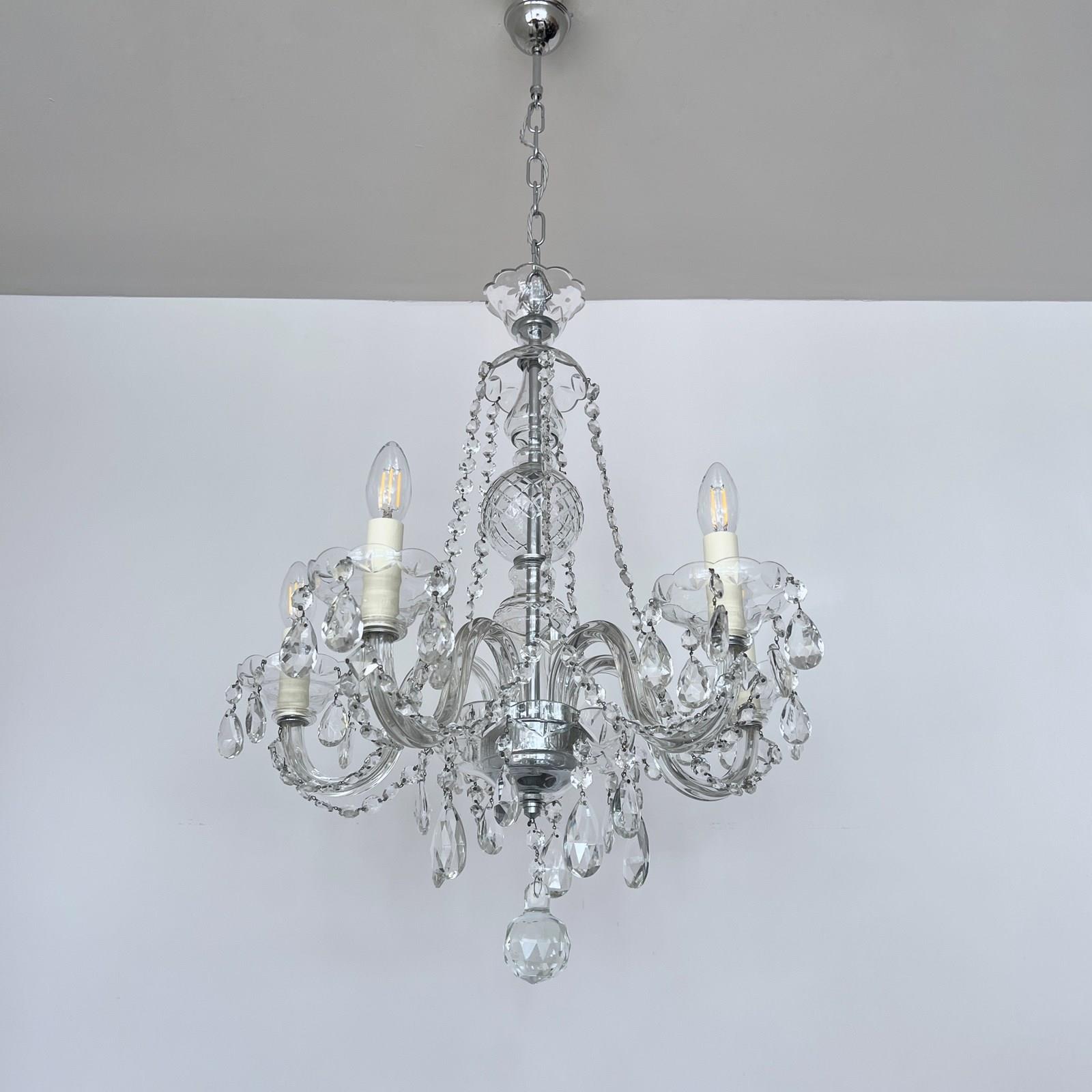 This chandelier has been fully restored and rewired here, in Stockport, near Manchester by our small team of experts and is now ready to be installed. We recommend that this small Bohemian crystal chandelier is installed by an electrician and into a joist or a supporting noggin. To clean the chandelier dust the crystal components regularly with a soft cloth. The crystal can then be wiped with a glass wipe or a cloth that has been sprayed with glass cleaner. A final wipe with a paper towel will give a polished finish.