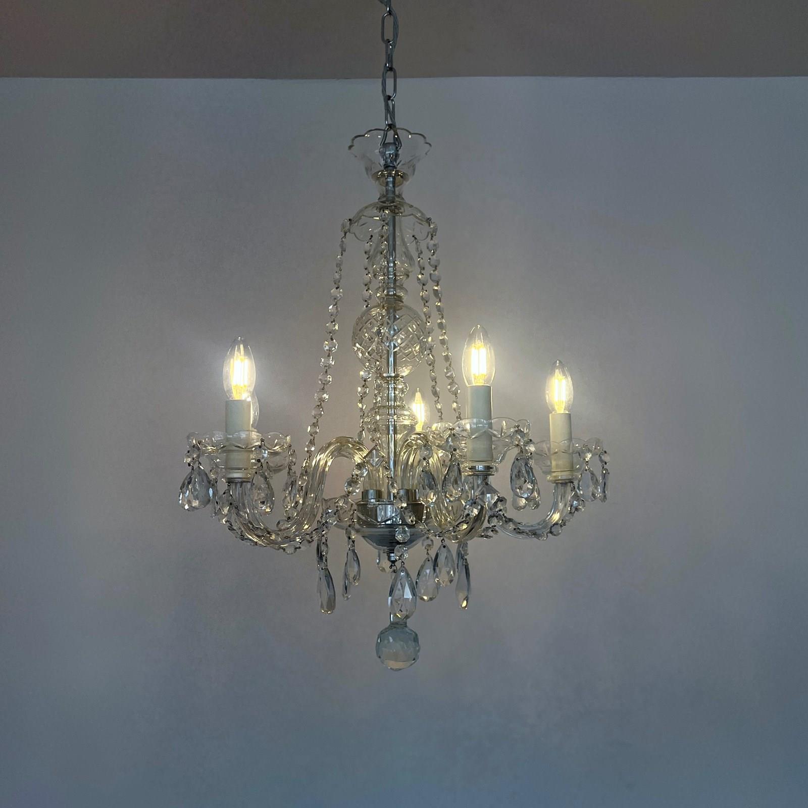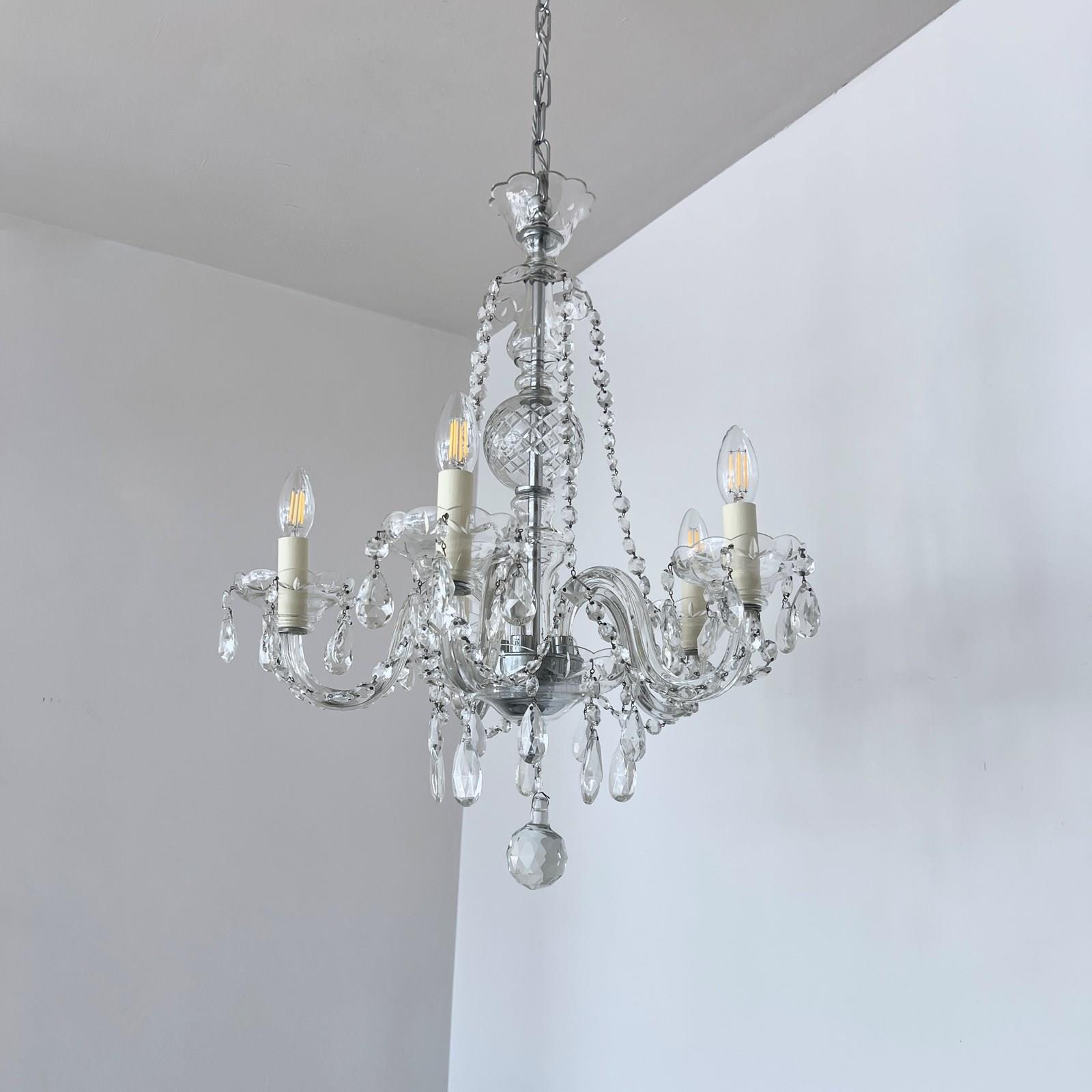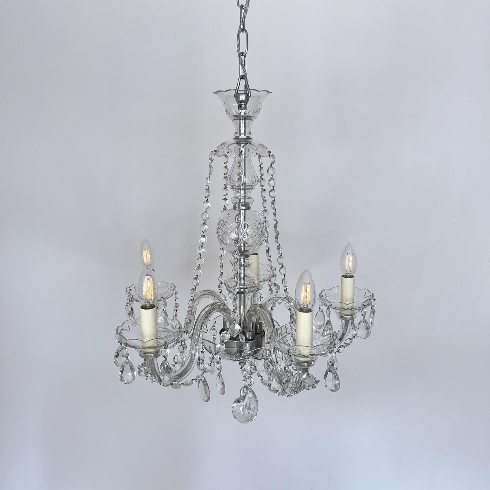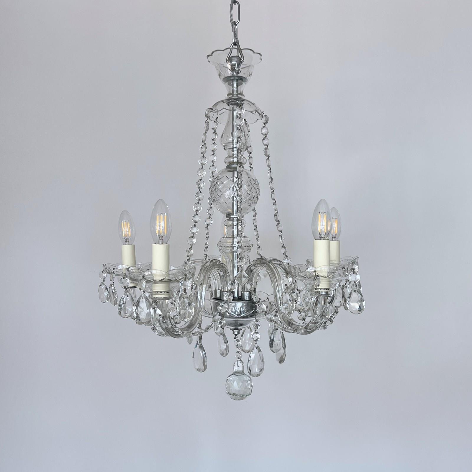 This Bohemian crystal chandelier originates from the 1930s Czechoslovakia. It’s five elegant crystal swan neck arms each hold a lamp. Retaining its original crystal drops it is dressed in unique cut crystal pear drops with crystal buttons. The chandelier comes supplied with braided flex and chain, ceiling rose and a chandelier hook plate. Chandelier requires SES lamps, these are not included but can be supplied.