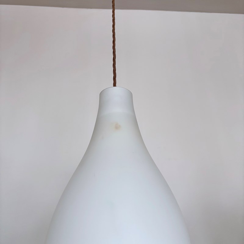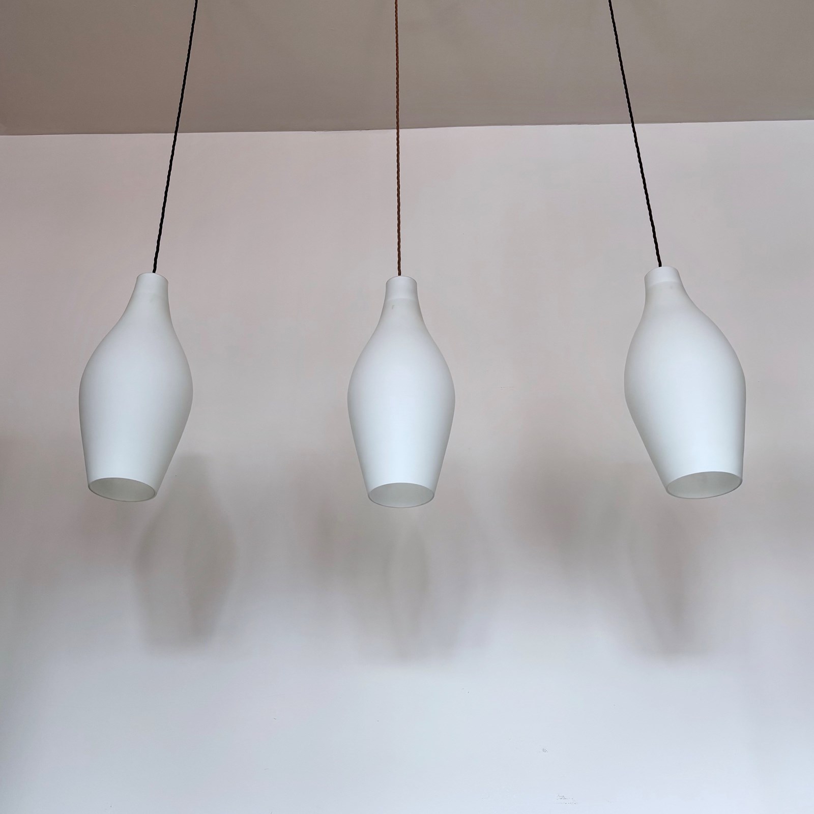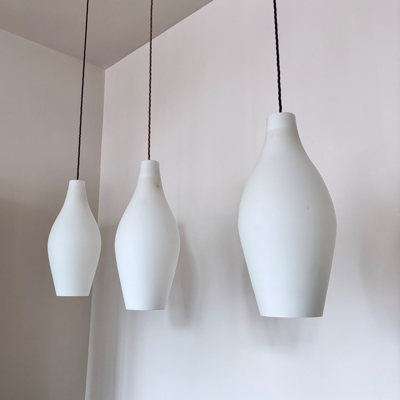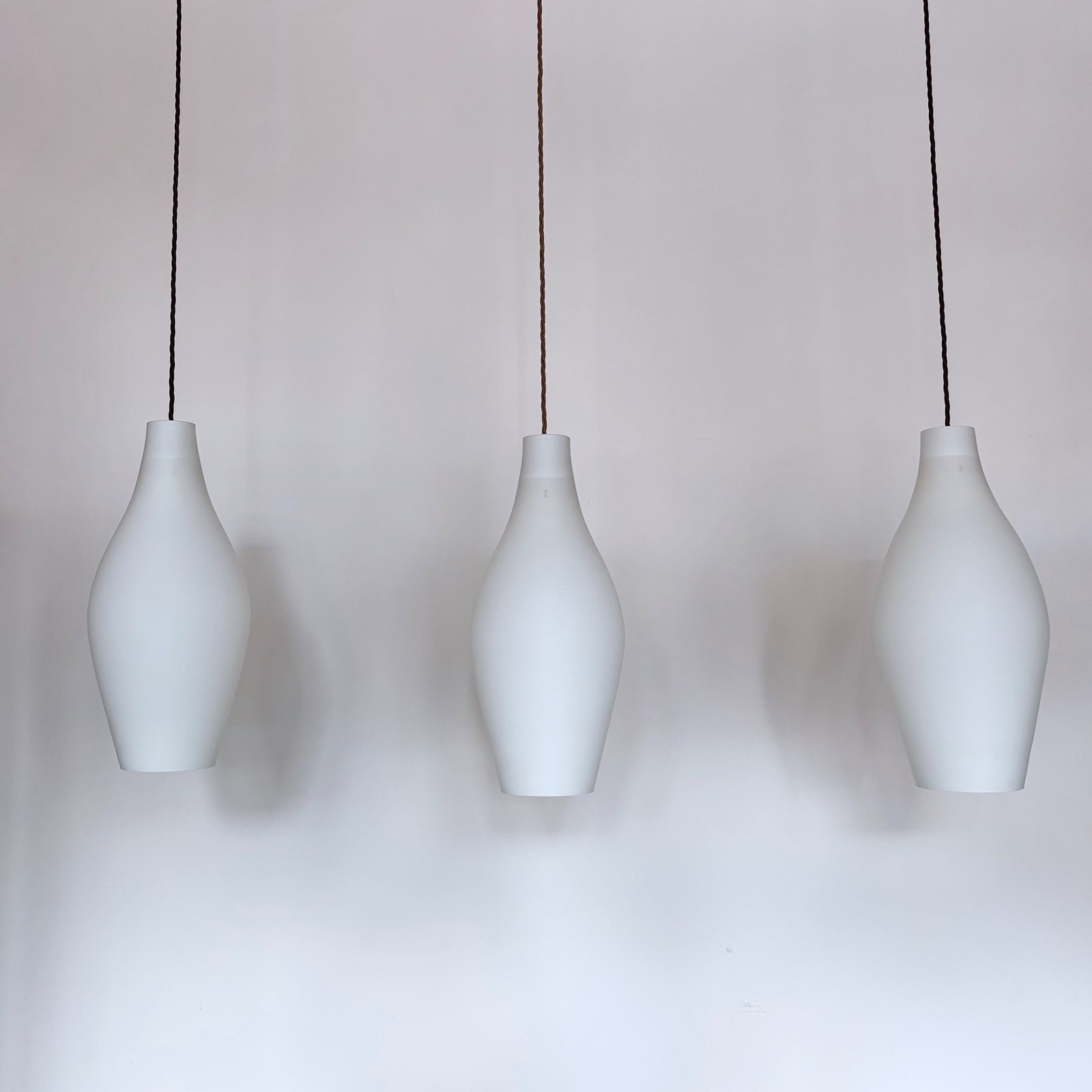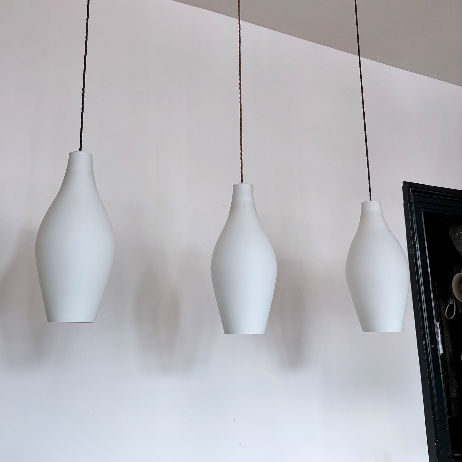 Three white danish shades. The pieces all feature small marks constant with age and use. Please see images. Newly wired with braided cable and a new internal brass lamp holder. Each pendant requires an E27 lamp. This is not included. Priced individually. Available to purchase individually or as a set. Ceiling fitting supplied. Braided cable colour can be changed to your preference.