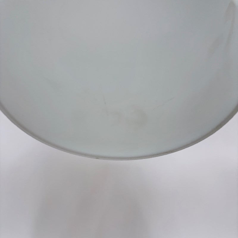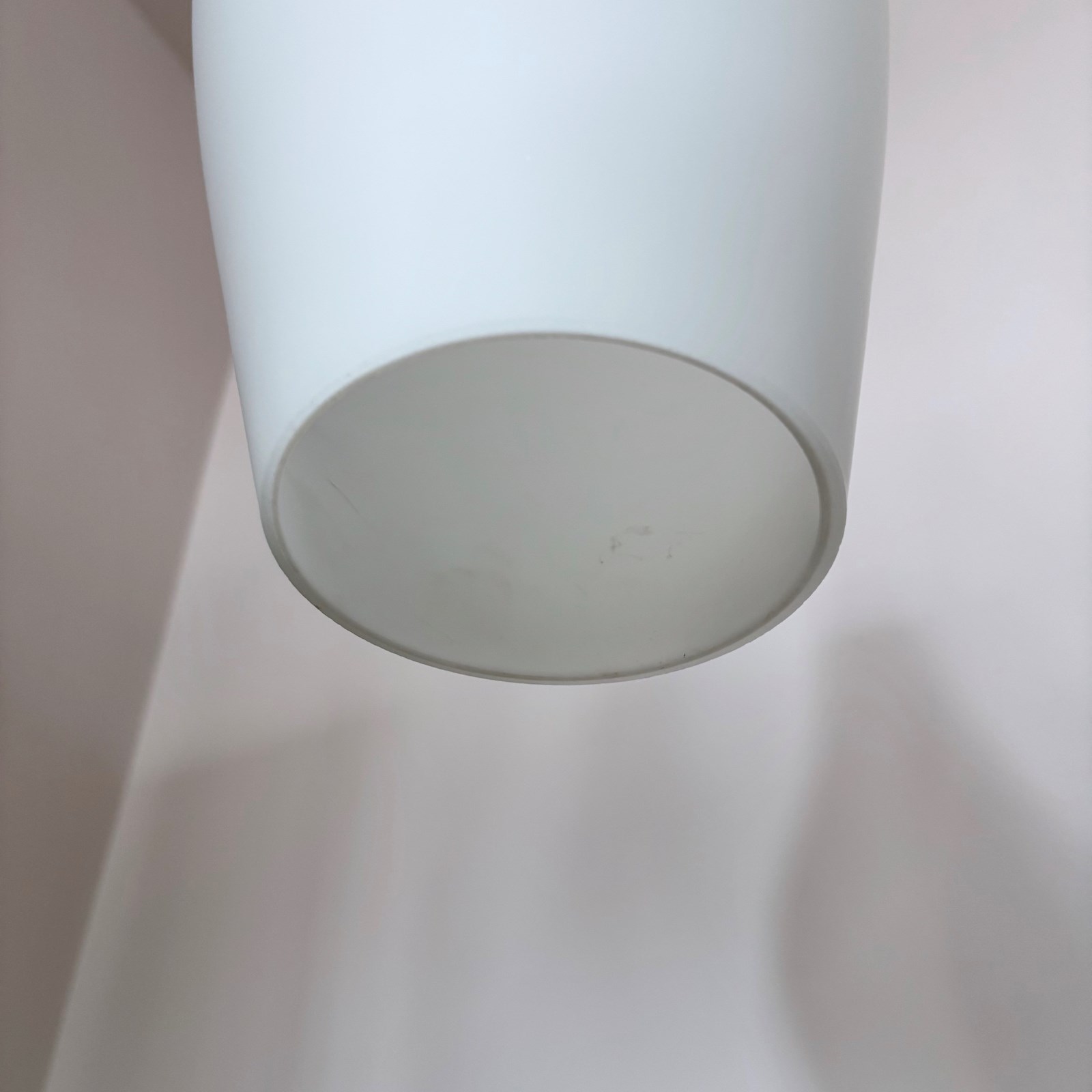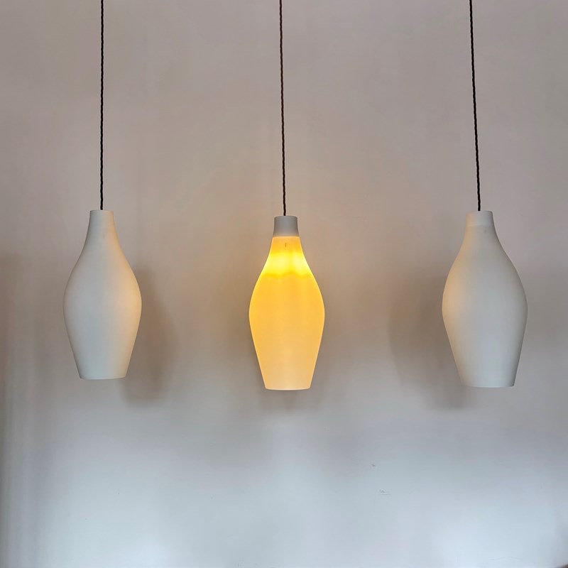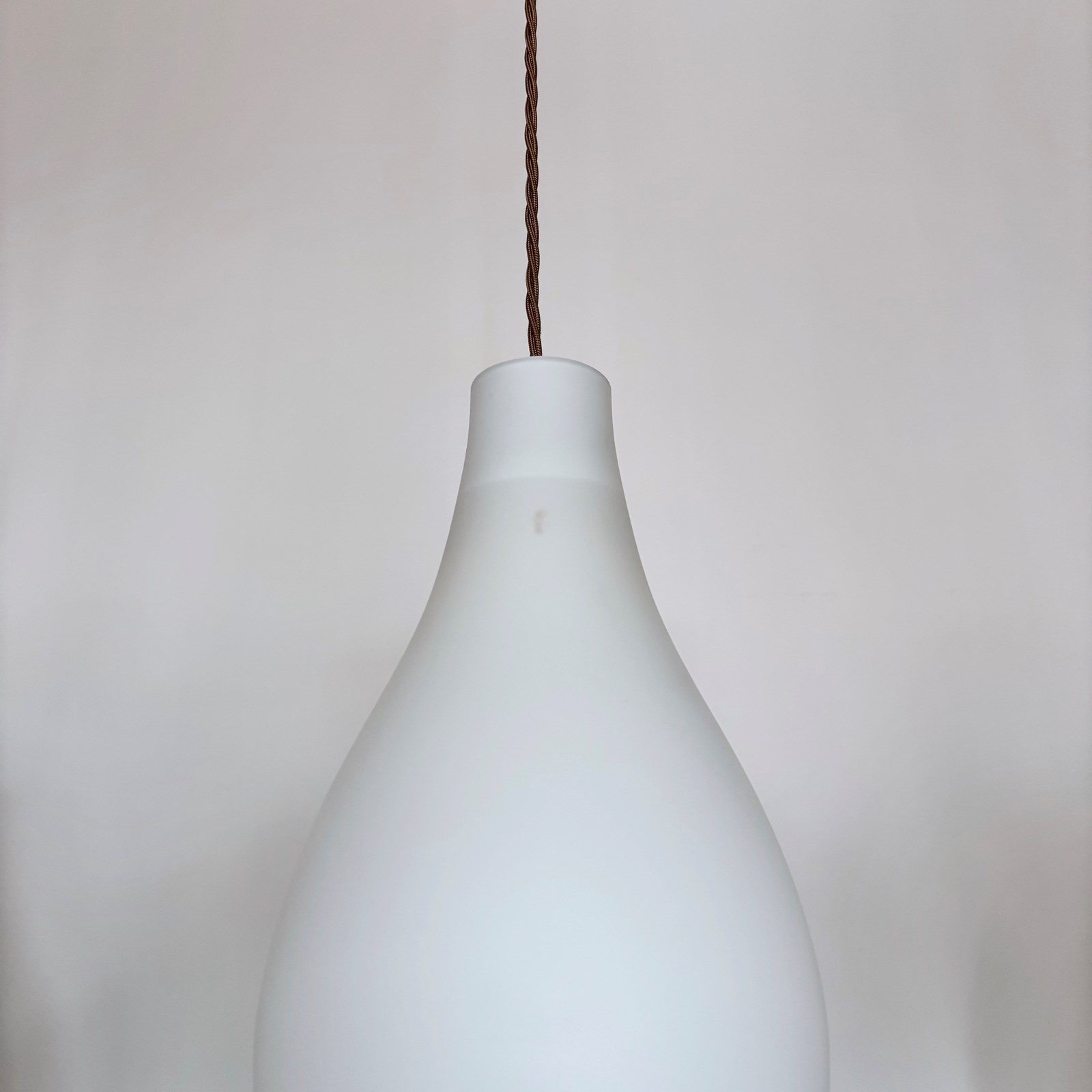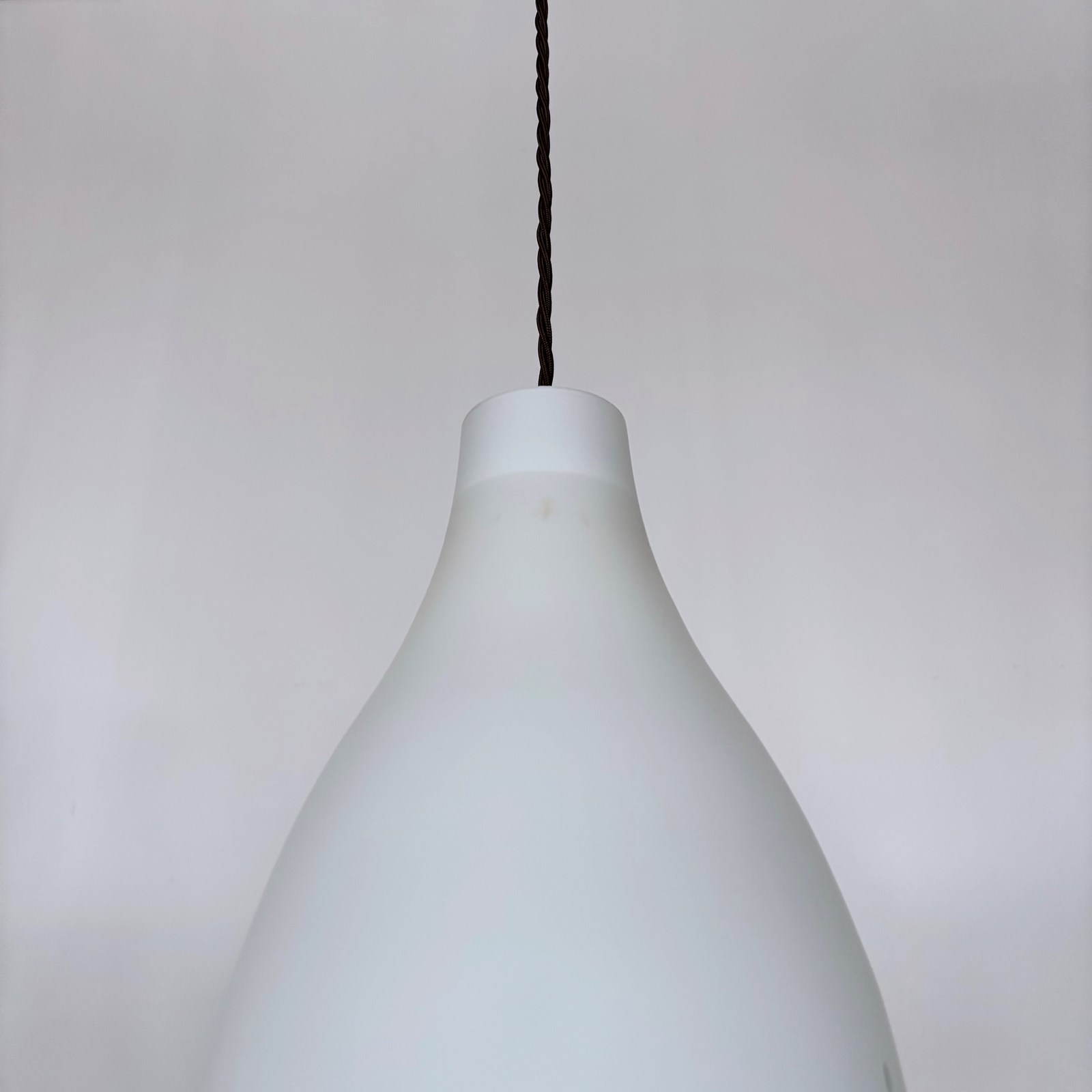 Three white danish shades. The pieces all feature small marks constant with age and use. Please see images. Newly wired with braided cable and a new internal brass lamp holder. Each pendant requires an E27 lamp. This is not included. Priced individually. Available to purchase individually or as a set. Ceiling fitting supplied. Braided cable colour can be changed to your preference.