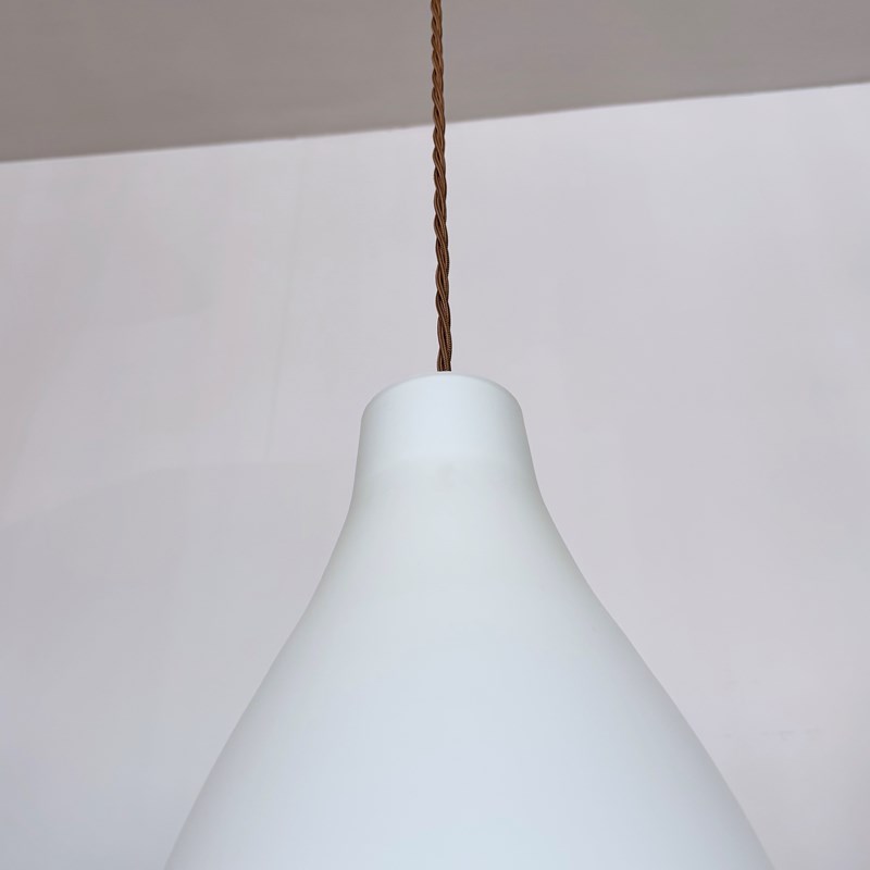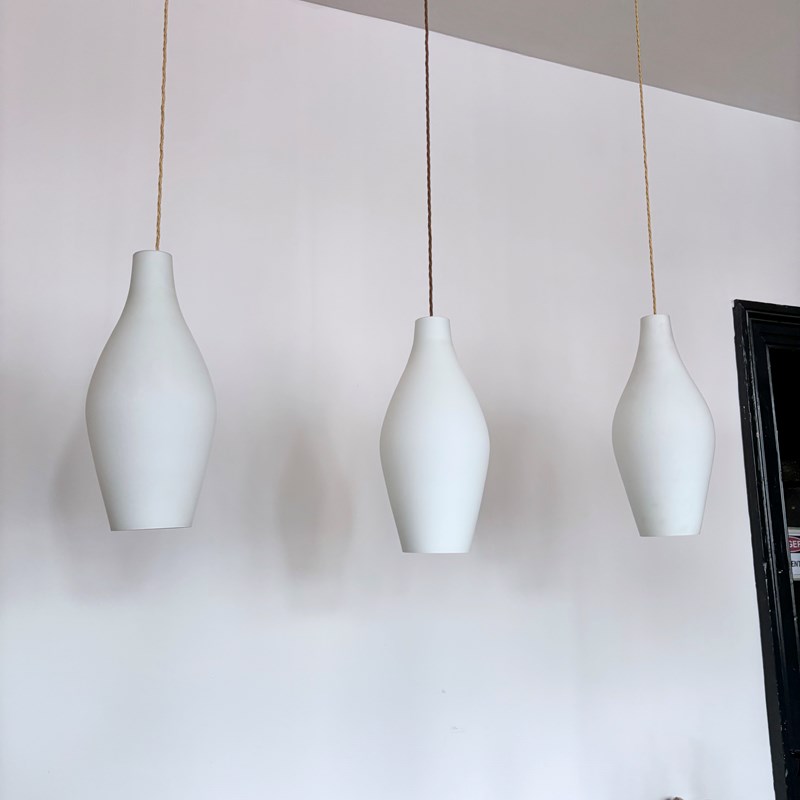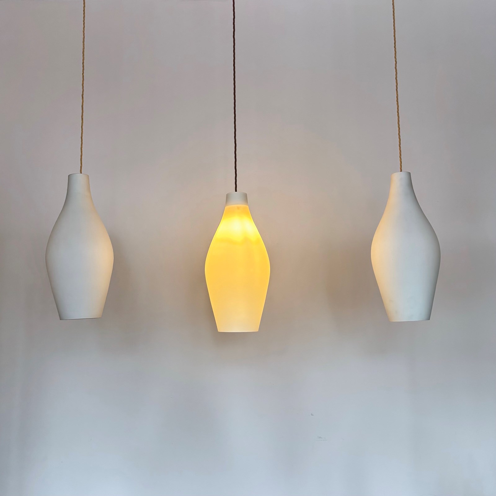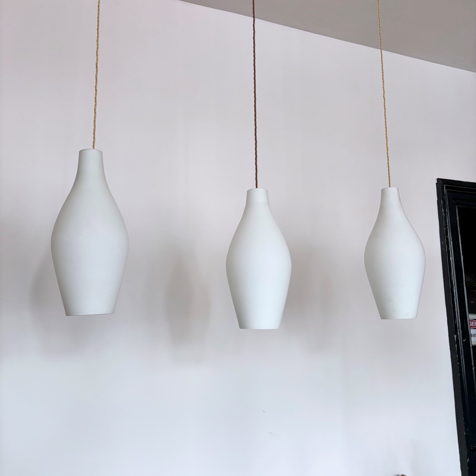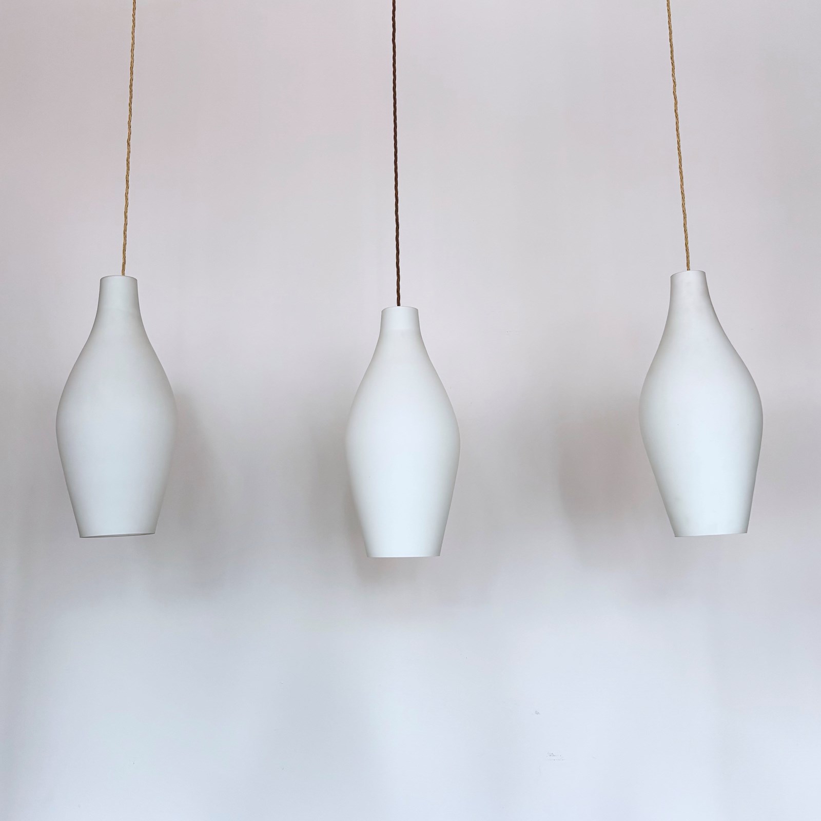 Three white danish shades. The pieces all feature small marks constant with age and use. Please see images. Newly wired with braided cable and a new internal brass lamp holder. Each pendant requires an E27 lamp. This is not included. Priced individually. Available to purchase individually or as a set. Ceiling fitting supplied. Braided cable colour can be changed to your preference.