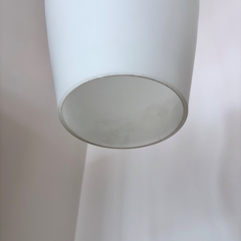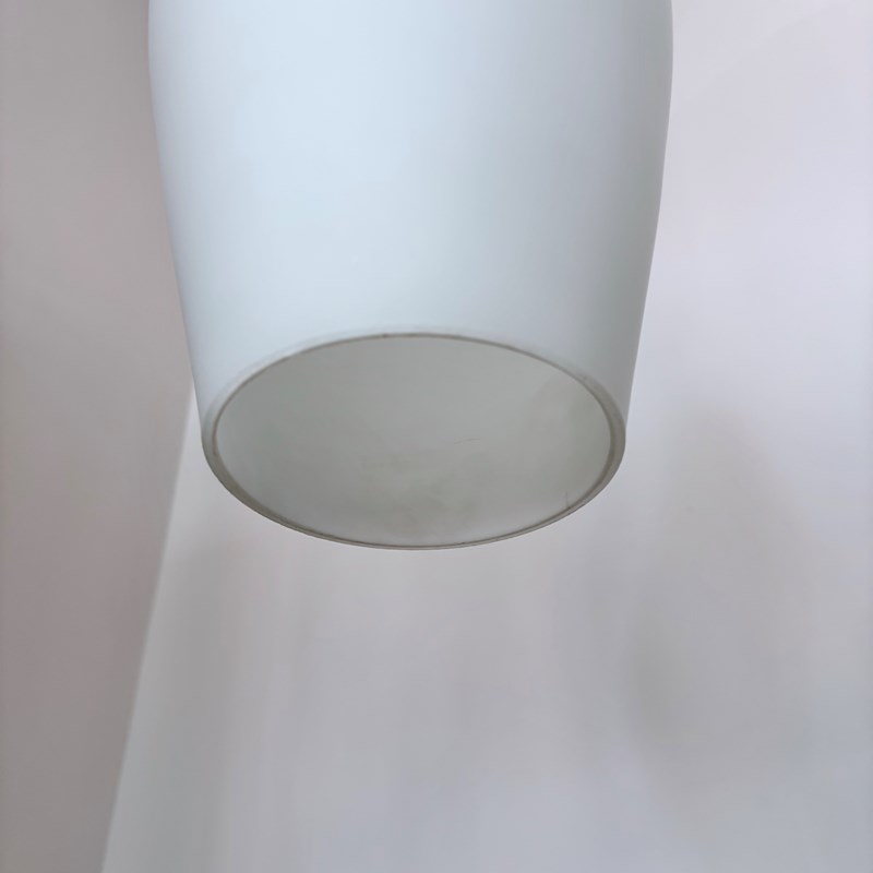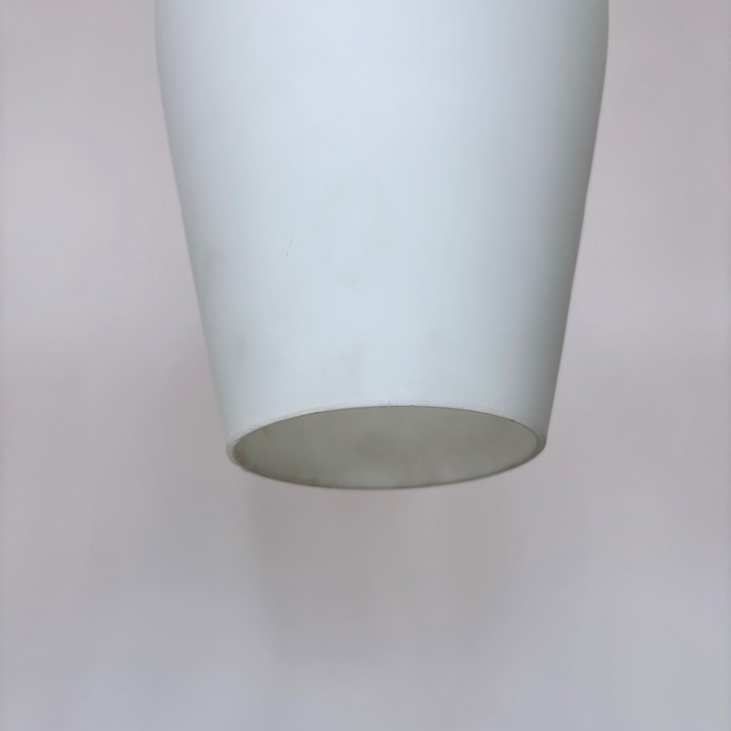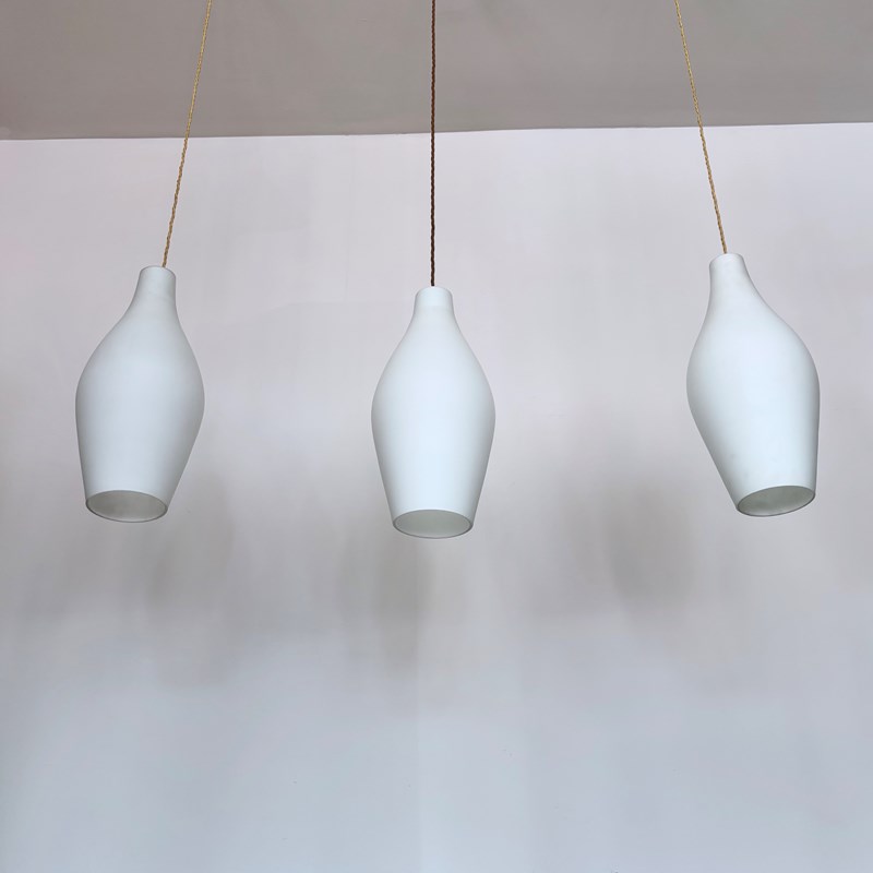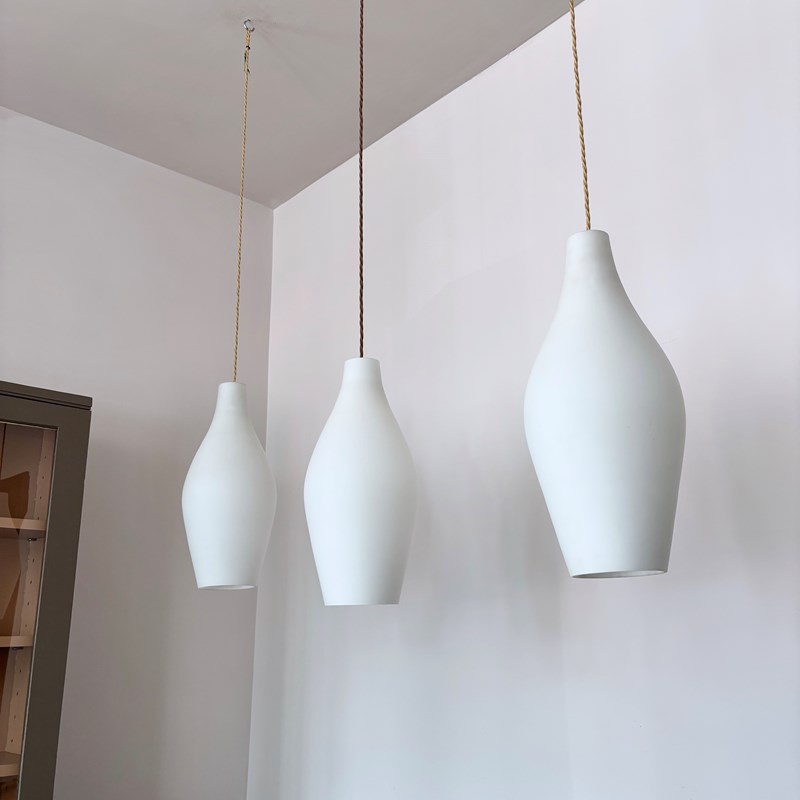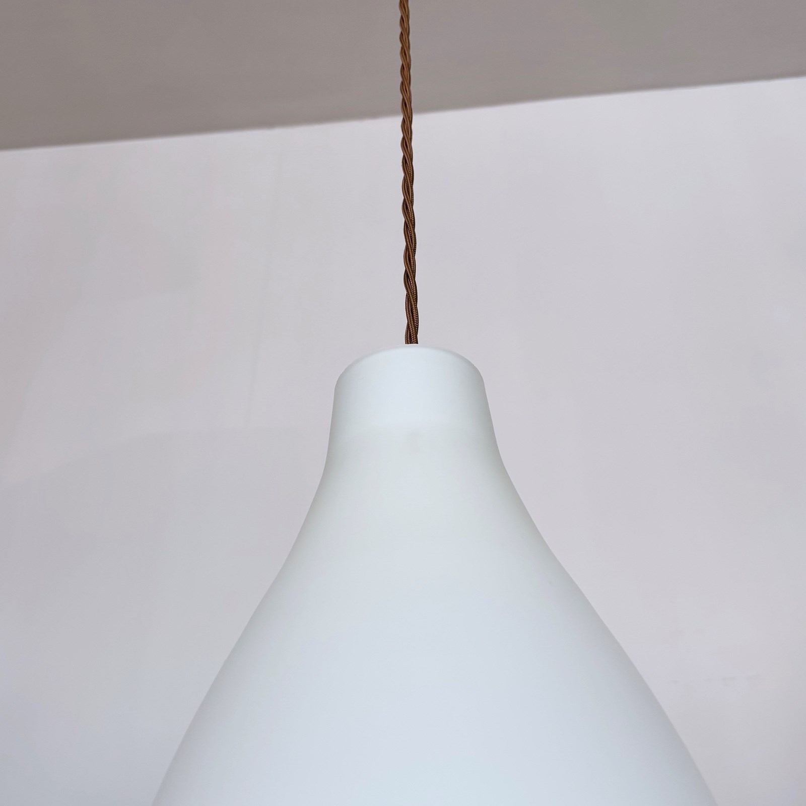 Three white danish shades. The pieces all feature small marks constant with age and use. Please see images. Newly wired with braided cable and a new internal brass lamp holder. Each pendant requires an E27 lamp. This is not included. Priced individually. Available to purchase individually or as a set. Ceiling fitting supplied. Braided cable colour can be changed to your preference.