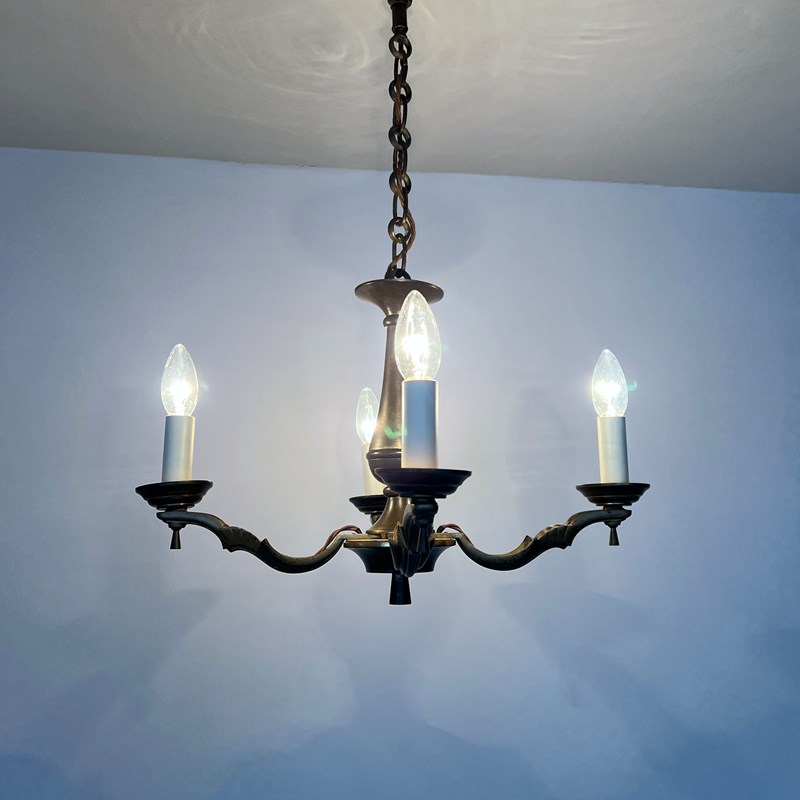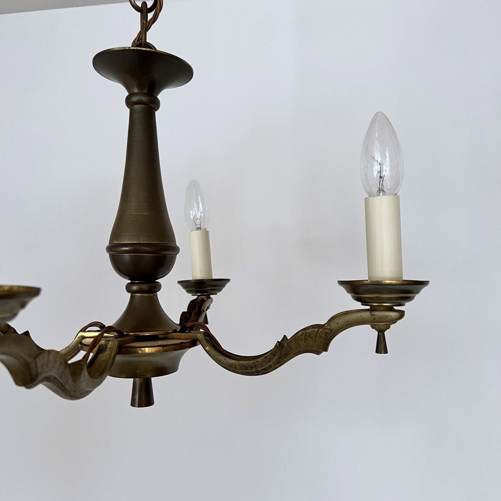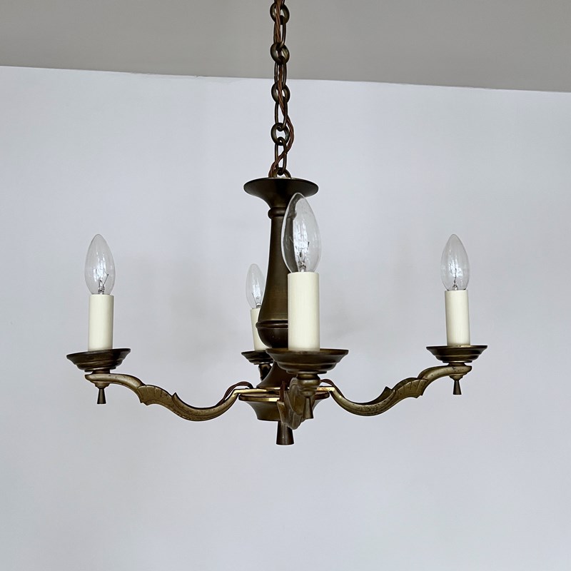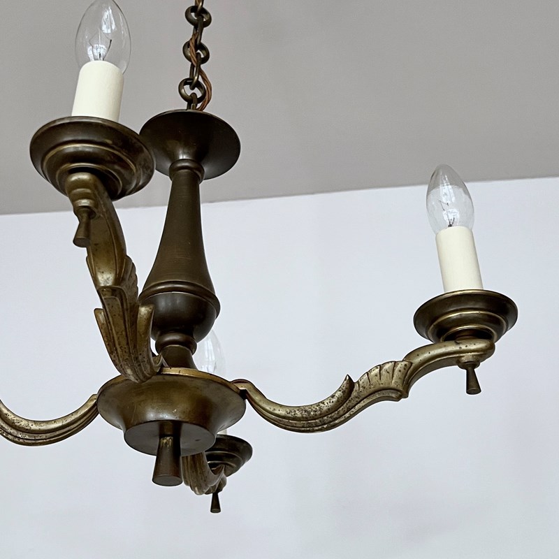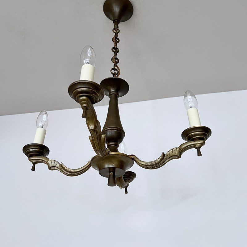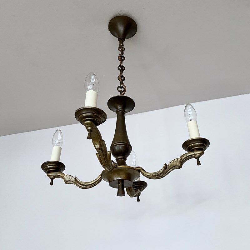 Ornate cast brass chandelier with four cast brass decorative arms. The chandelier comes supplied with braided flex, chain and a ceiling rose. Chandelier requires SES lamps, these are not included but can be supplied.