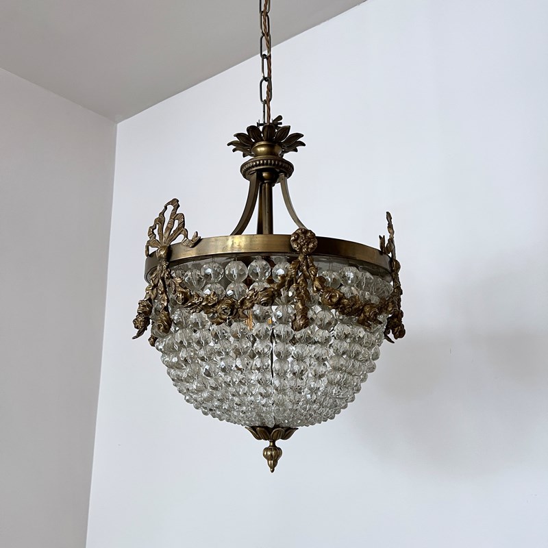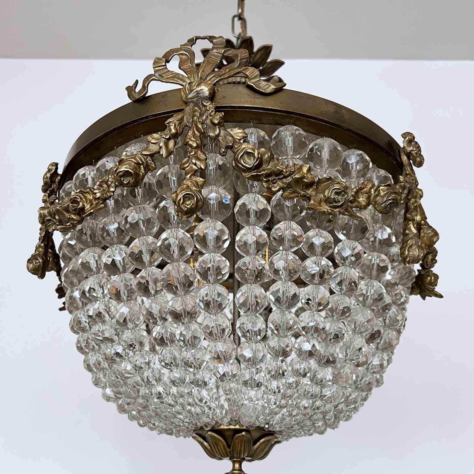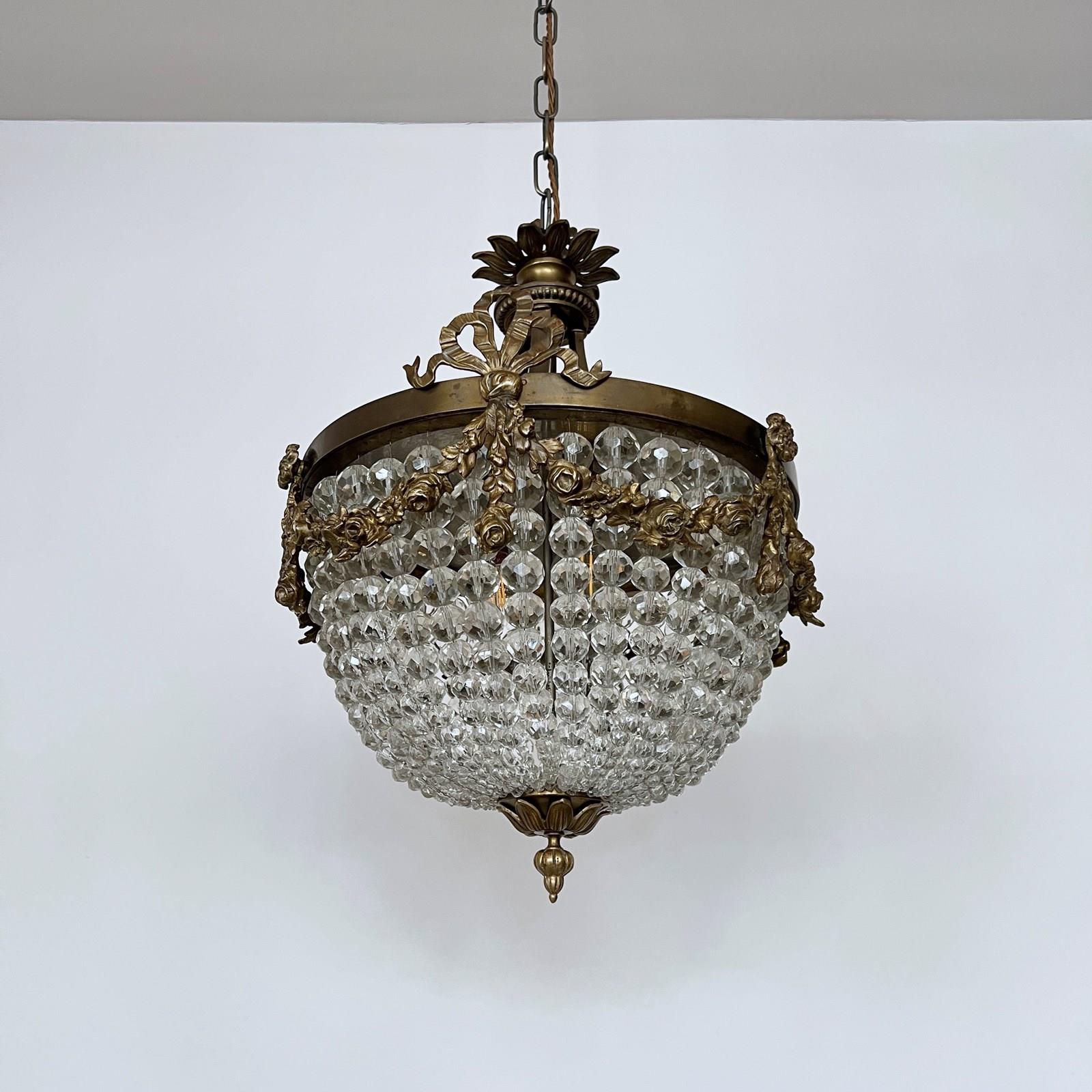 This original basket balloon chandelier is a decorative centre piece. The main body of the chandelier is made from strings of ascending faceted glass beads. The lower balloon beaded swags join on to a decorative brass piece with a finial. The frame features additional floral and ribbon style appliqué on the outer ring. The chandelier has three internal lamps which are concealed and illuminate the chandelier from within.