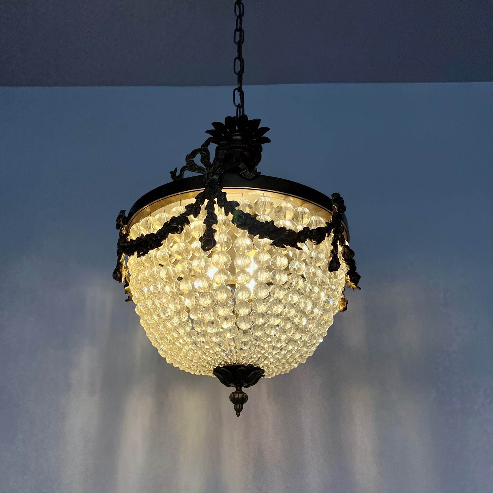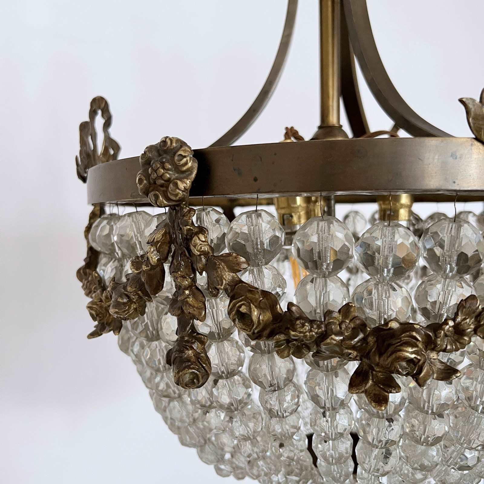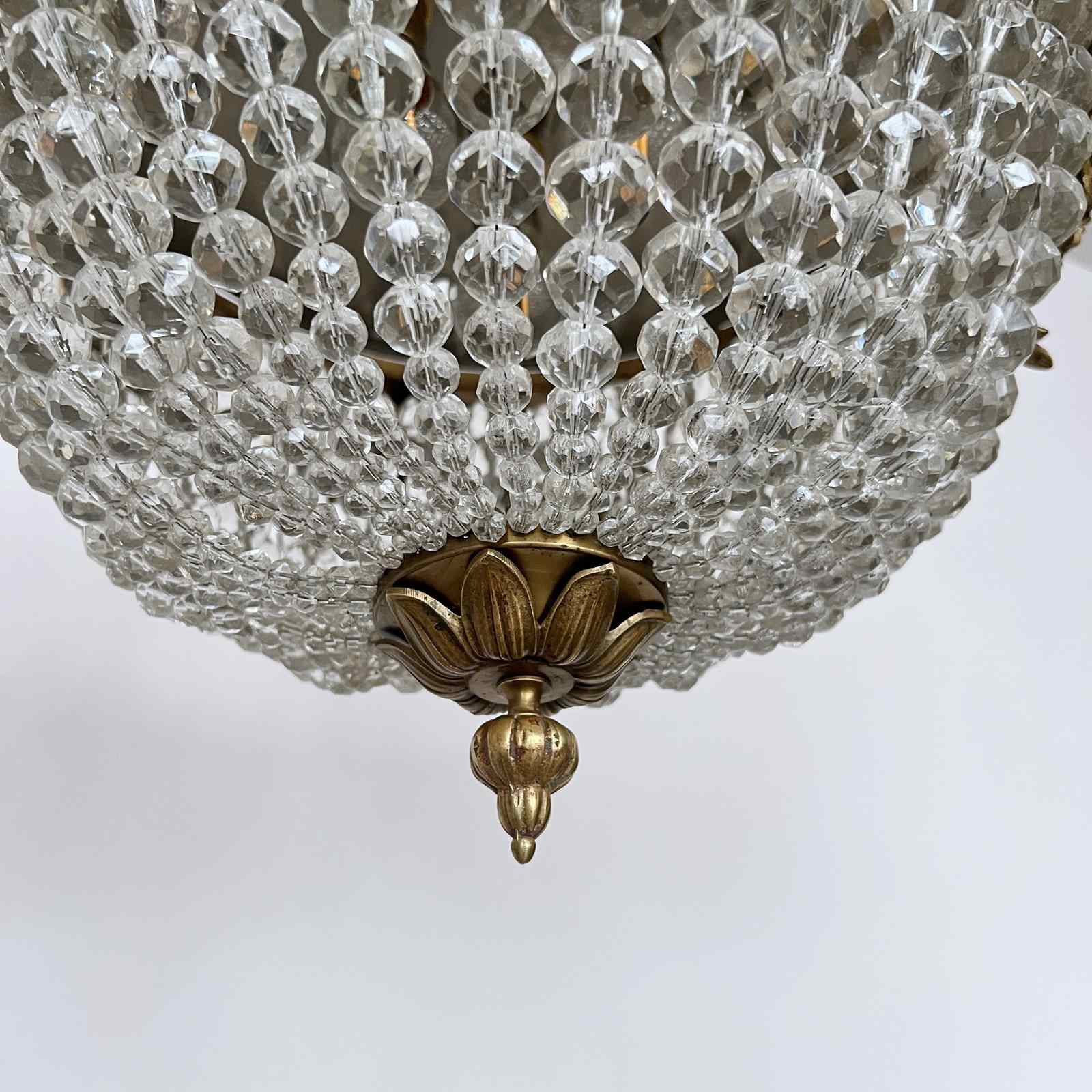 This original basket balloon chandelier is a decorative centre piece. The main body of the chandelier is made from strings of ascending faceted glass beads. The lower balloon beaded swags join on to a decorative brass piece with a finial. The frame features additional floral and ribbon style appliqué on the outer ring. The chandelier has three internal lamps which are concealed and illuminate the chandelier from within.