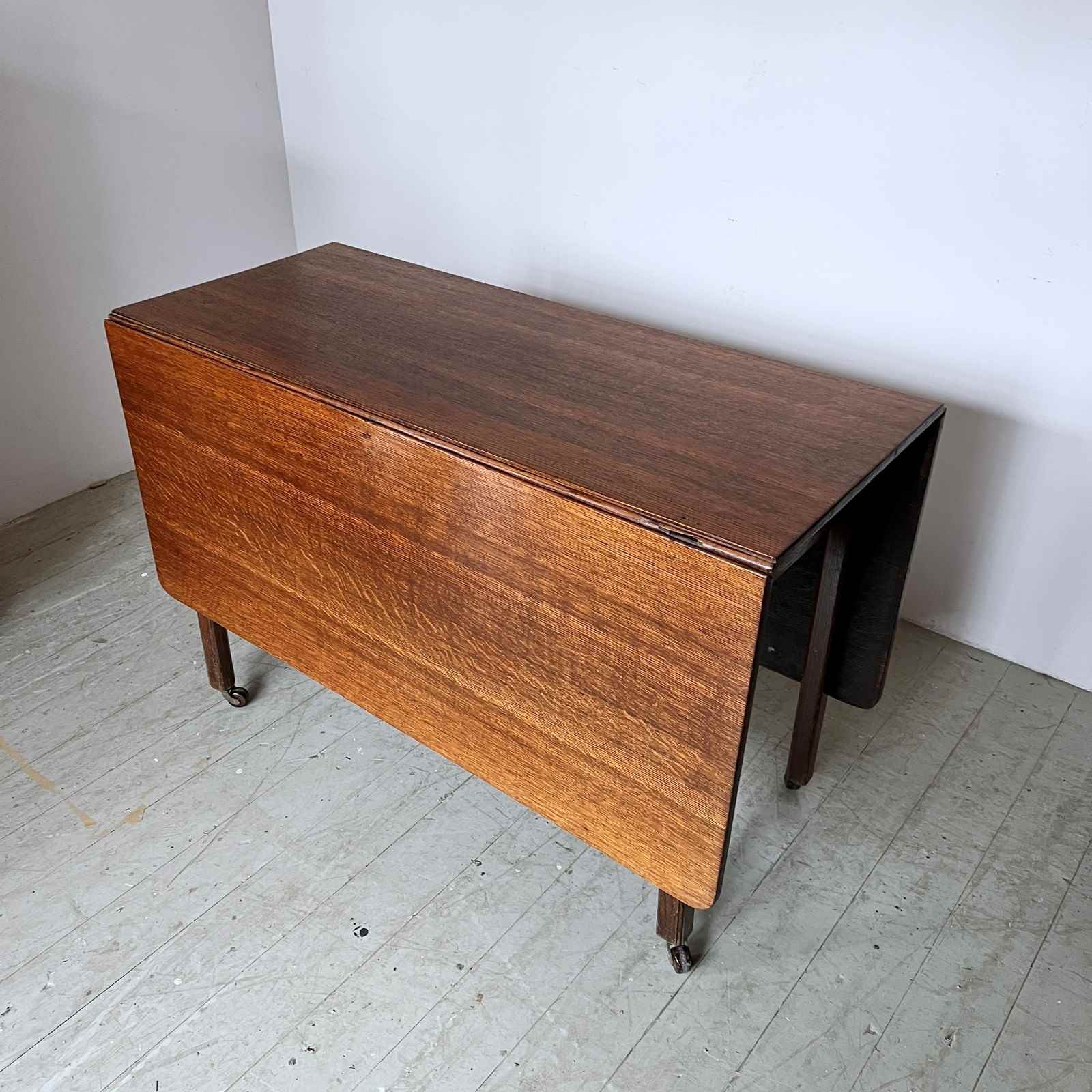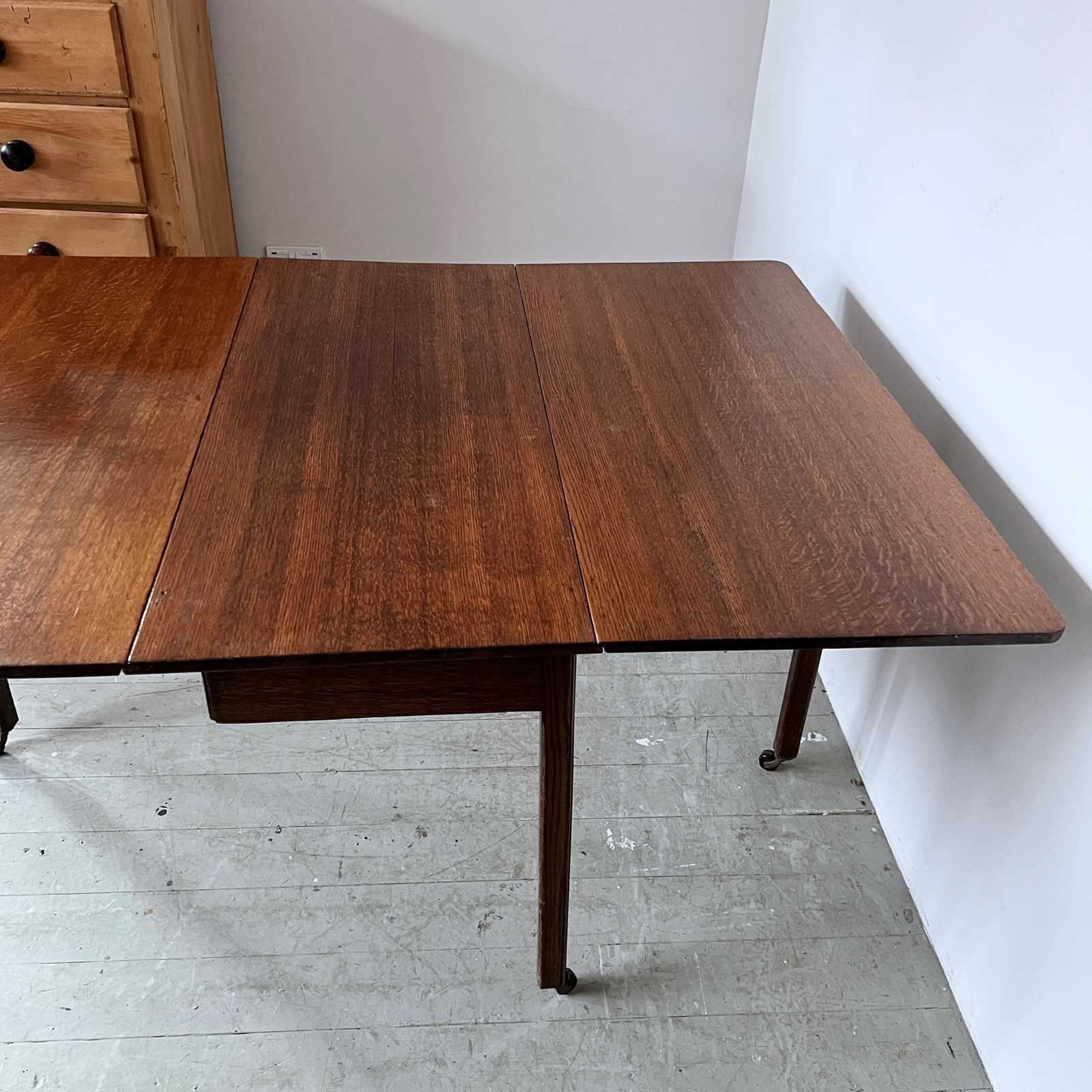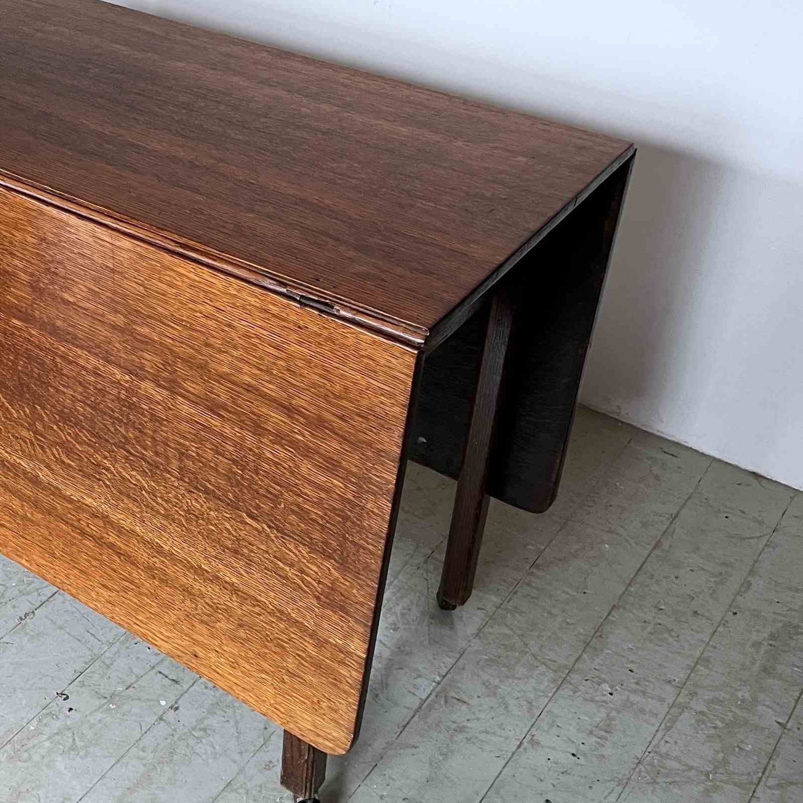 Vintage Oak drop leaf table in good vintage condition. With stylised legs and supports finished with castors.