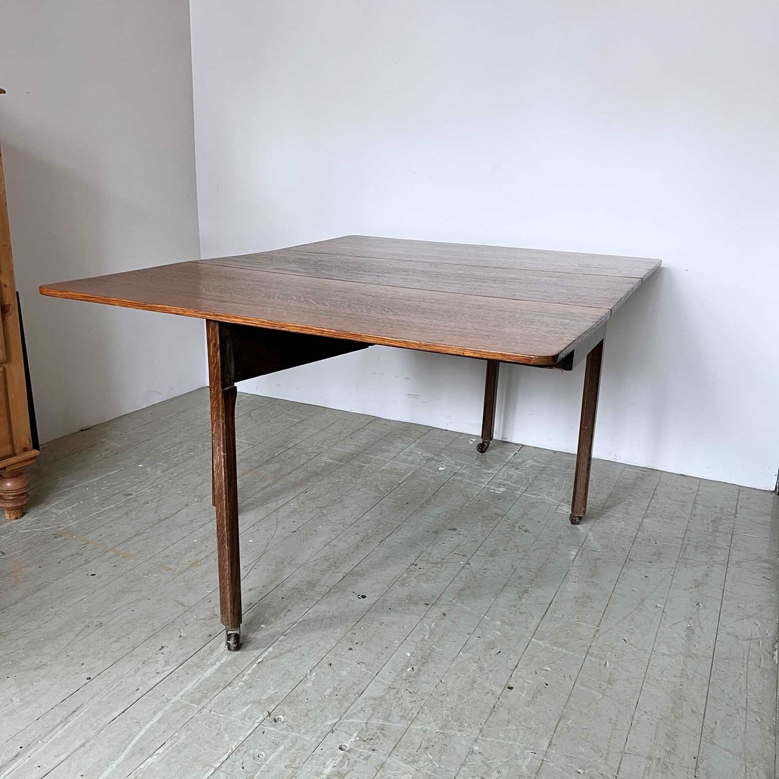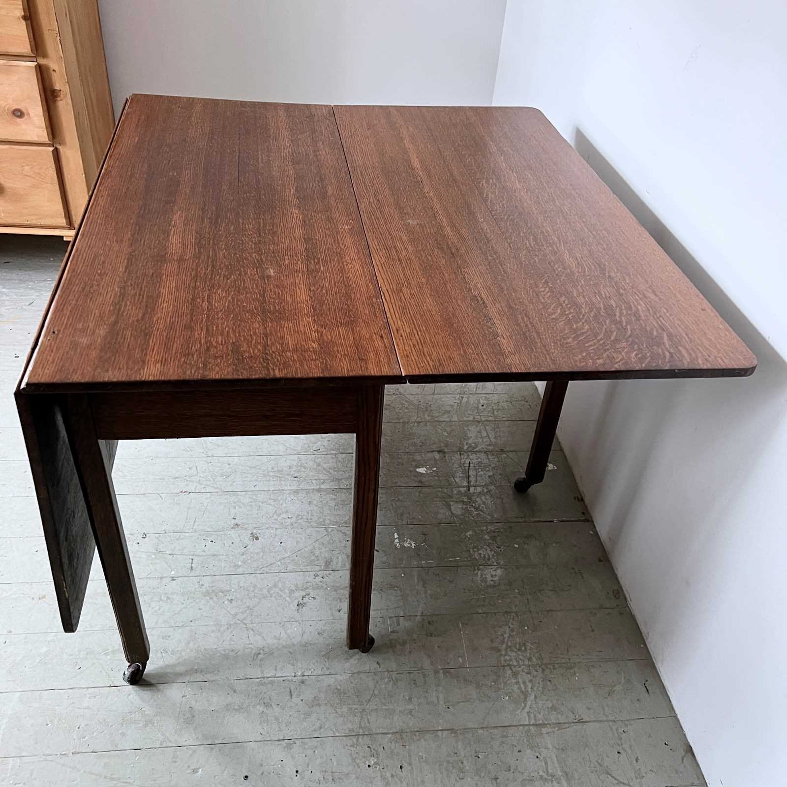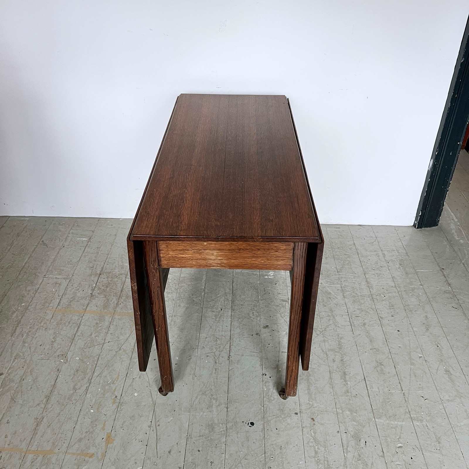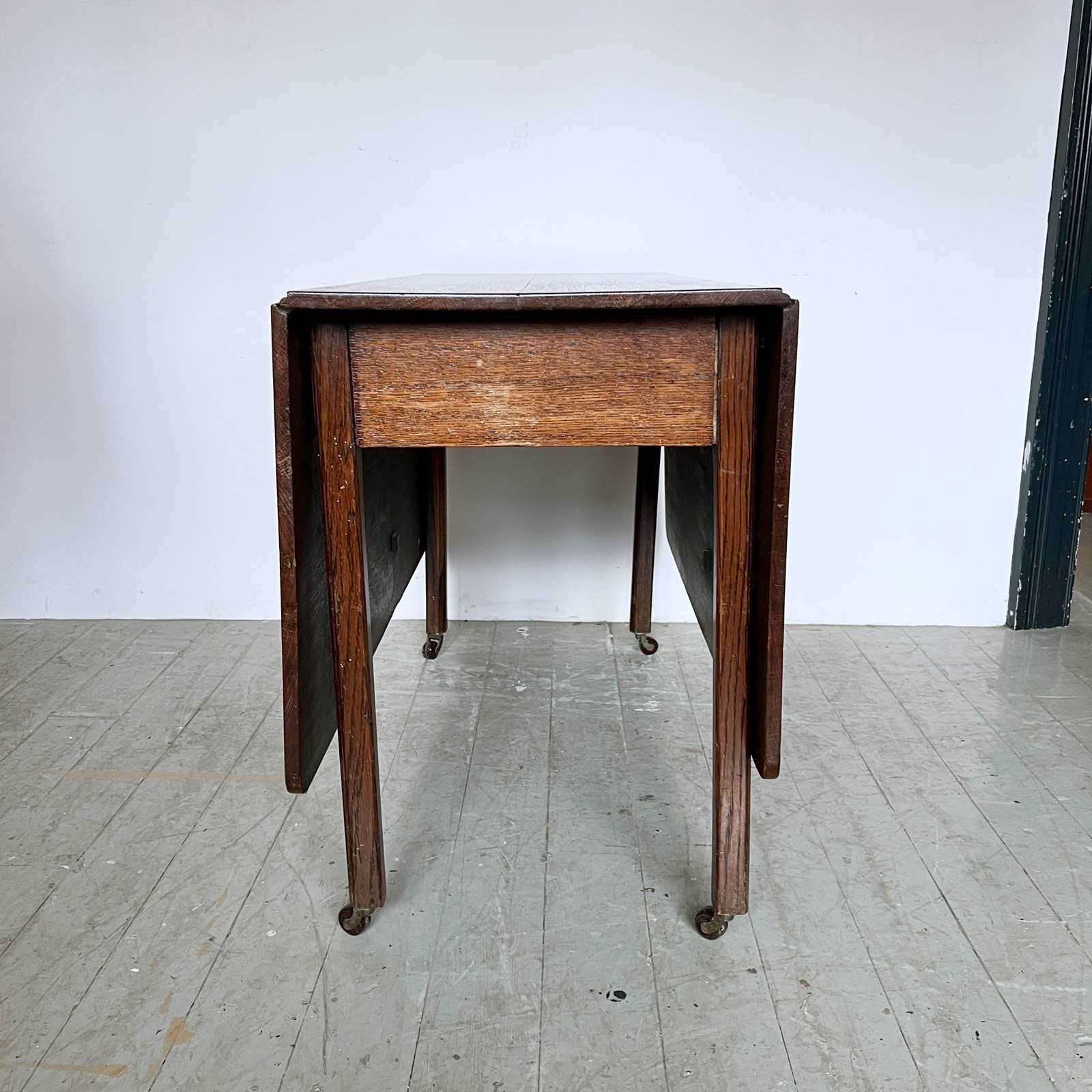 Vintage Oak drop leaf table in good vintage condition. With stylised legs and supports finished with castors.