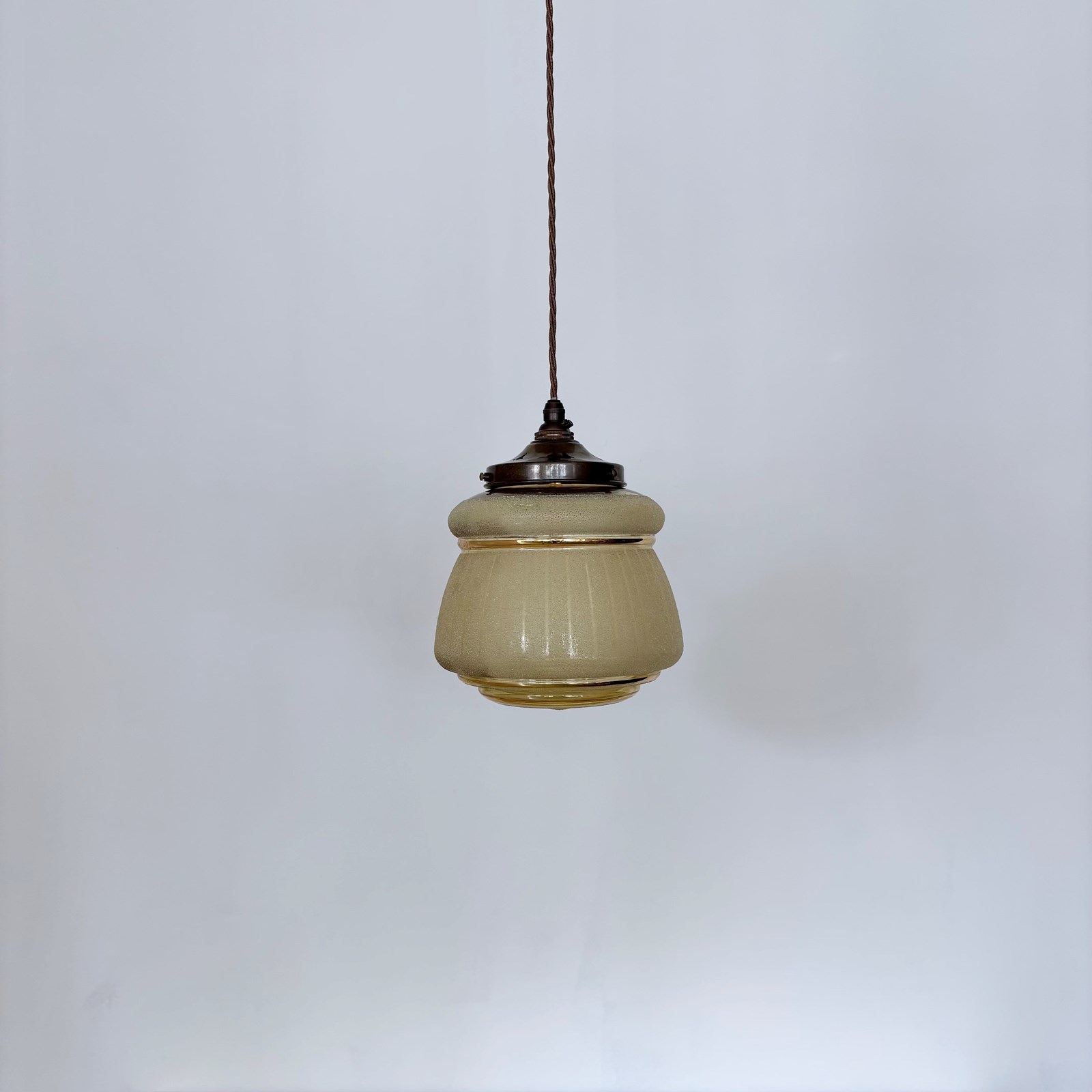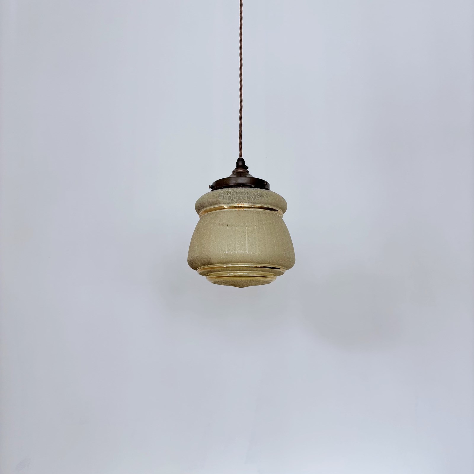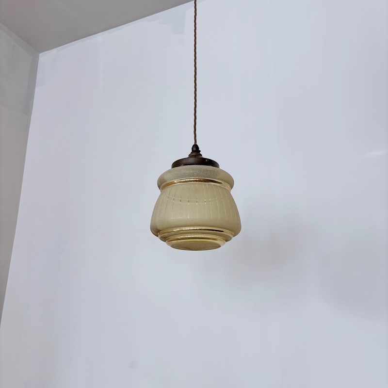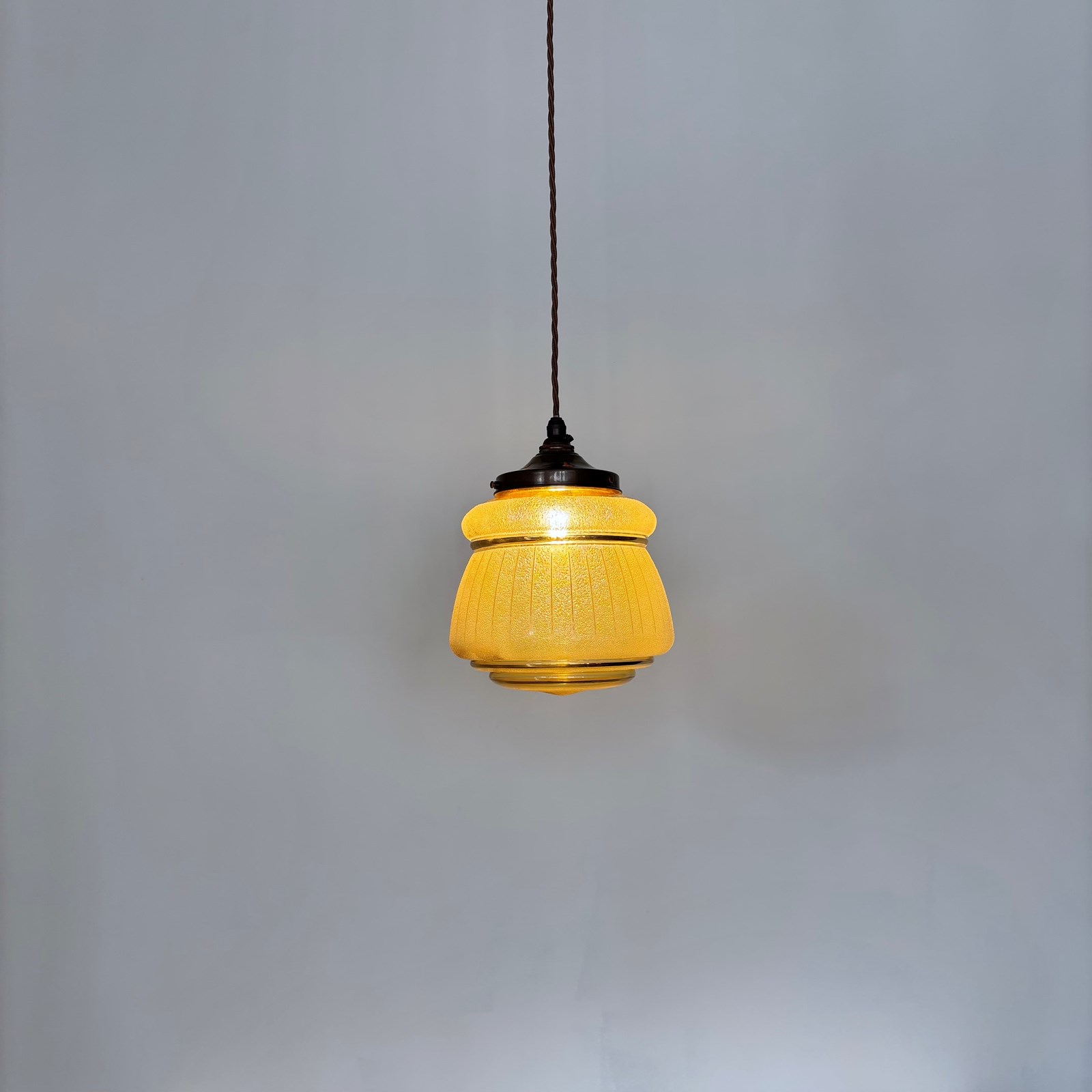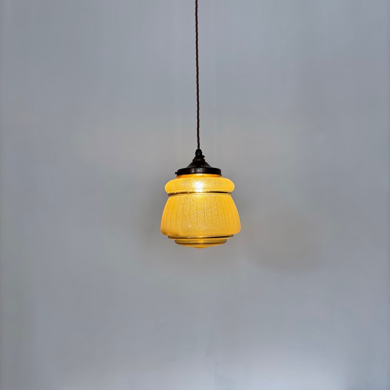 Yellow glass shade with gold bands finished with an antique brass finish fitting and dark brown braided cable. The coloured braided flex can be changed to your preference and a matching ceiling fitting is supplied. The shade requires one b22 bulb. This is not included but can be supplied.