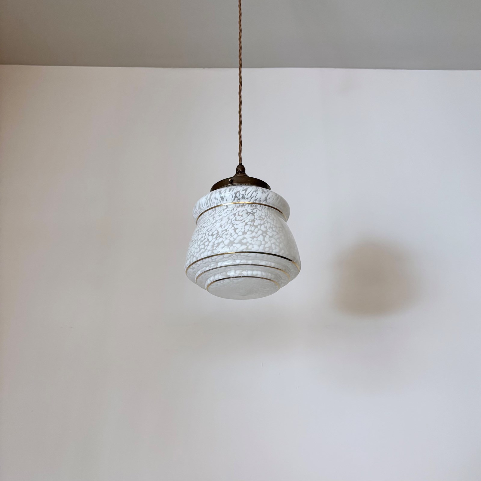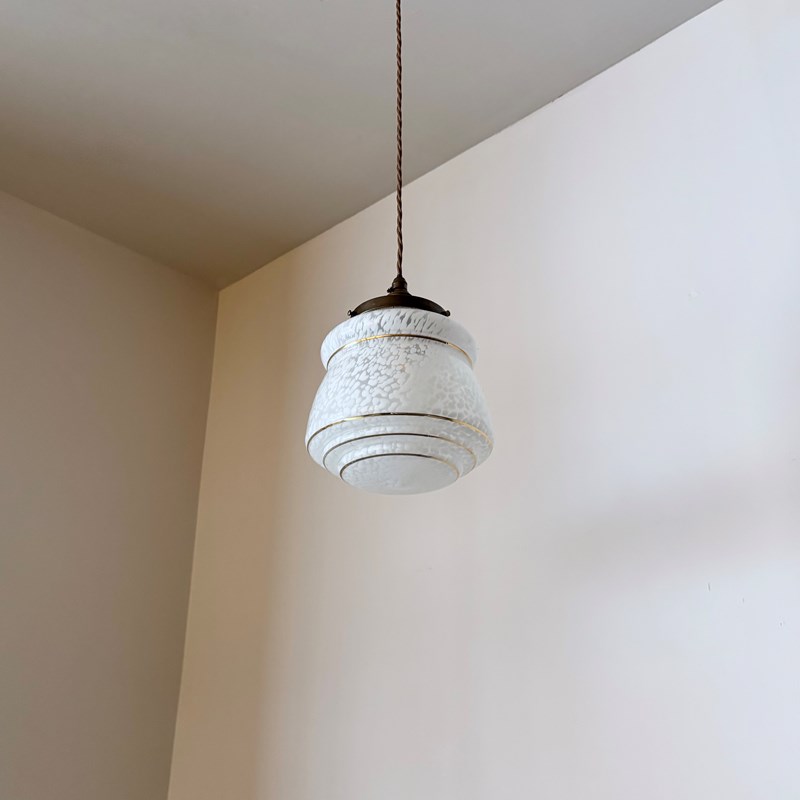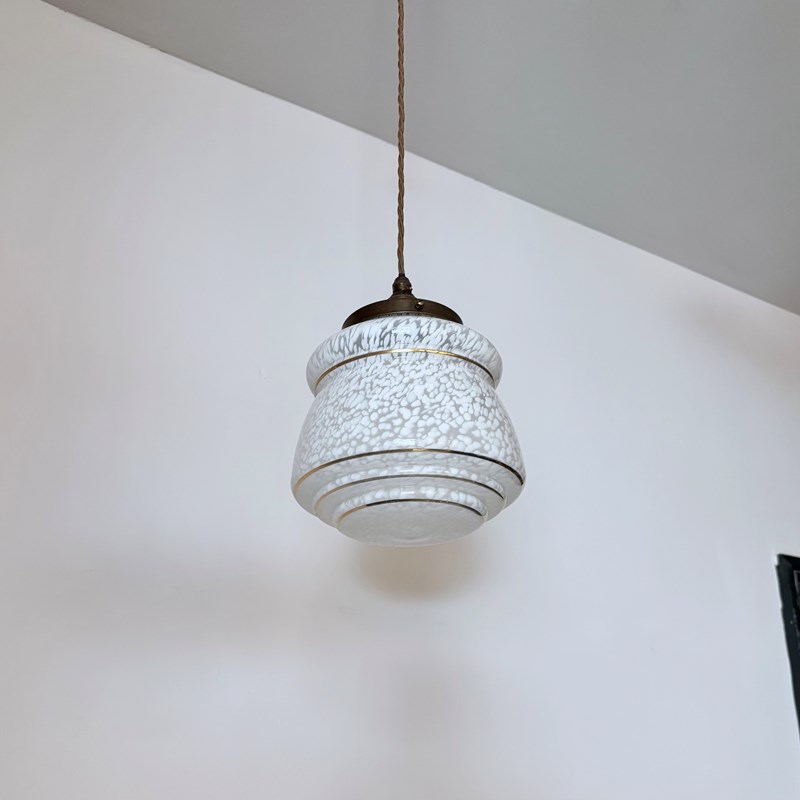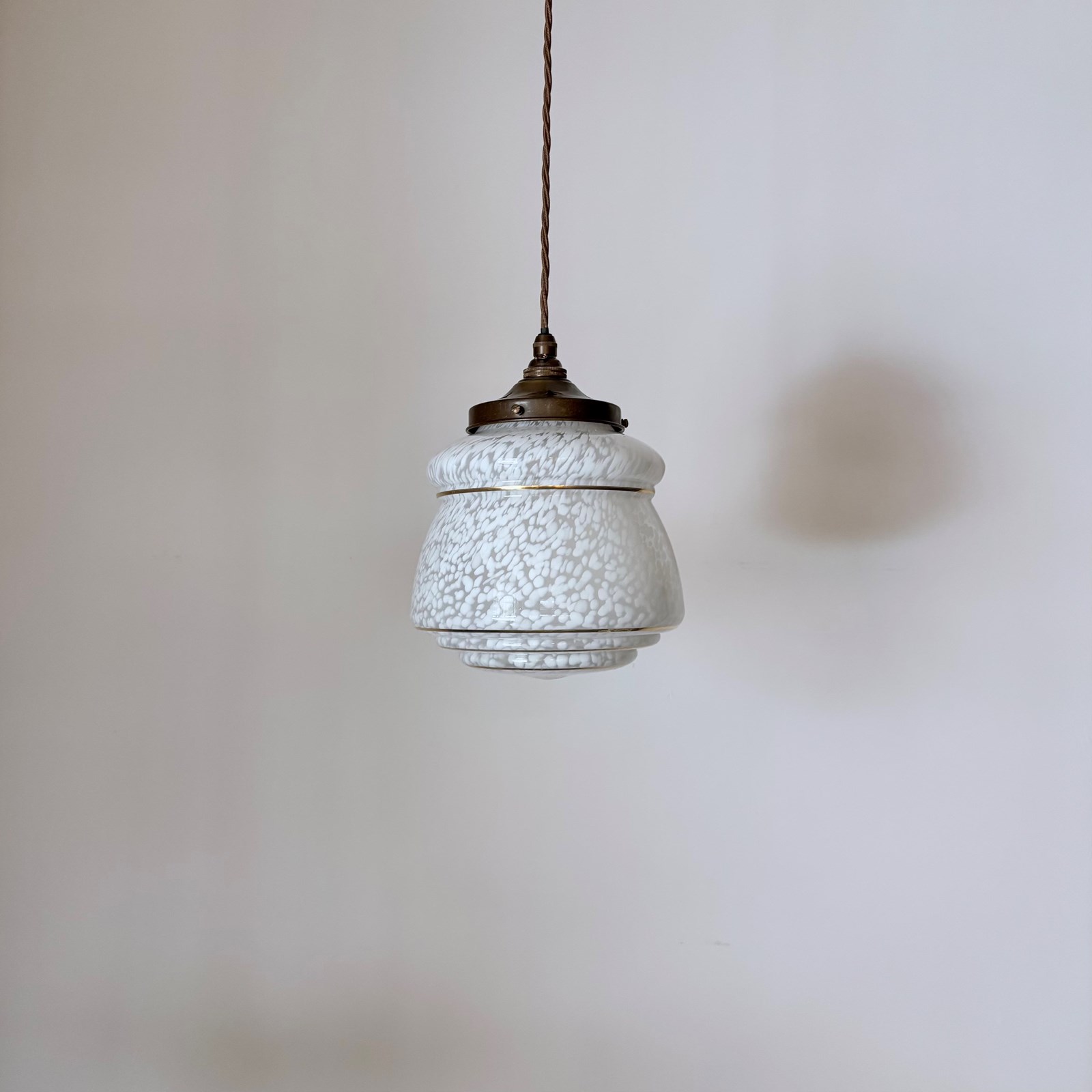 Mottled white Clichy glass enclosed shade finished with an antique brass finish fitting and dark brown braided cable. The coloured braided flex can be changed to your preference and a matching ceiling fitting is included. The shade requires one b22 bulb. This is not included but can be supplied.