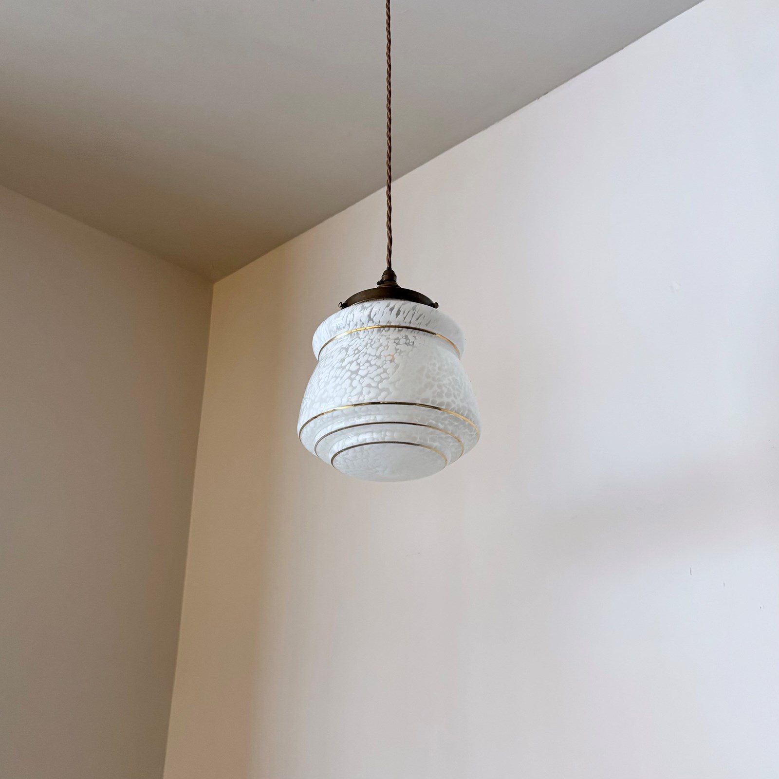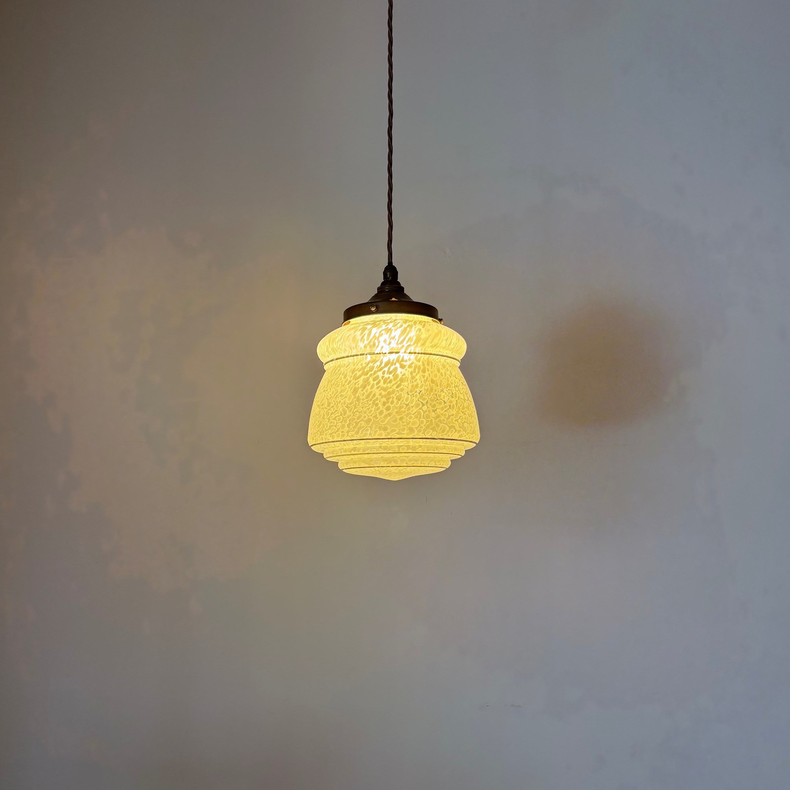 This shade has been fully rewired here, in Stockport, near Manchester by our small team of experts and is now ready to be installed. We recommend that this is installed by an electrician into a joist or a supporting noggin. To clean dust the flex and brass components regularly with a soft cloth. The glass shade can then be wiped with a glass wipe or a cloth that has been sprayed with glass cleaner. A final wipe with a paper towel will give a polished finish.