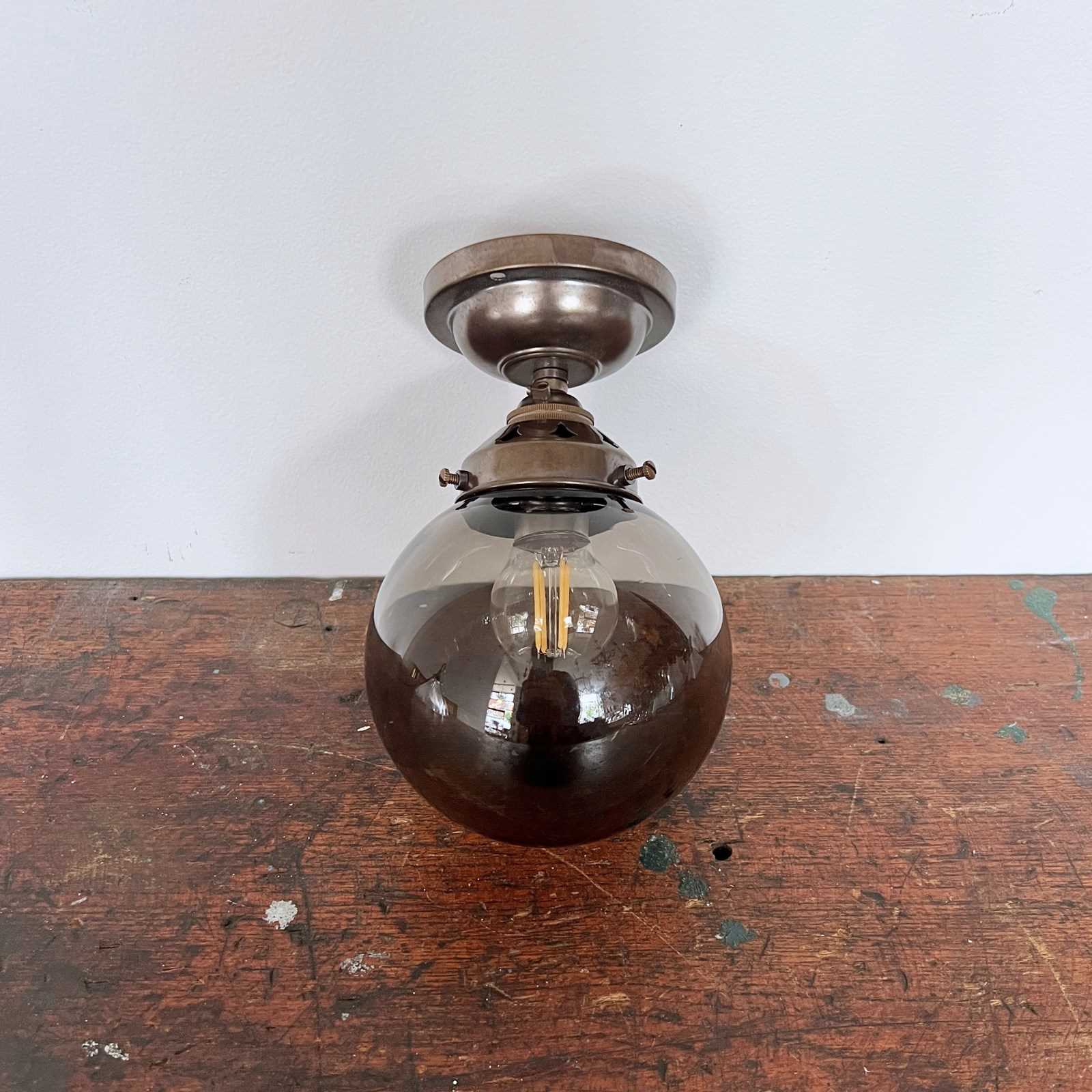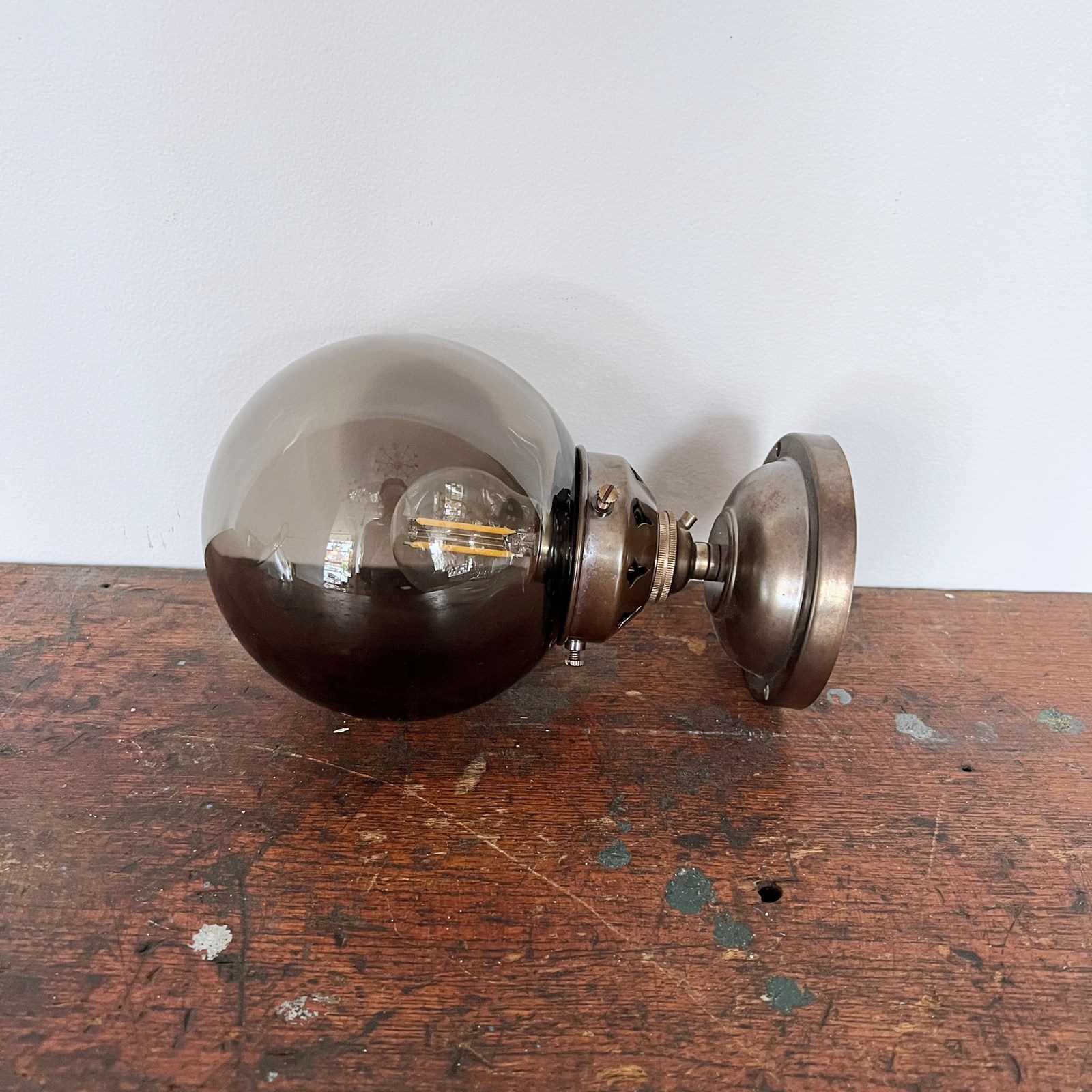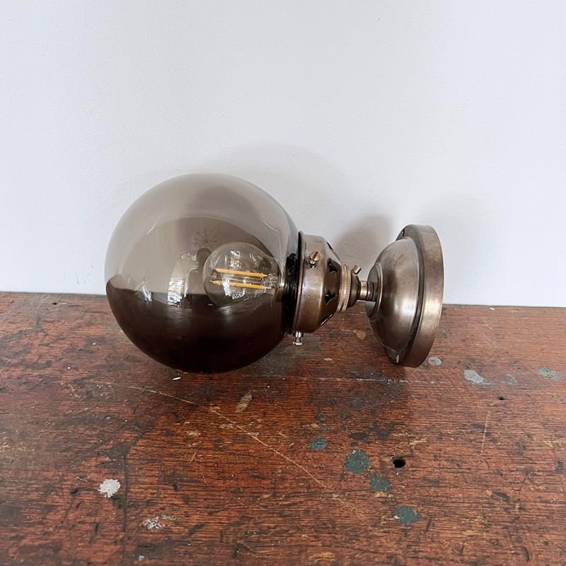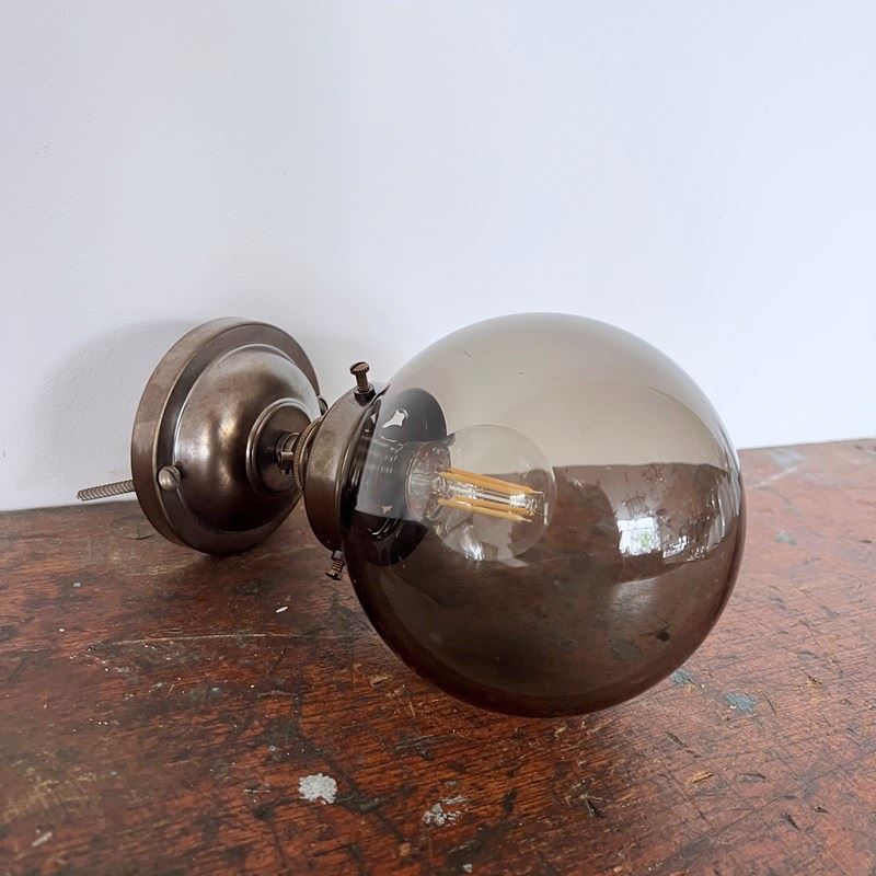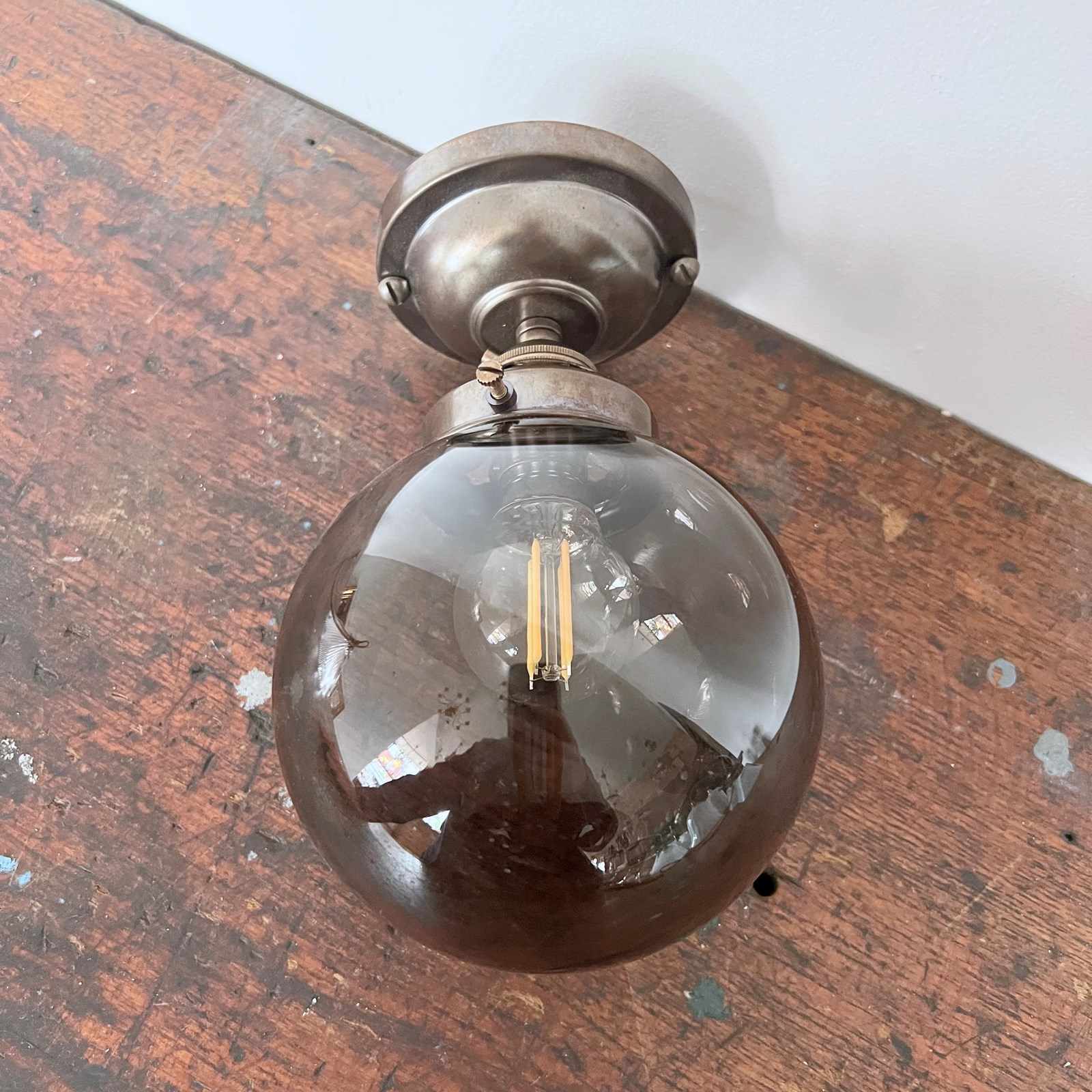 Each light features a newly made smoked glass globe shade. We can also create these pieces in brushed antique brass, raw or polished brass finishes. Multiples available.