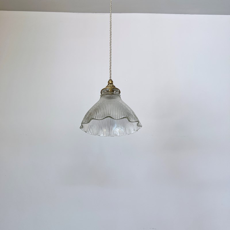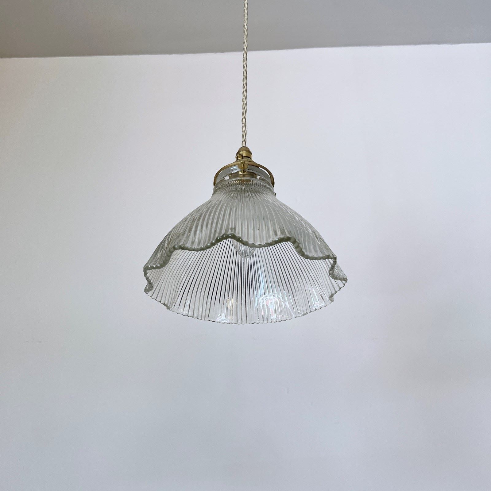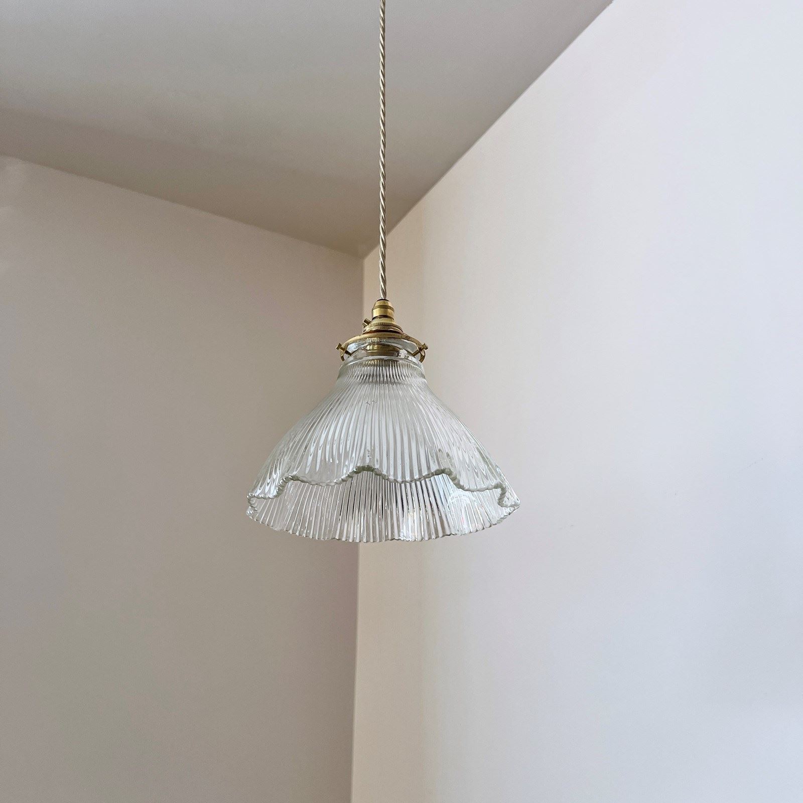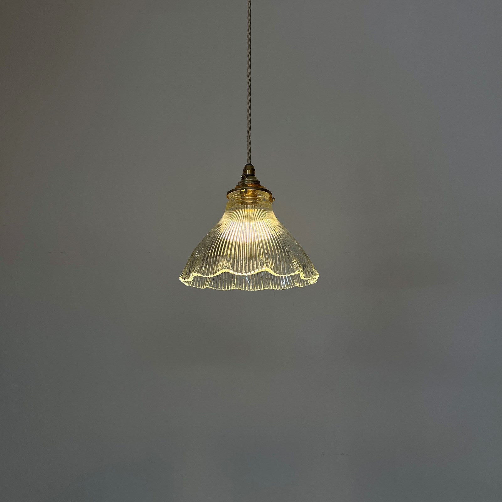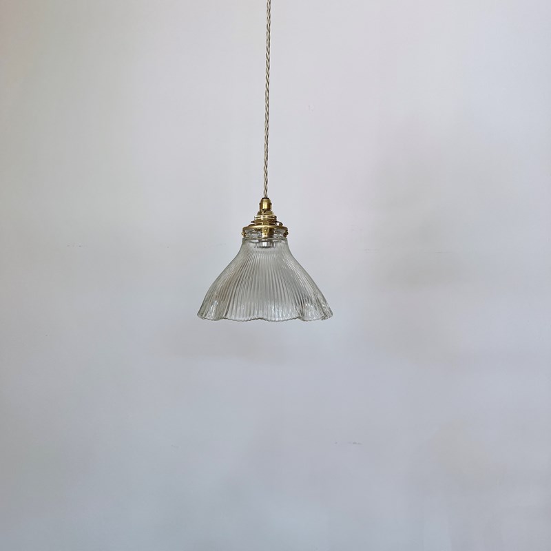 Holophane style fluted glass shade. Rewired with a polished brass lamp holder and skeleton fitting with beige braided flex. The shade requires one B22 lamp. The coloured flex can be changed to your preference and a matching ceiling fitting is supplied.