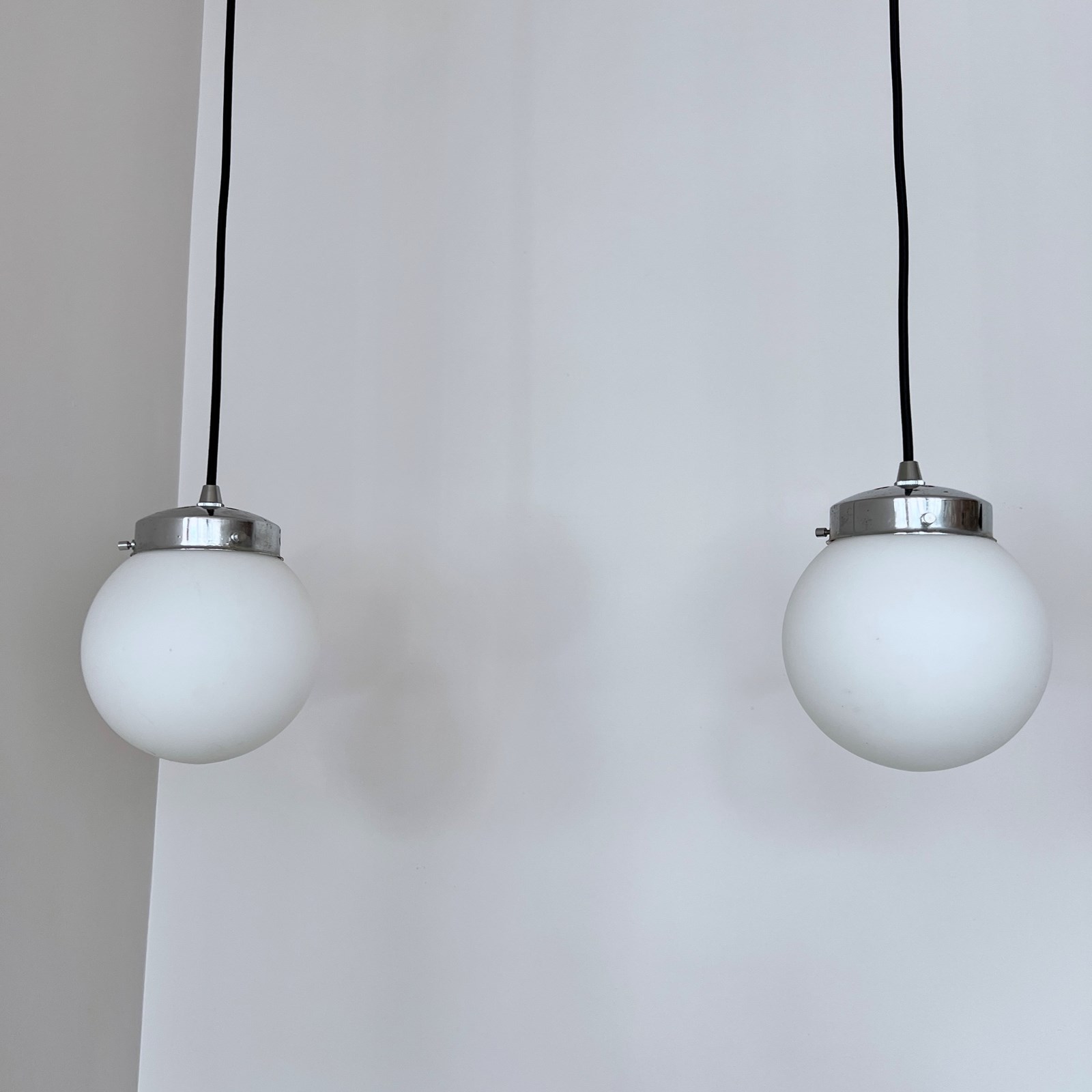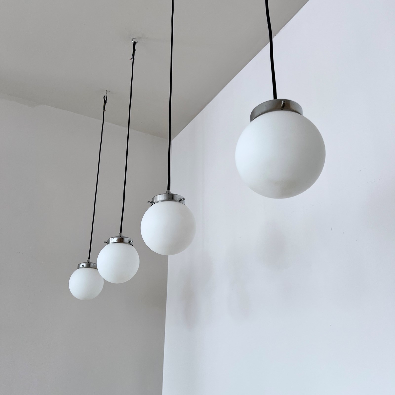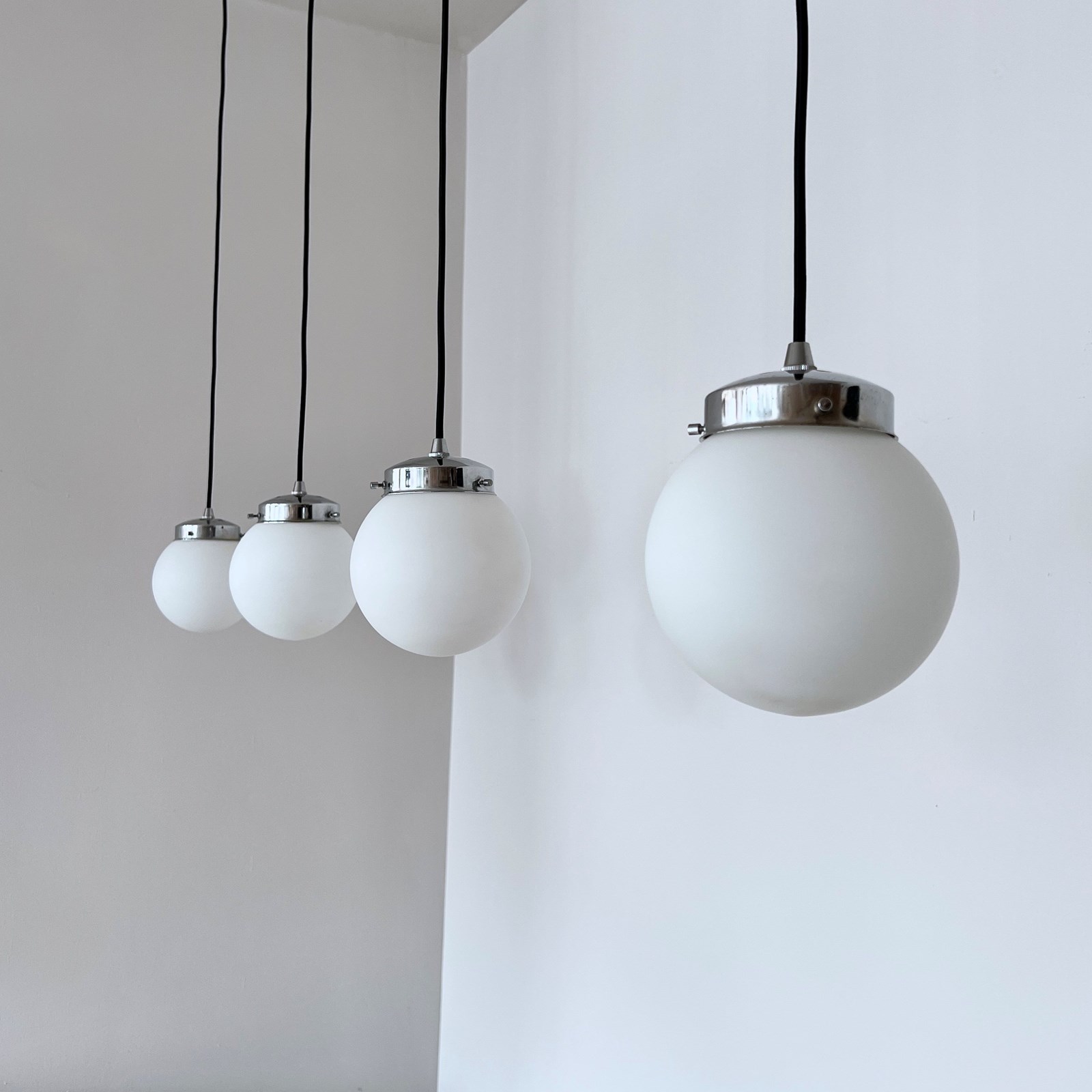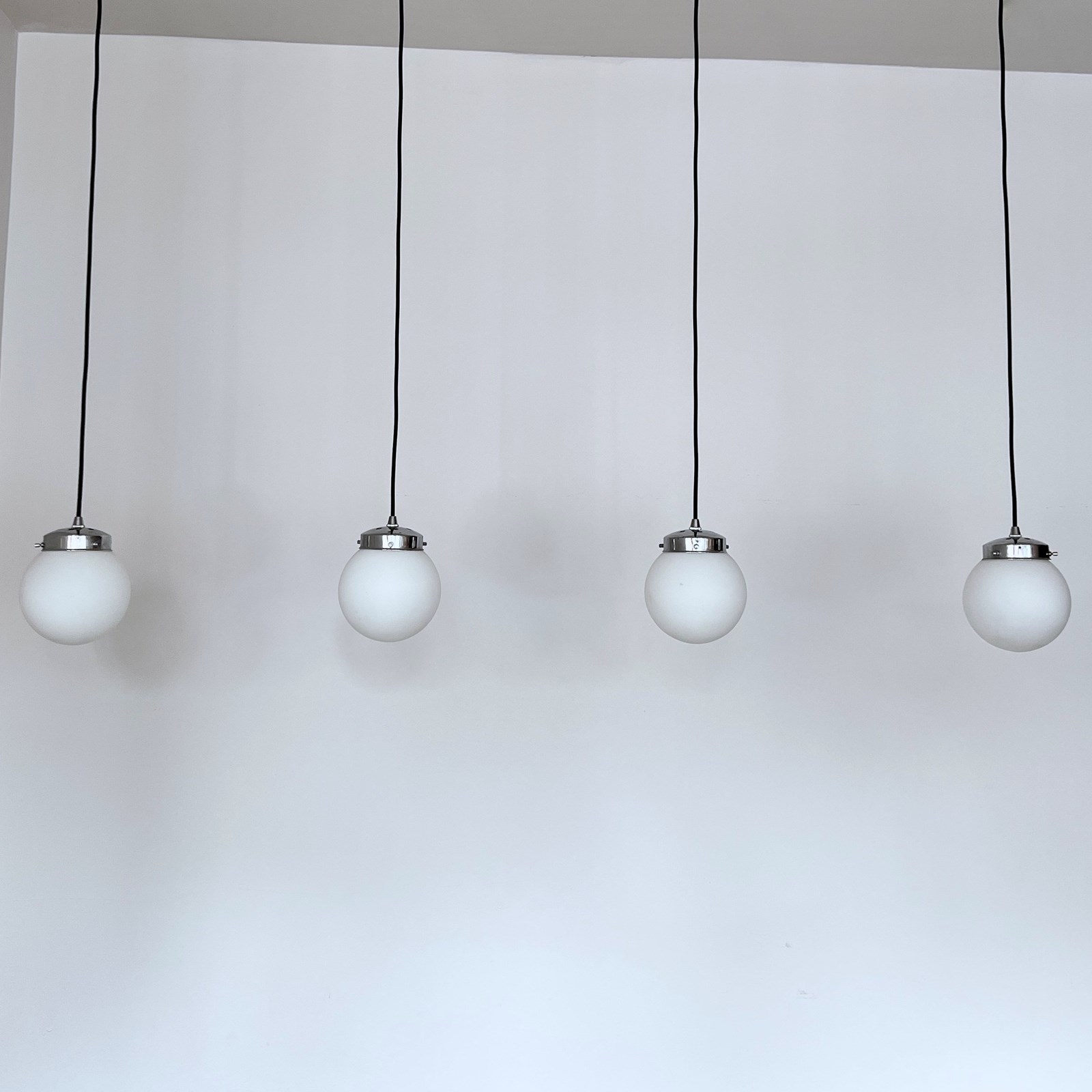 Set of four matte white frosted shades complete with silver cap galleries. The pieces all feature small marks constant with age and use. Please see images. Newly wired with rounded black cable and a new internal brass lamp holder. Each pendant requires a b22 lamp. These are not included but can be supplied. Available to purchase individually or as a set. Ceiling fitting supplied. Braided cable colour can be changed to your preference.