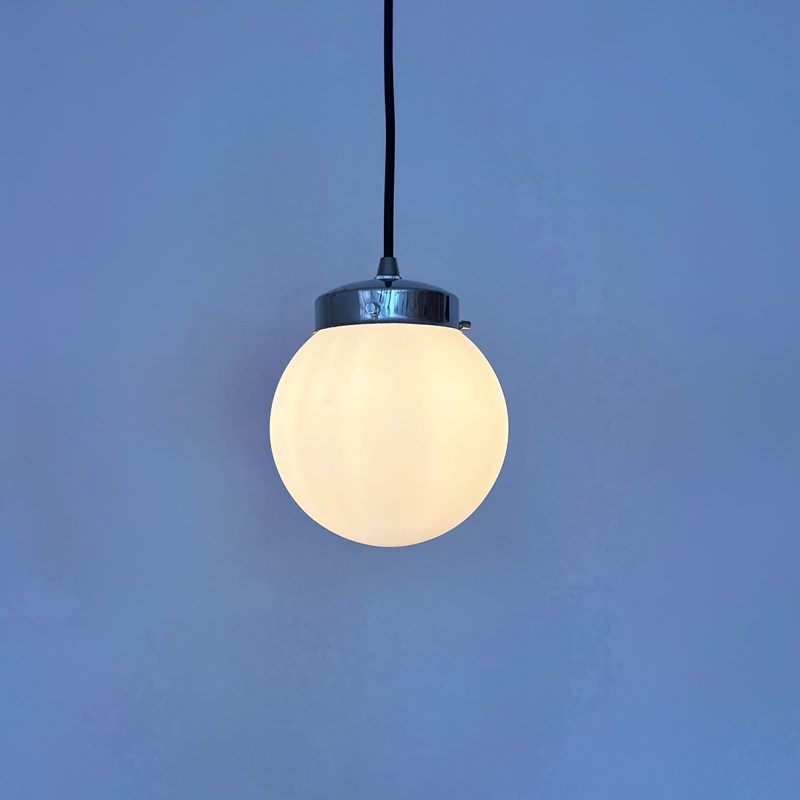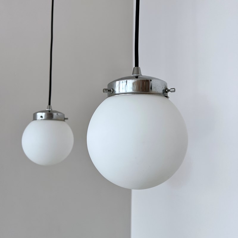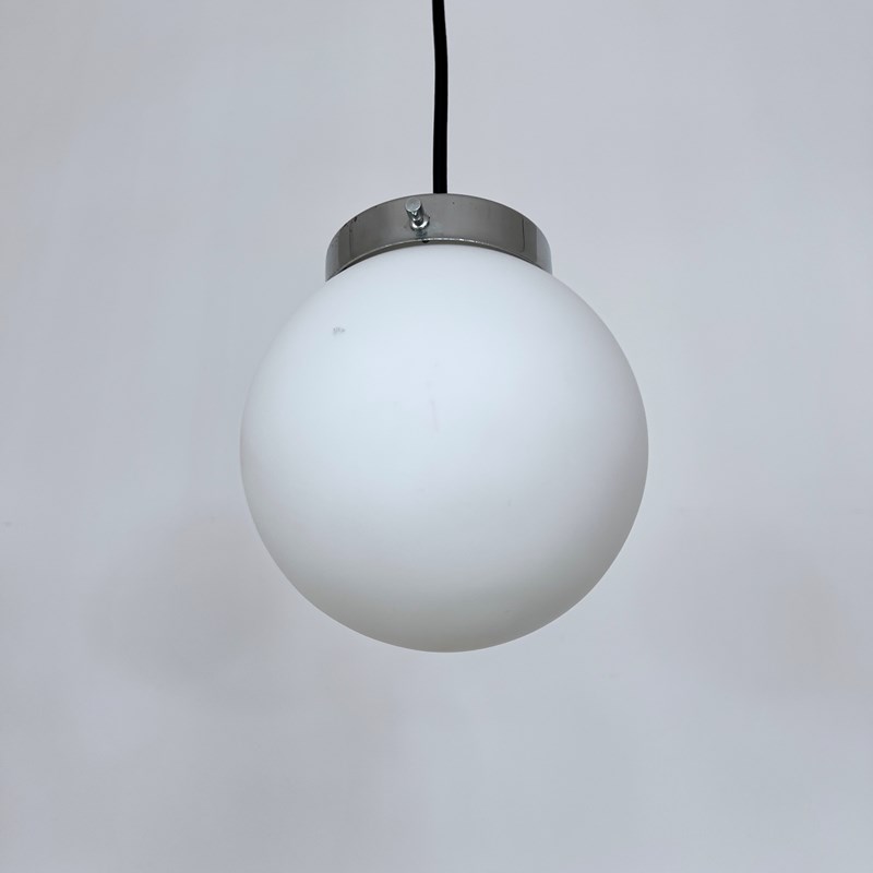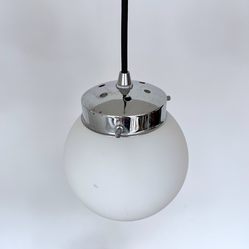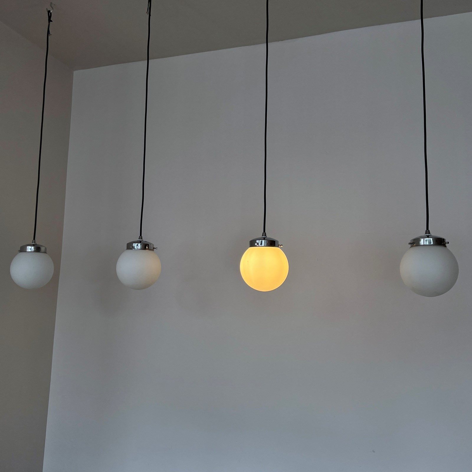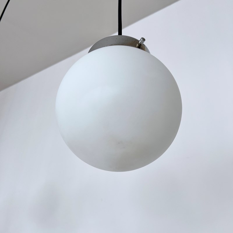 Set of four matte white frosted shades complete with silver cap galleries. The pieces all feature small marks constant with age and use. Please see images. Newly wired with rounded black cable and a new internal brass lamp holder. Each pendant requires a b22 lamp. These are not included but can be supplied. Available to purchase individually or as a set. Ceiling fitting supplied. Braided cable colour can be changed to your preference.