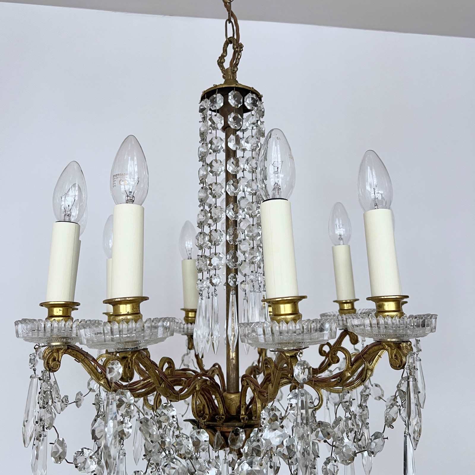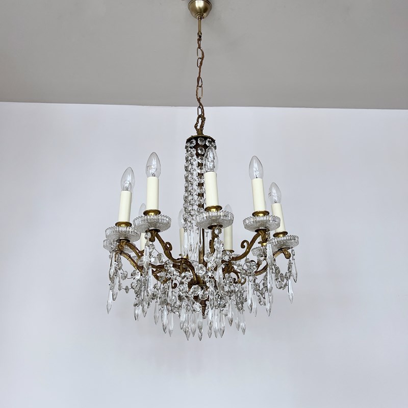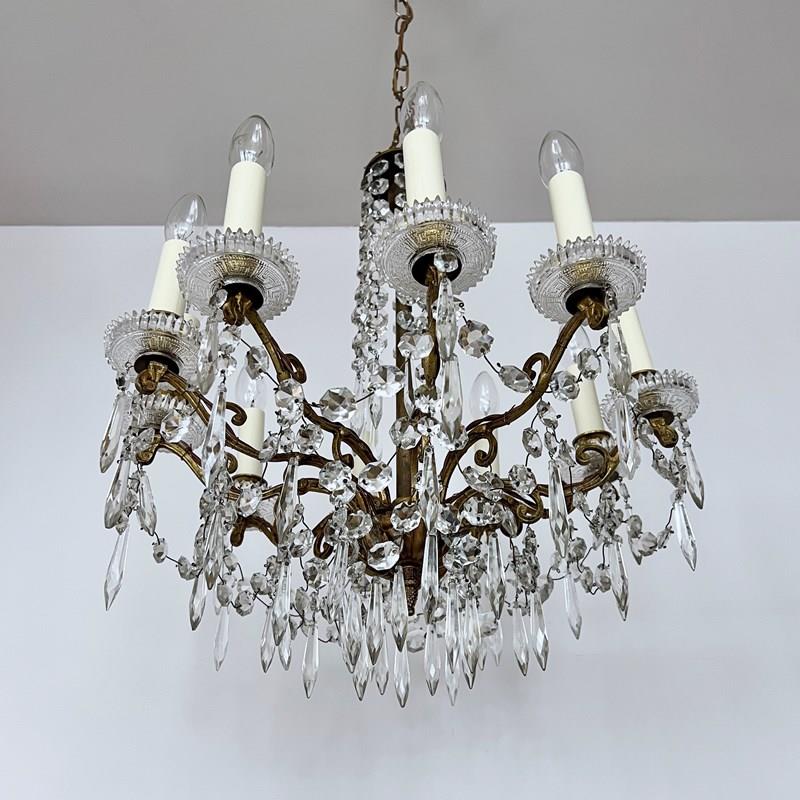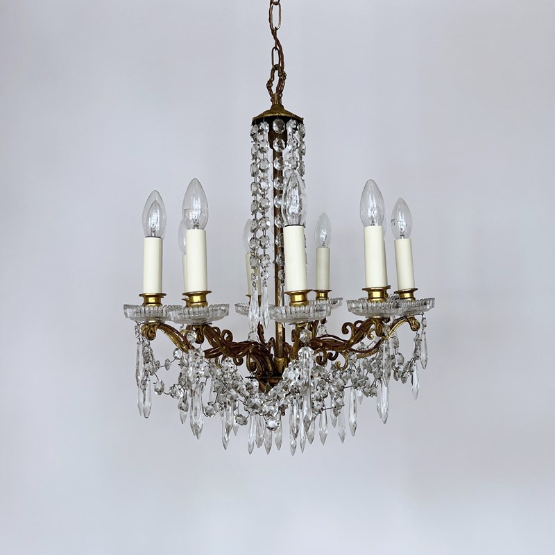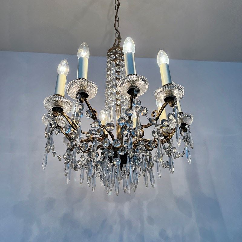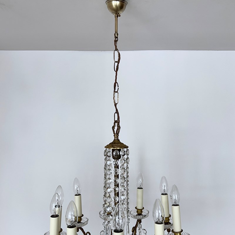 This chandelier has been fully restored and rewired here, in Stockport, near Manchester by our small team of experts and is now ready to be installed. We recommend that this chandelier is installed by an electrician and into a joist or a supporting noggin. To clean the chandelier dust the brass components regularly with a soft cloth. The glass drops can then be wiped with a glass wipe or a cloth that has been sprayed with glass cleaner. A final wipe with a paper towel will give a polished finish.