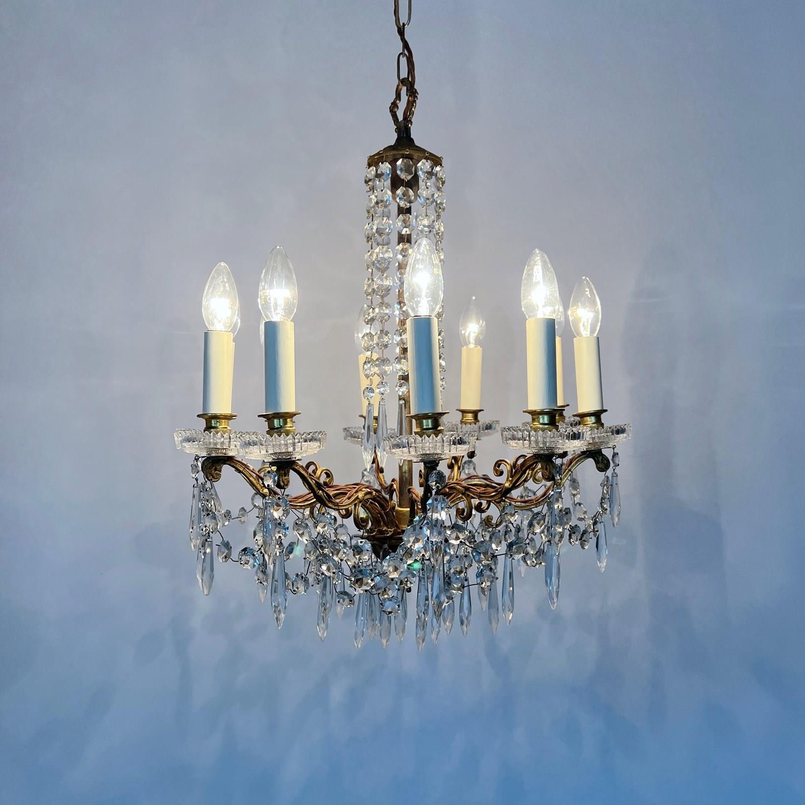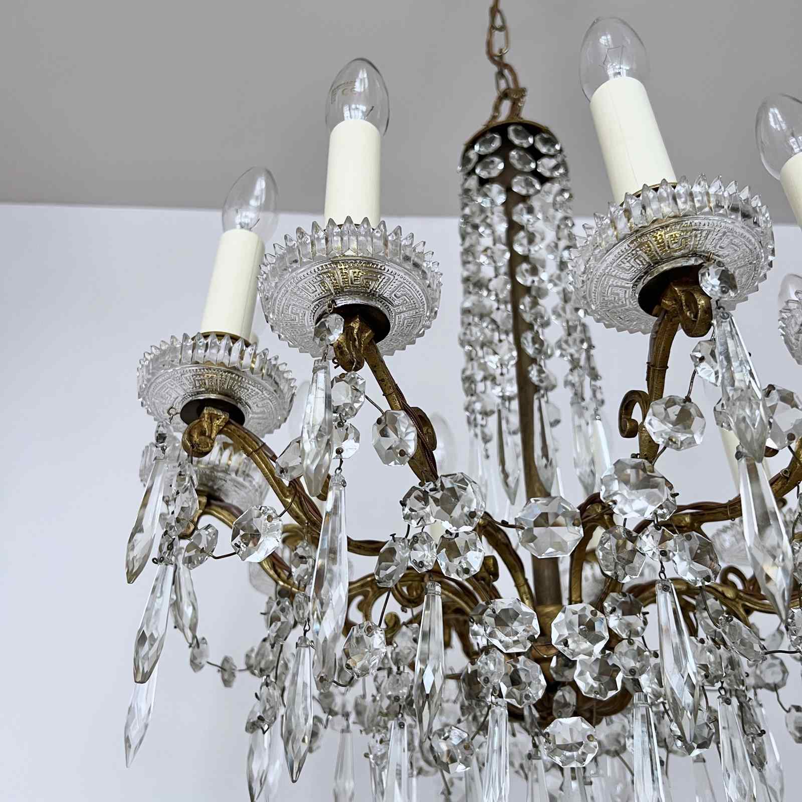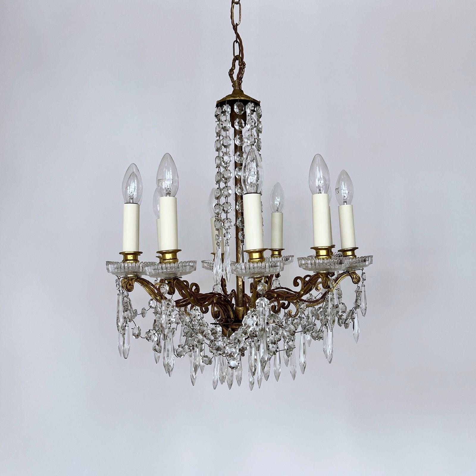 This chandelier has been fully restored and rewired here, in Stockport, near Manchester by our small team of experts and is now ready to be installed. We recommend that this chandelier is installed by an electrician and into a joist or a supporting noggin. To clean the chandelier dust the brass components regularly with a soft cloth. The glass drops can then be wiped with a glass wipe or a cloth that has been sprayed with glass cleaner. A final wipe with a paper towel will give a polished finish.