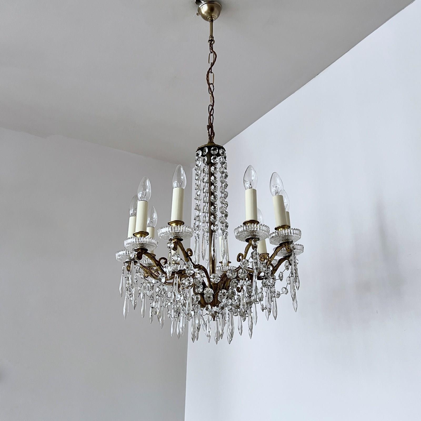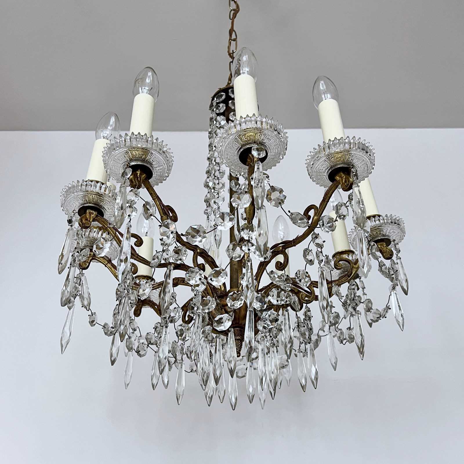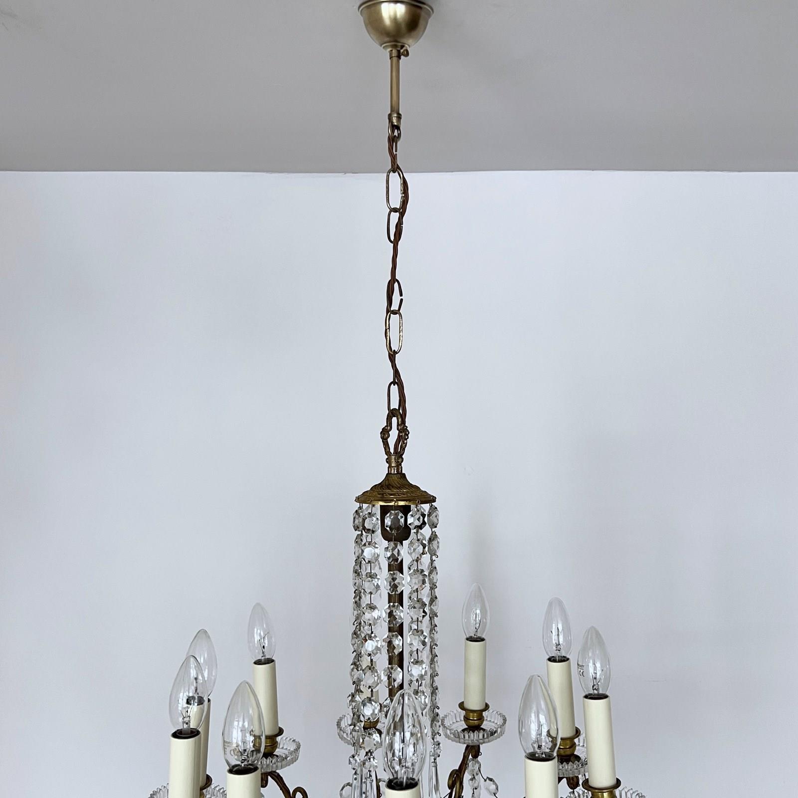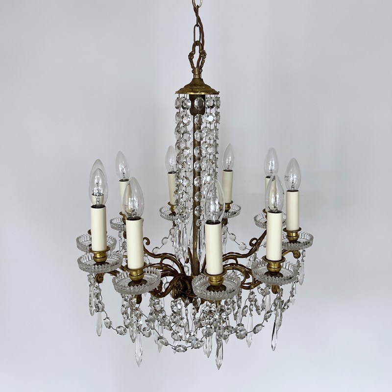 A French decorative brass chandelier with ten elegant arms. Converted from a candelabra this brass chandelier dates from the early 1900’s. It retains all of its original glass drops as well as unique glass button swags between the arms. The chandelier comes supplied with braided flex, chain, a ceiling rose and a chandelier hook plate. Chandelier requires SES lamps, these are not included but can be supplied.