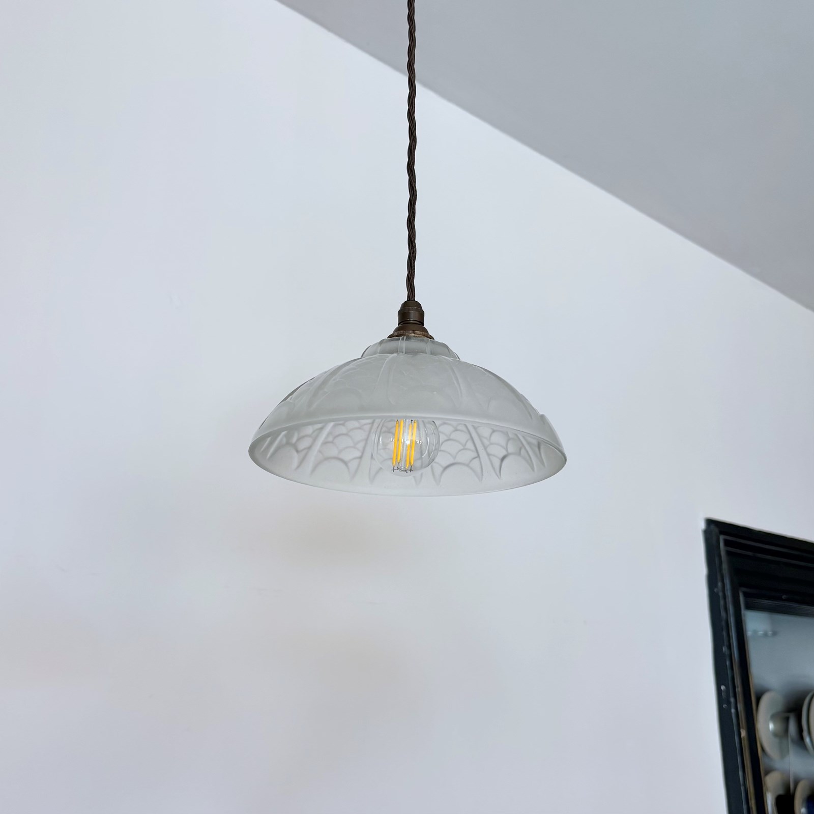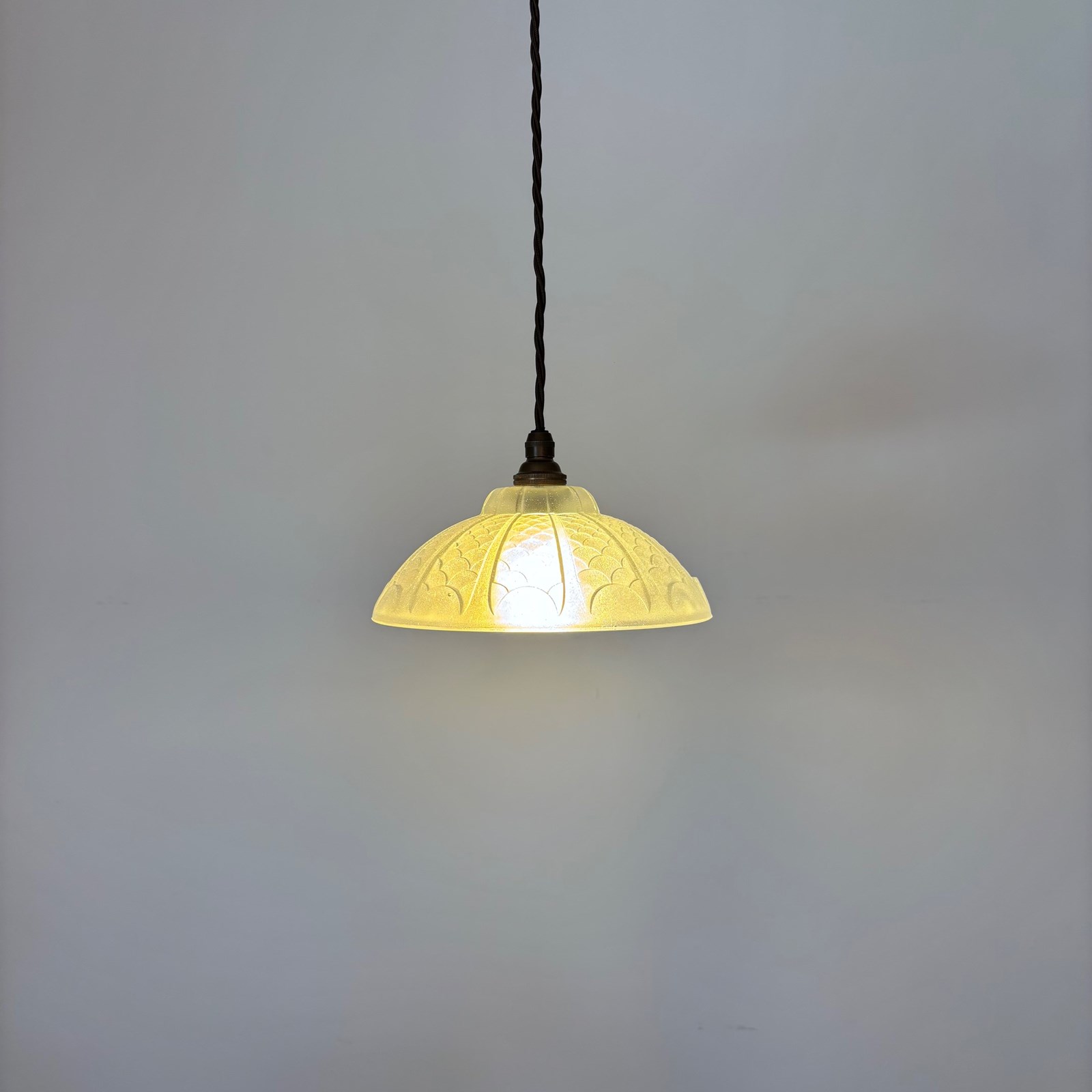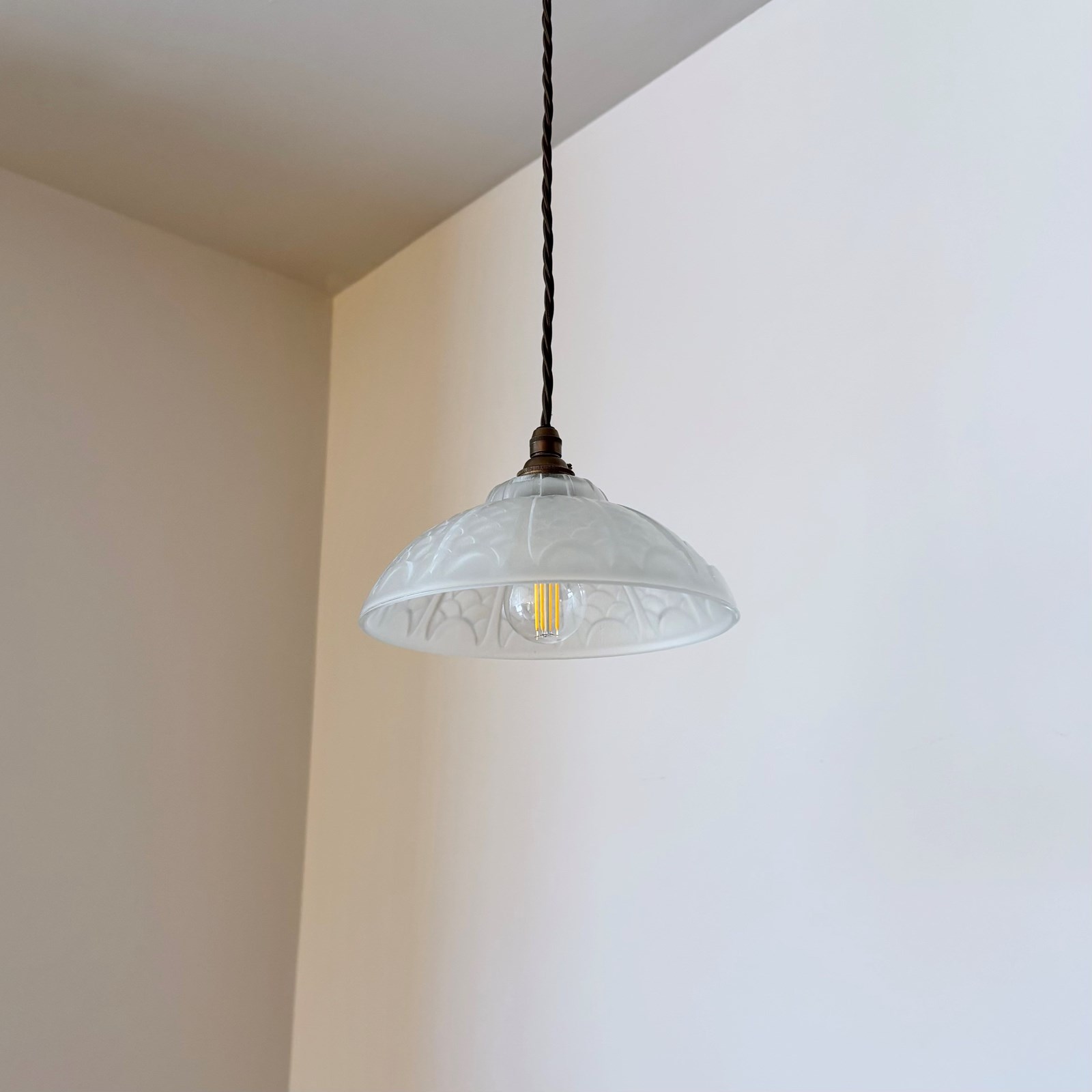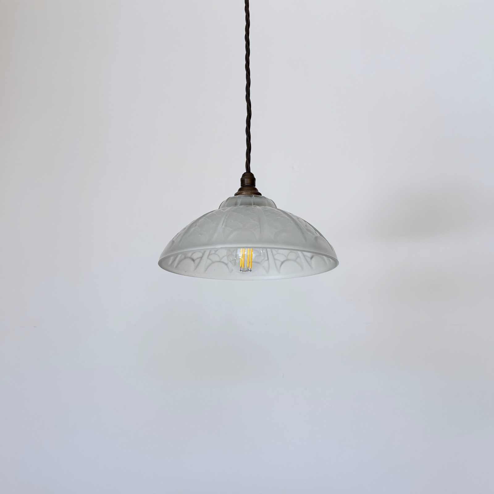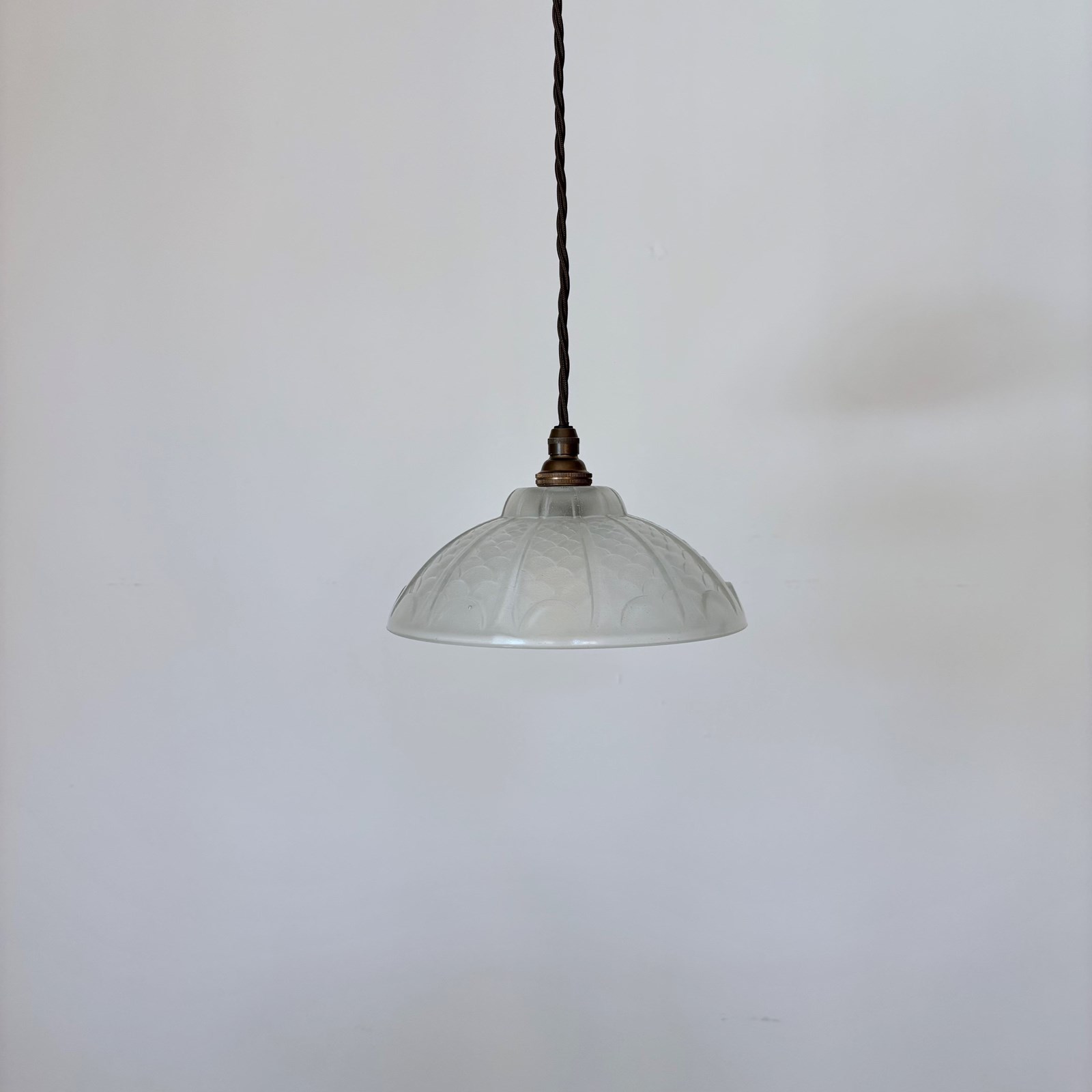 French Deco moulded glass shade. Rewired with an antique brass finish lamp holder and dark brown braided flex. The shade requires one B22 lamp. This is not included but can be supplied. The coloured flex can be changed to your preference and a matching ceiling fitting is supplied.