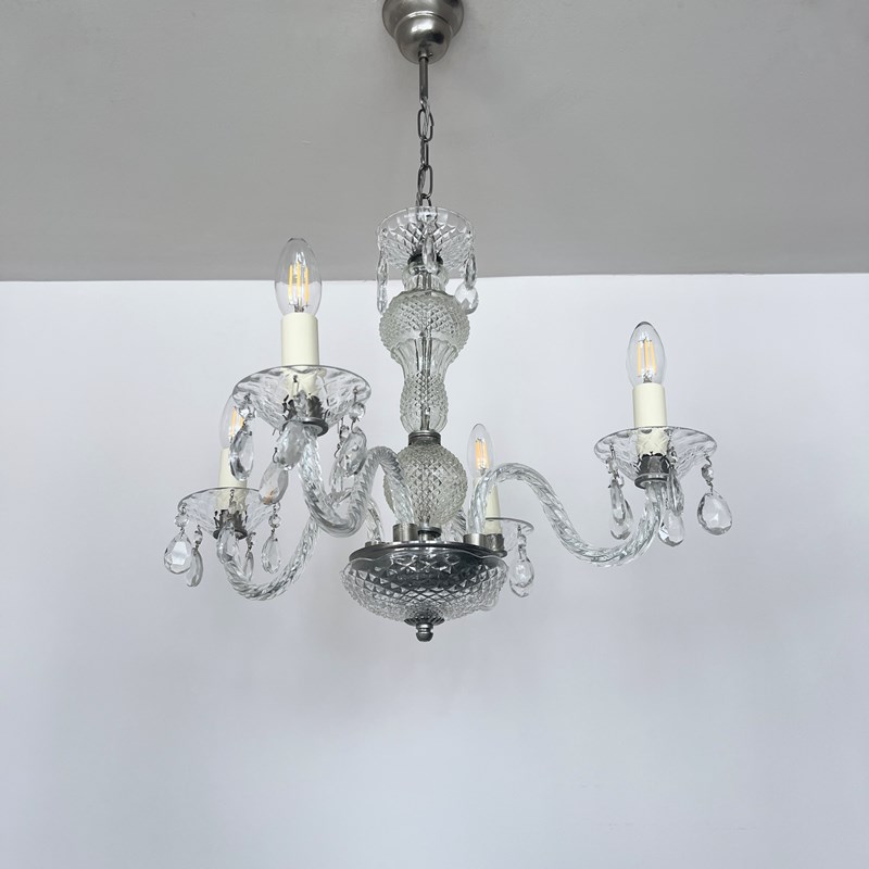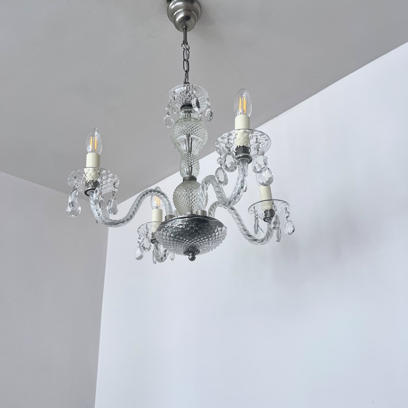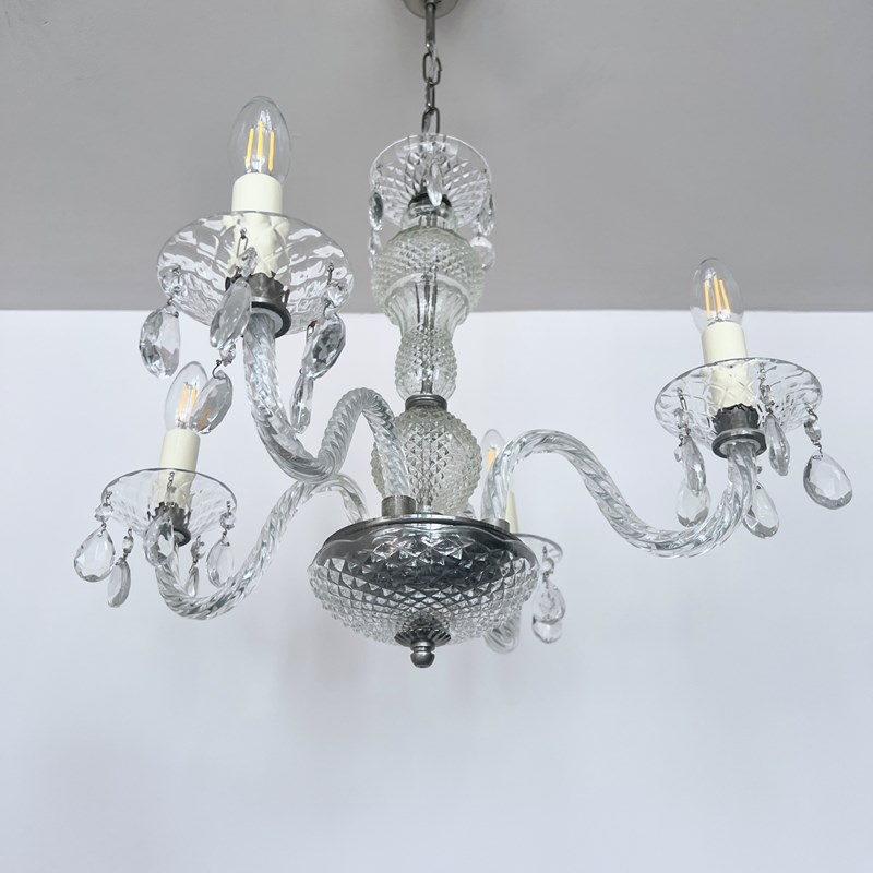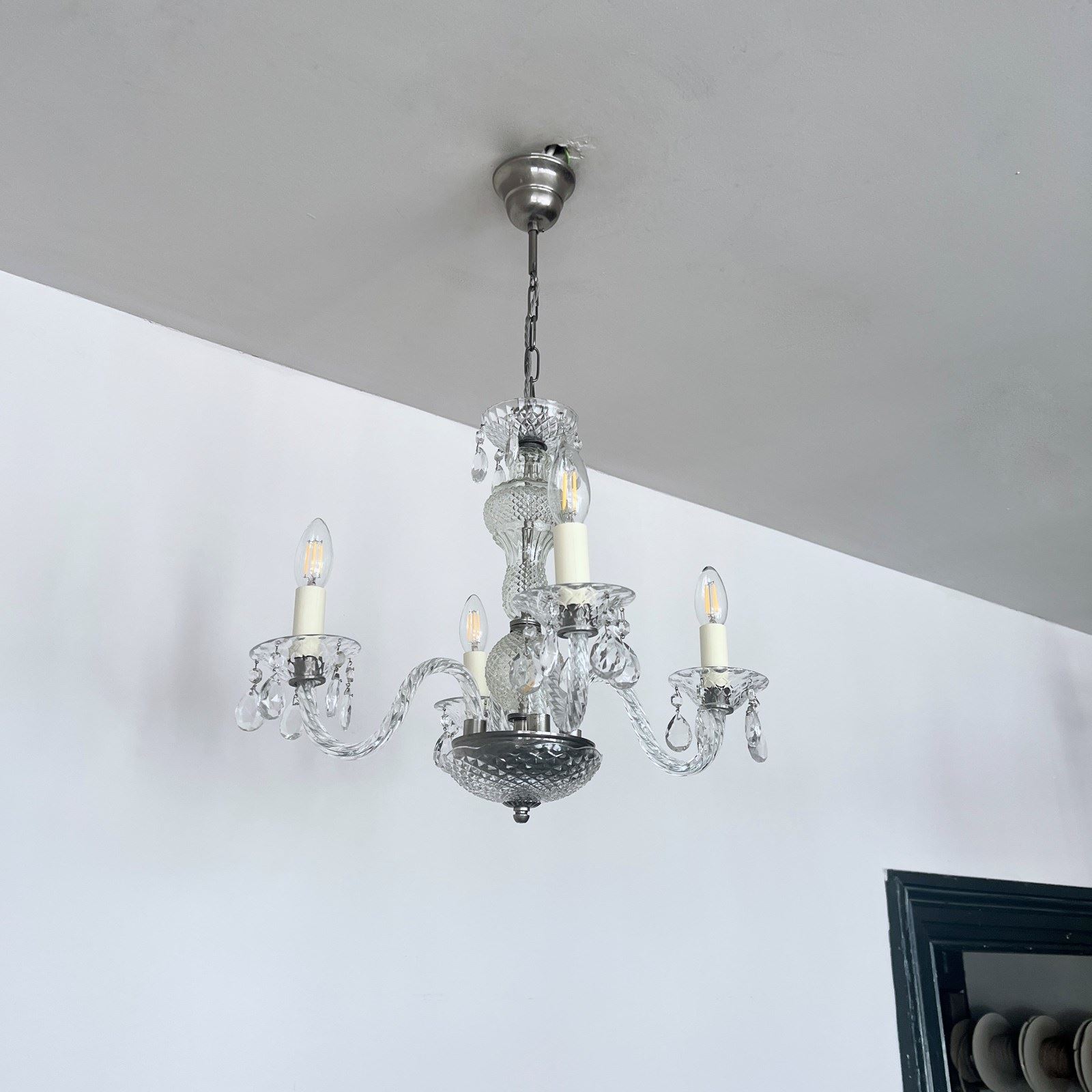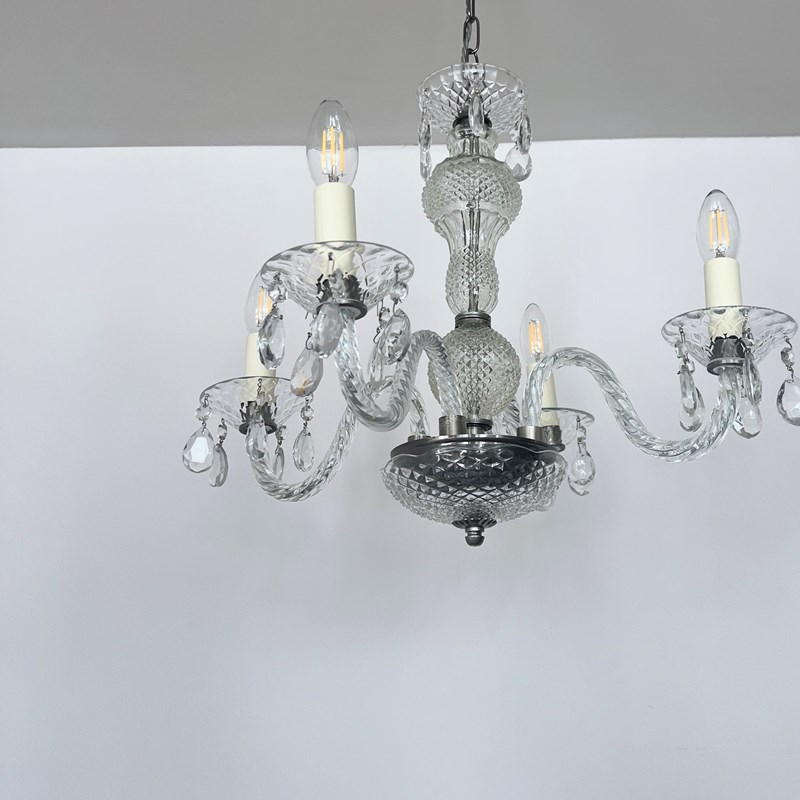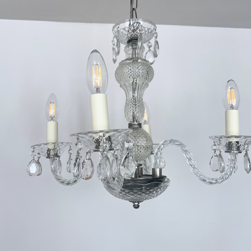 This glass chandelier originates from mid 20th Century France. It has a large glass stem and base with faceted glass details. It has five elegant glass swan neck arms each holding a lamp. Dressed in cut glass pear drops. The chandelier comes supplied with braided flex and chrome chain, ceiling rose and a chandelier hook plate. Chandelier requires SES lamps, these are not included but can be supplied.