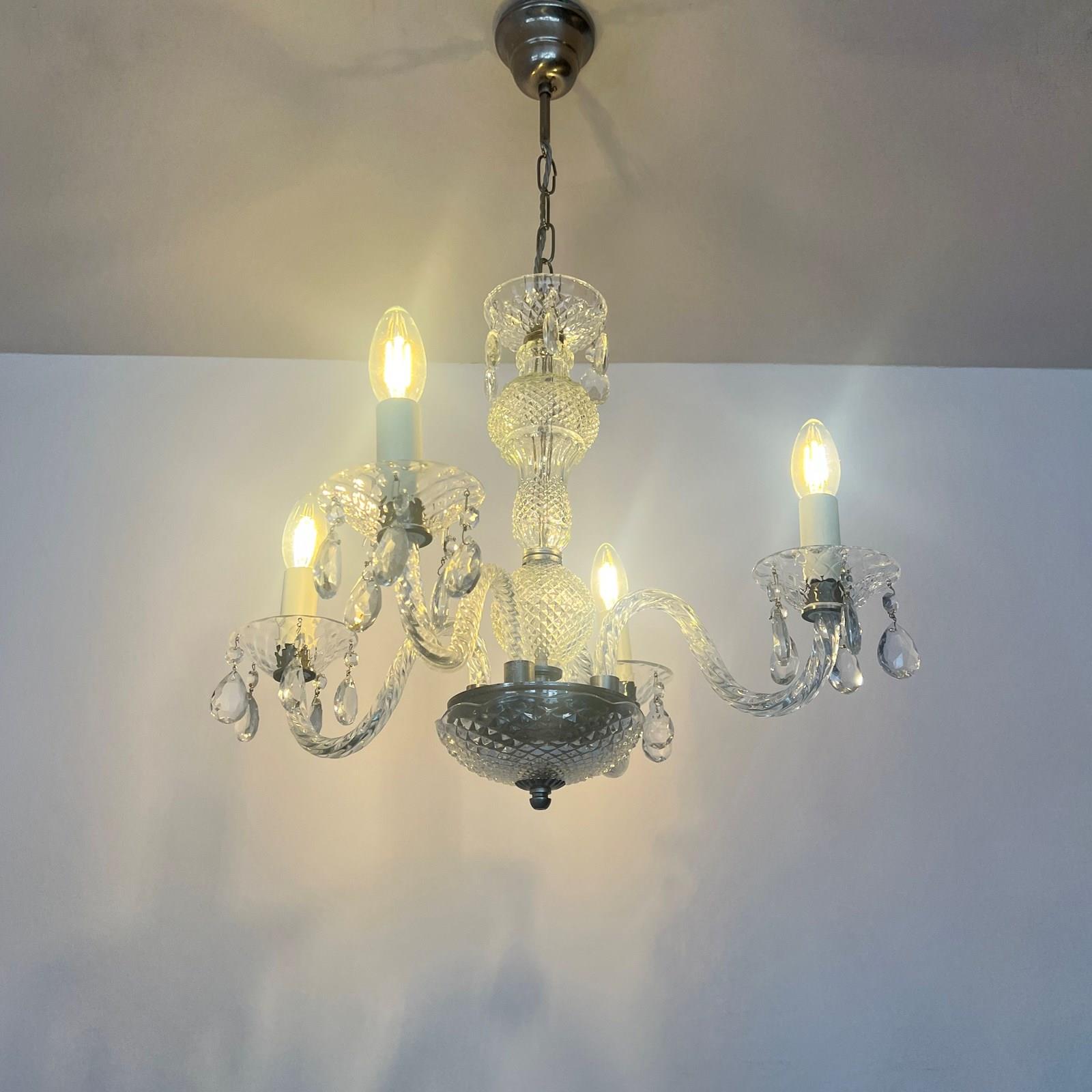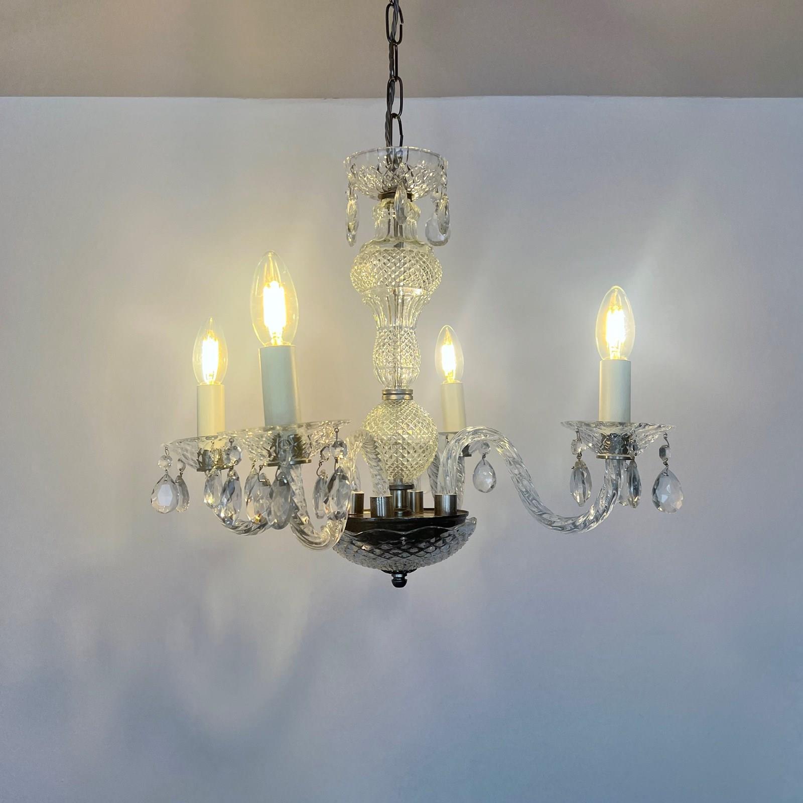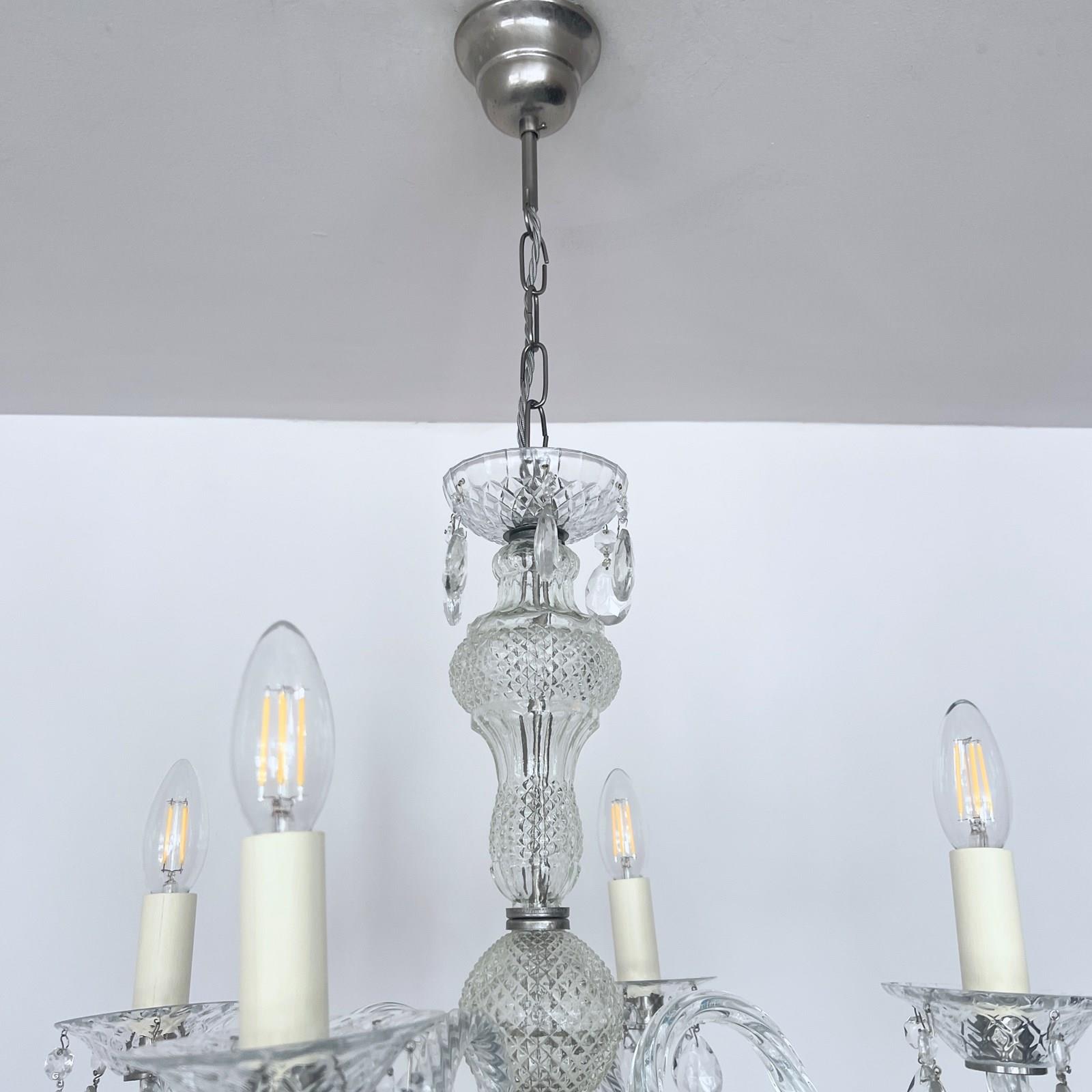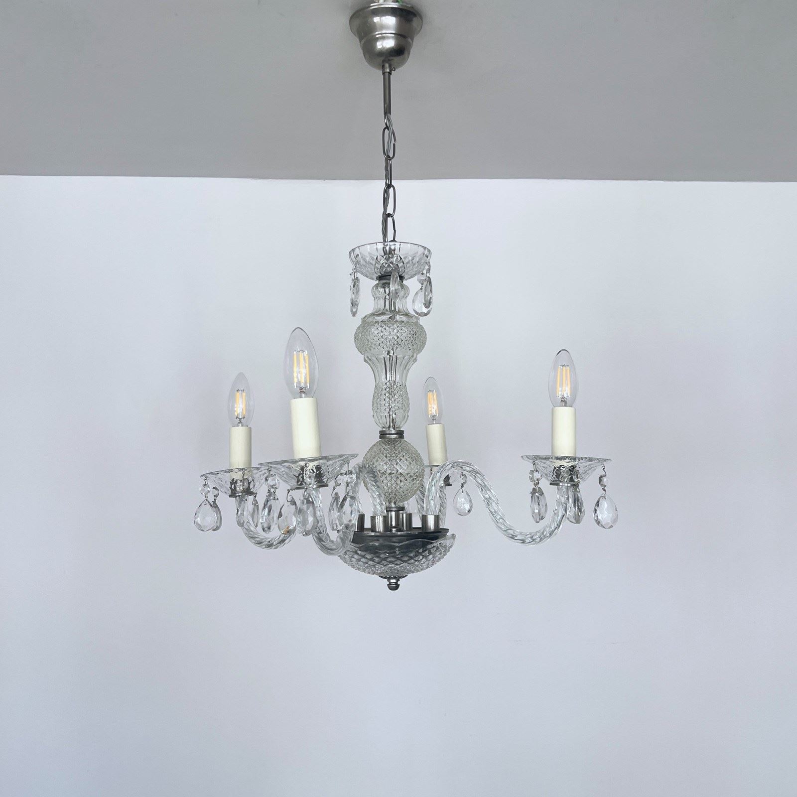 This glass chandelier originates from mid 20th Century France. It has a large glass stem and base with faceted glass details. It has five elegant glass swan neck arms each holding a lamp. Dressed in cut glass pear drops. The chandelier comes supplied with braided flex and chrome chain, ceiling rose and a chandelier hook plate. Chandelier requires SES lamps, these are not included but can be supplied.