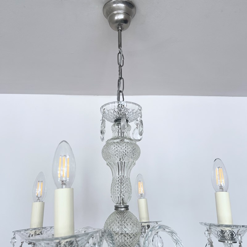 This chandelier has been fully restored and rewired here, in Stockport, near Manchester by our small team of experts and is now ready to be installed. We recommend that this chandelier is installed by an electrician and into a joist or a supporting noggin. To clean the chandelier dust the glass components regularly with a soft cloth. The glass can then be wiped with a glass wipe or a cloth that has been sprayed with glass cleaner. A final wipe with a paper towel will give a polished finish.