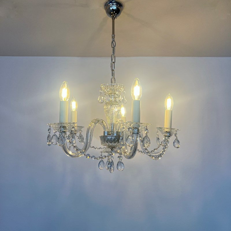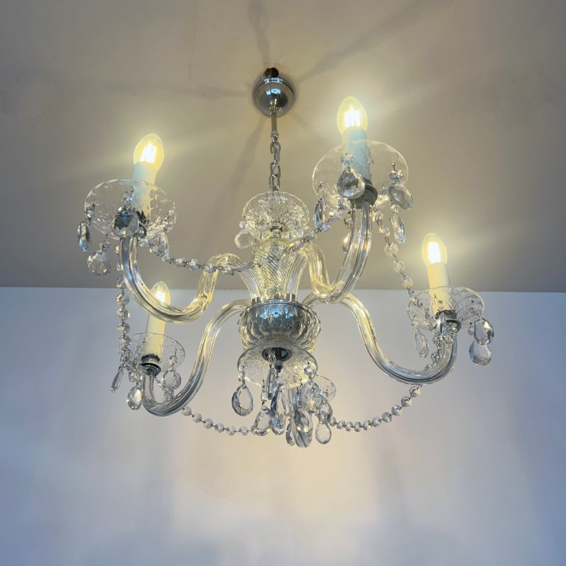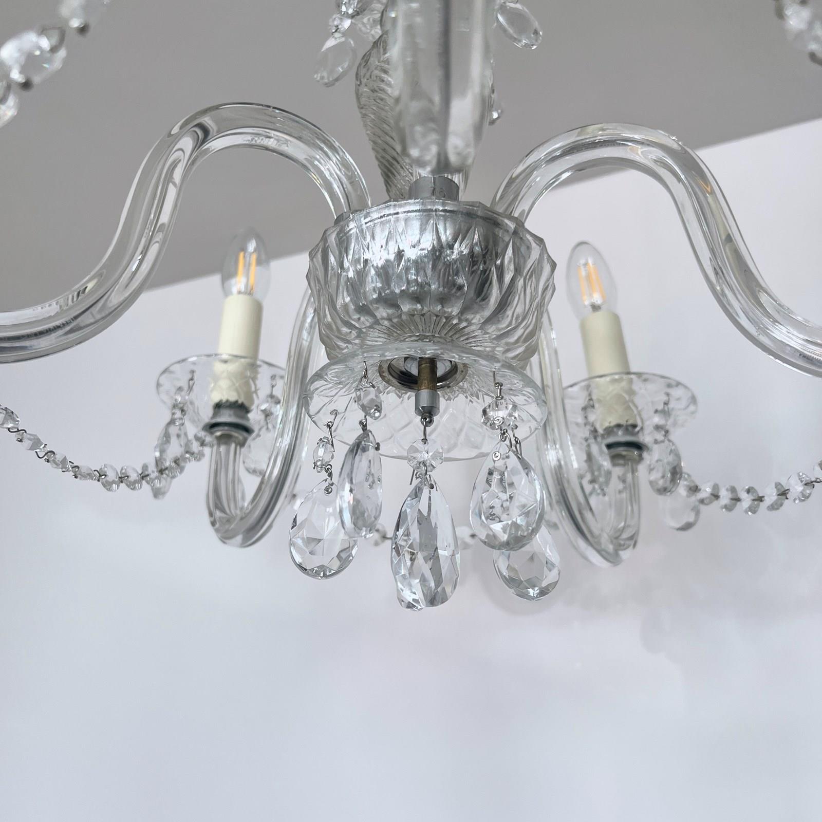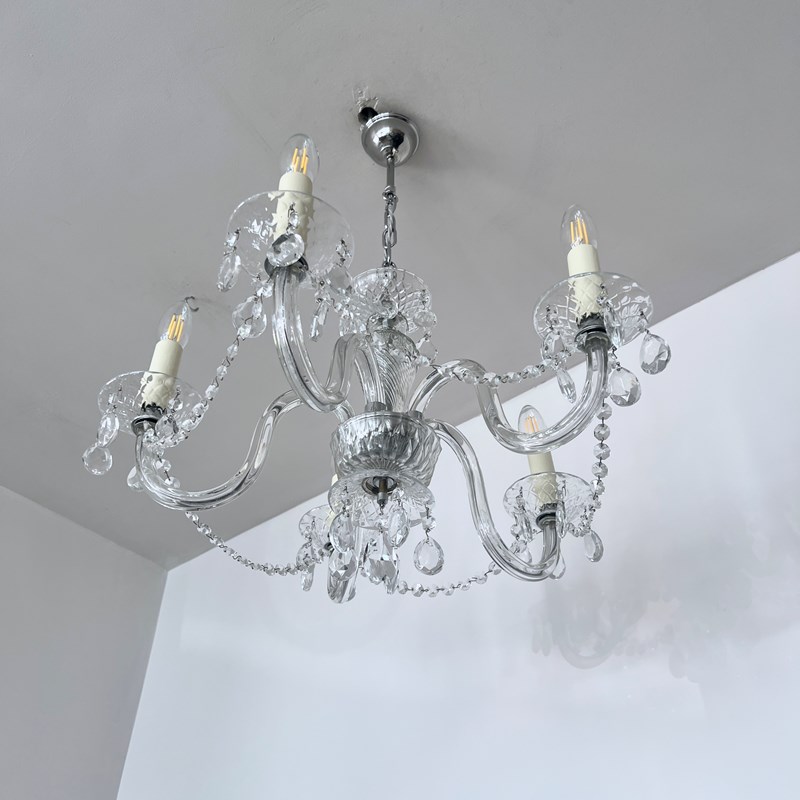 This chandelier has been fully restored and rewired here, in Stockport, near Manchester by our small team of experts and is now ready to be installed. We recommend that this chandelier is installed by an electrician and into a joist or a supporting noggin. To clean the chandelier dust the glass components regularly with a soft cloth. The glass can then be wiped with a glass wipe or a cloth that has been sprayed with glass cleaner. A final wipe with a paper towel will give a polished finish.