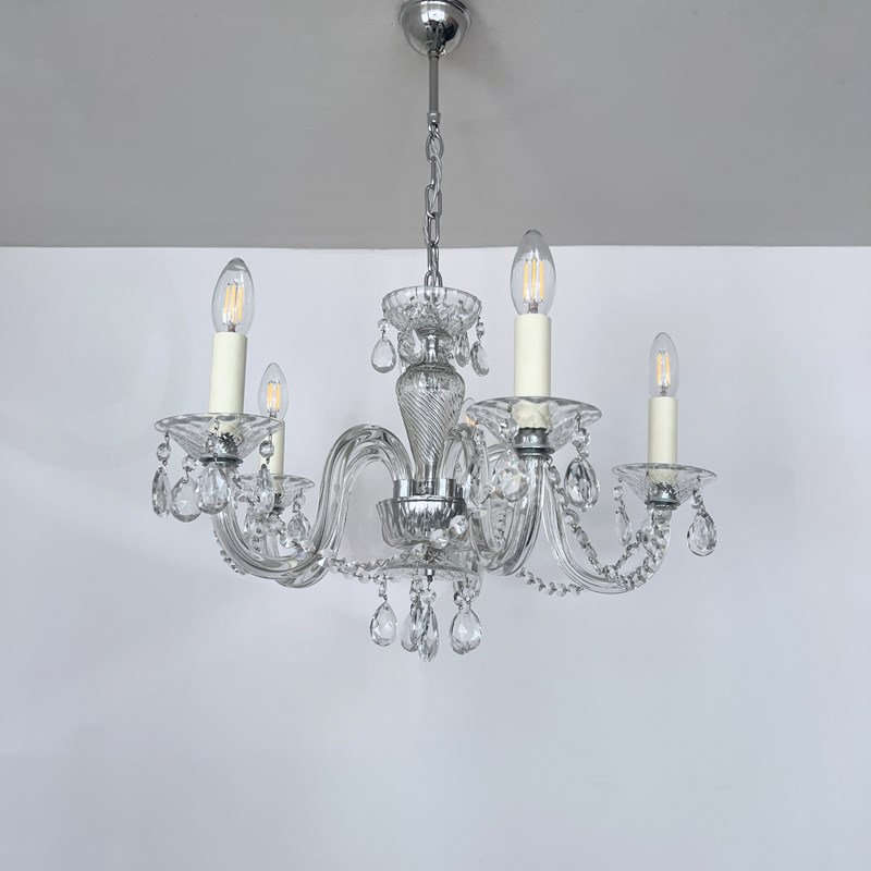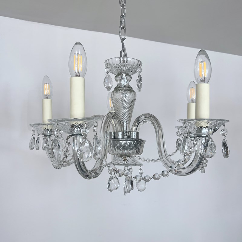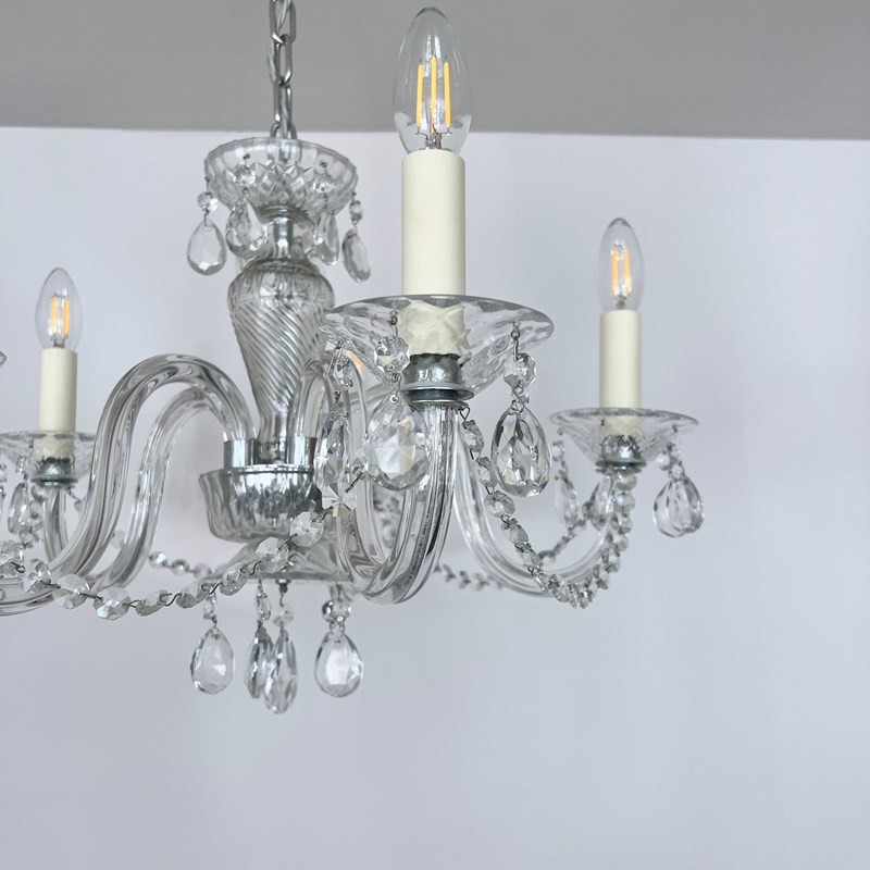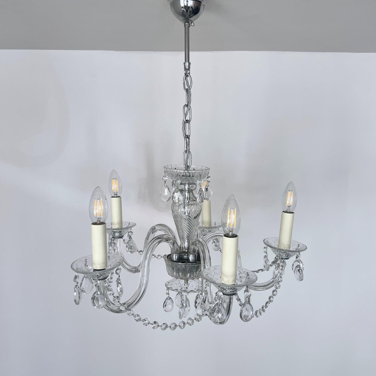 This glass chandelier originates from mid 20th Century France. It has a swirled glass stem and base with faceted glass details. It has five elegant glass swan neck arms each holding a lamp. Dressed in cut glass pear drops. The chandelier comes supplied with braided flex and chrome chain, ceiling rose and a chandelier hook plate. Chandelier requires SES lamps, these are not included but can be supplied.