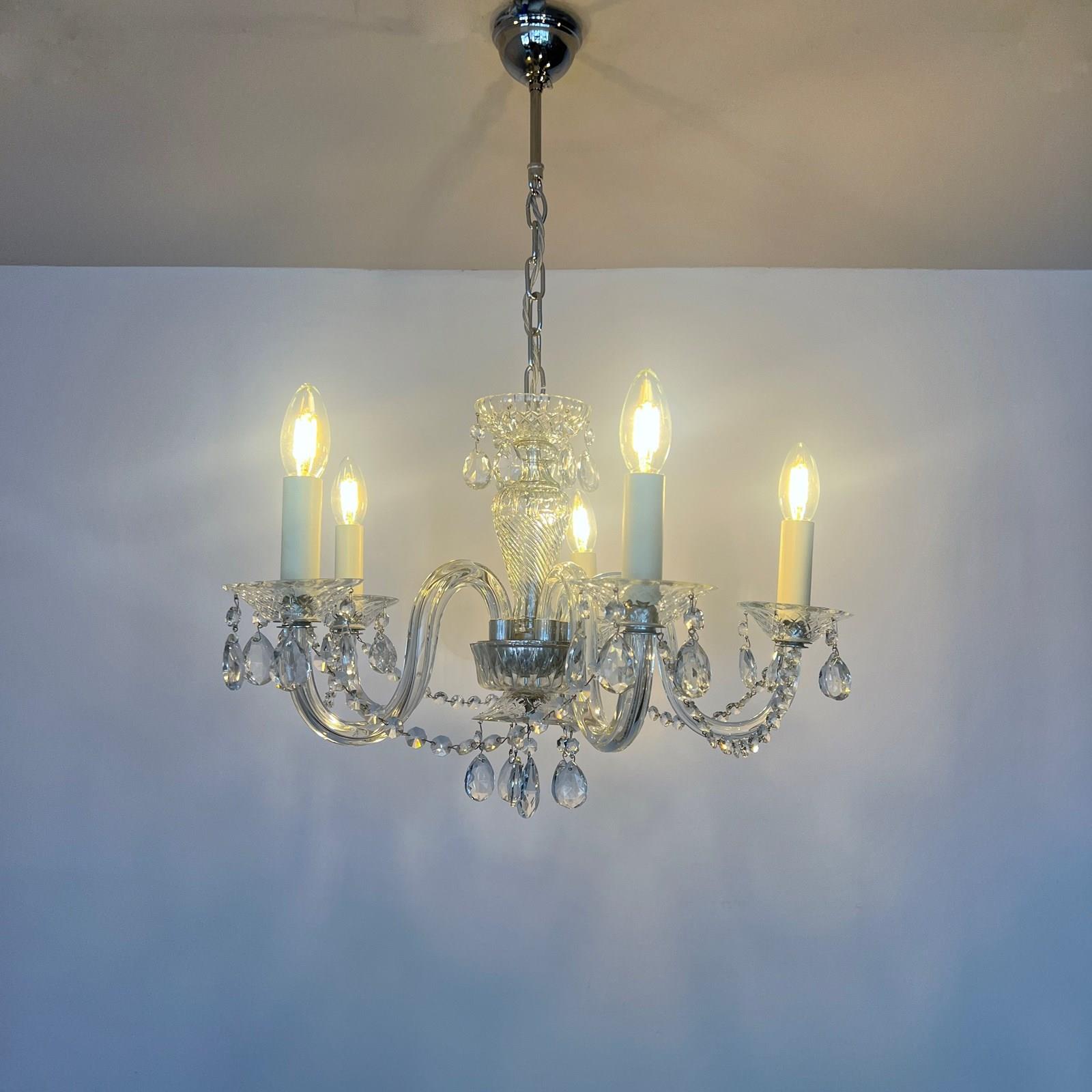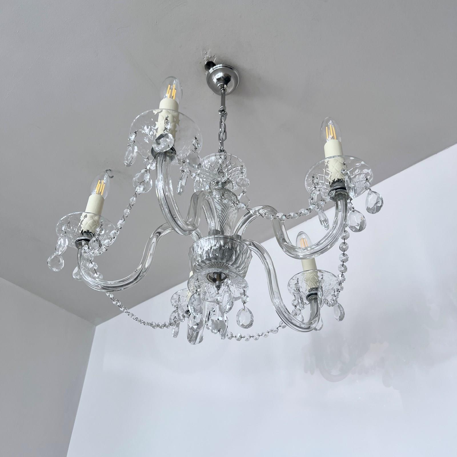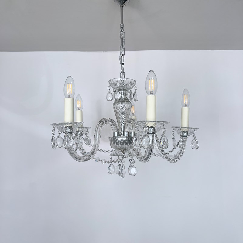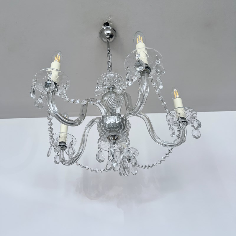 This glass chandelier originates from mid 20th Century France. It has a swirled glass stem and base with faceted glass details. It has five elegant glass swan neck arms each holding a lamp. Dressed in cut glass pear drops. The chandelier comes supplied with braided flex and chrome chain, ceiling rose and a chandelier hook plate. Chandelier requires SES lamps, these are not included but can be supplied.