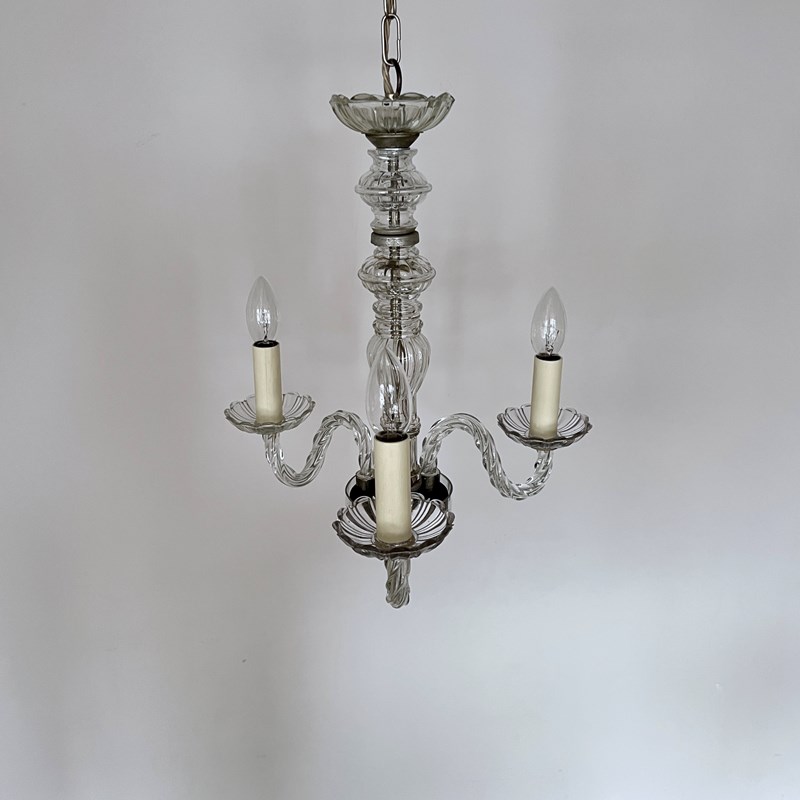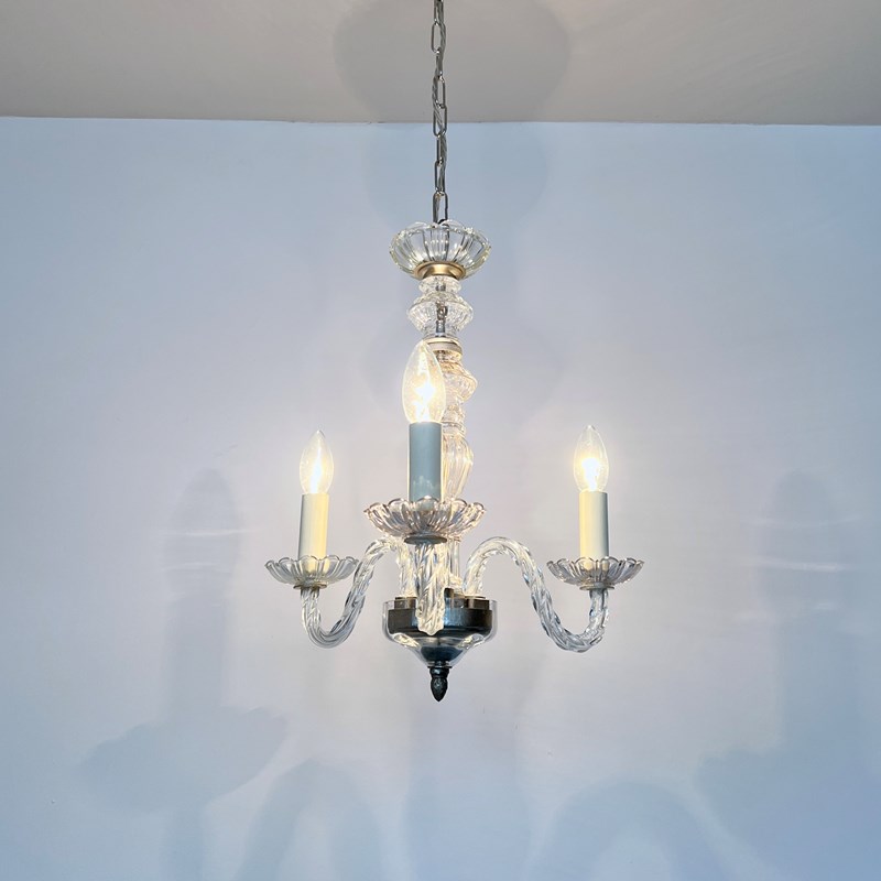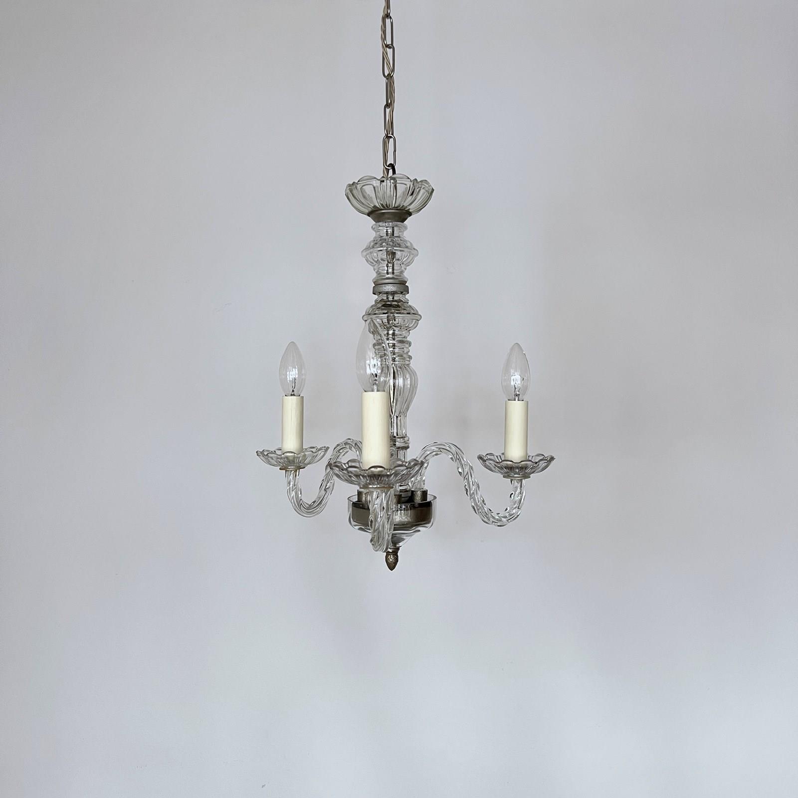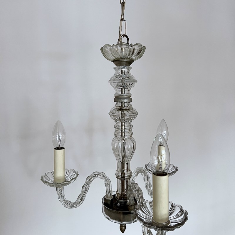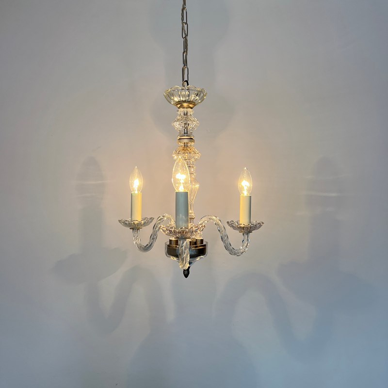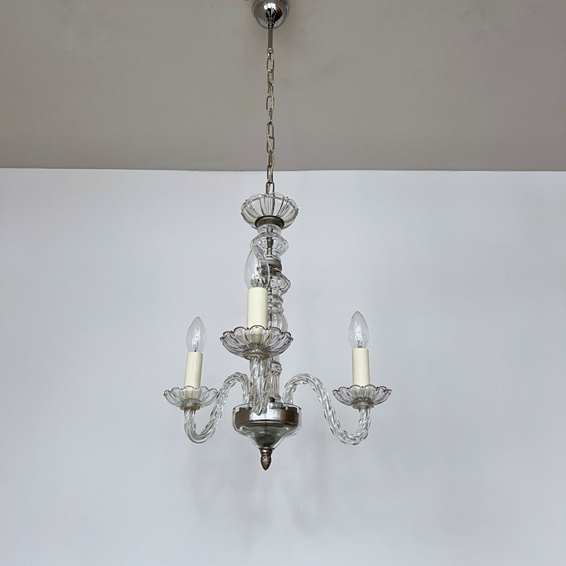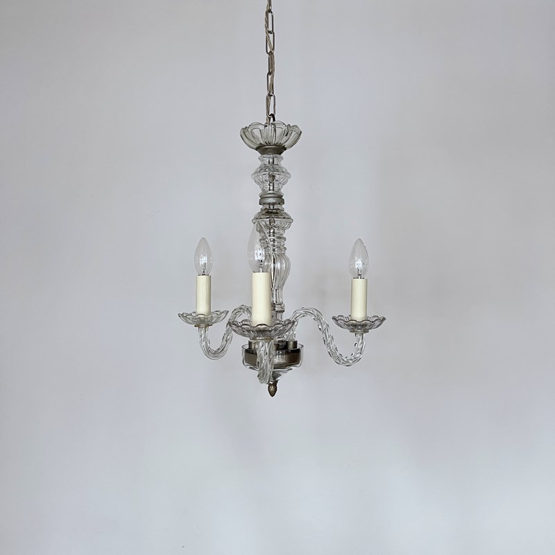 This glass chandelier originates from mid 20th Century France. It has a large glass stem and clear glass base . It has three elegant twisted glass swan neck arms each holding a lamp. The chandelier comes supplied with braided flex and chrome chain, ceiling rose and a chandelier hook plate. Chandelier requires SES lamps, these are not included but can be supplied.