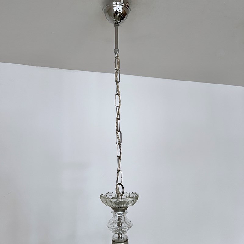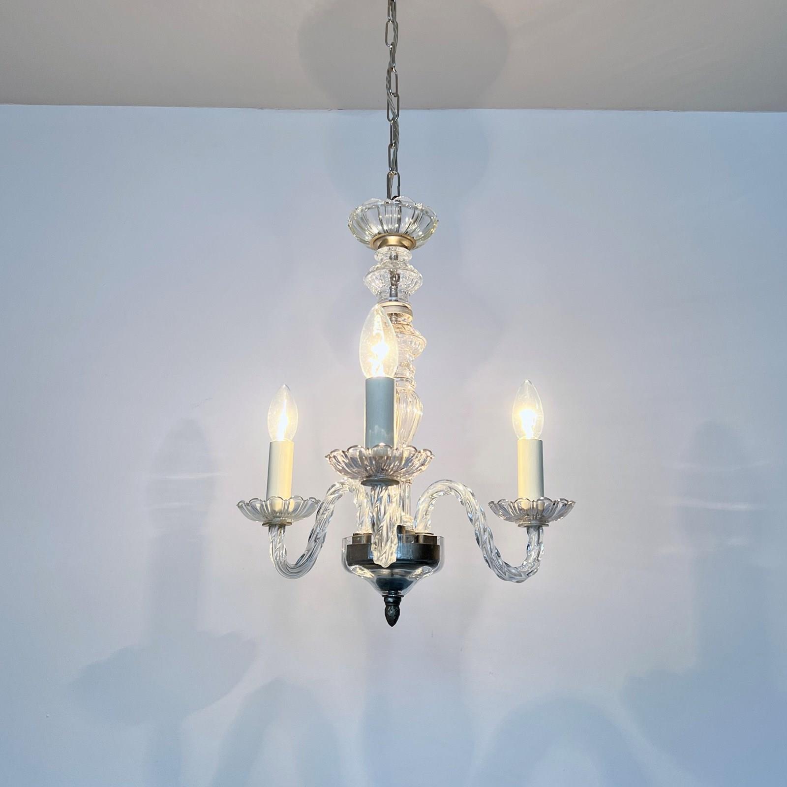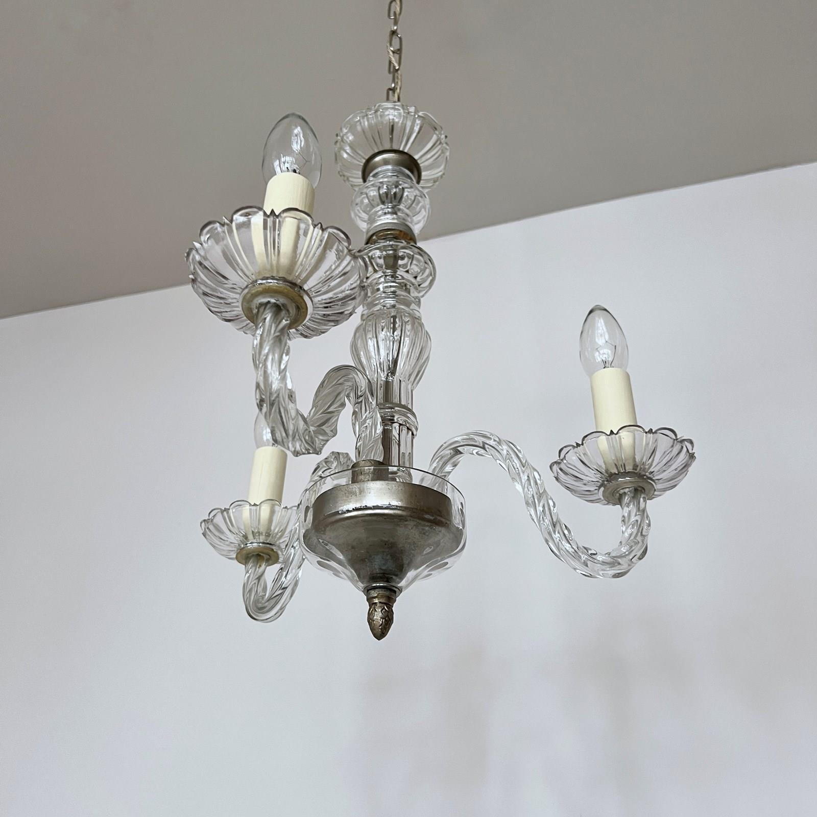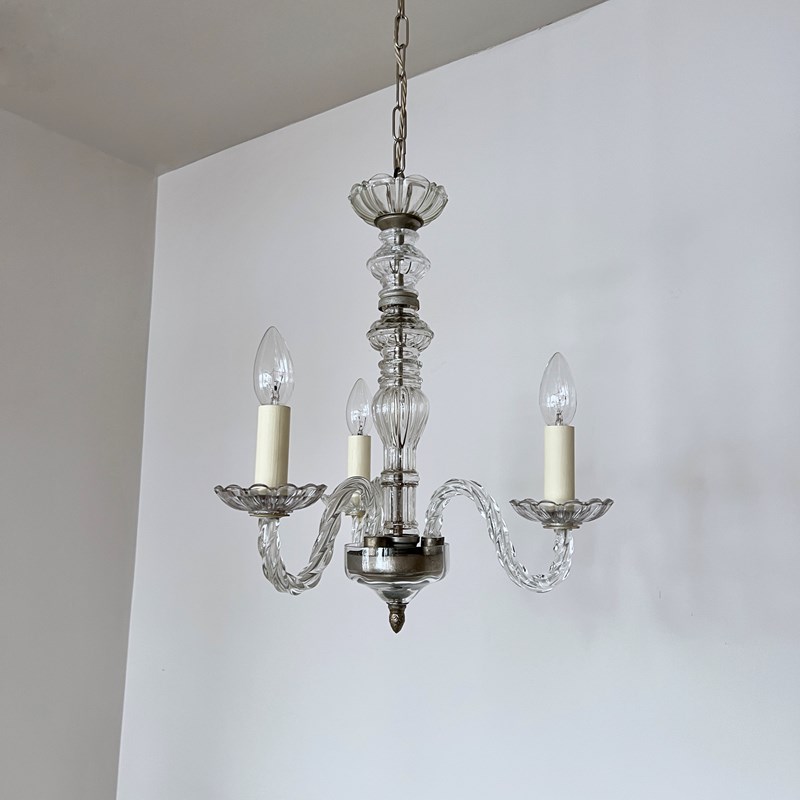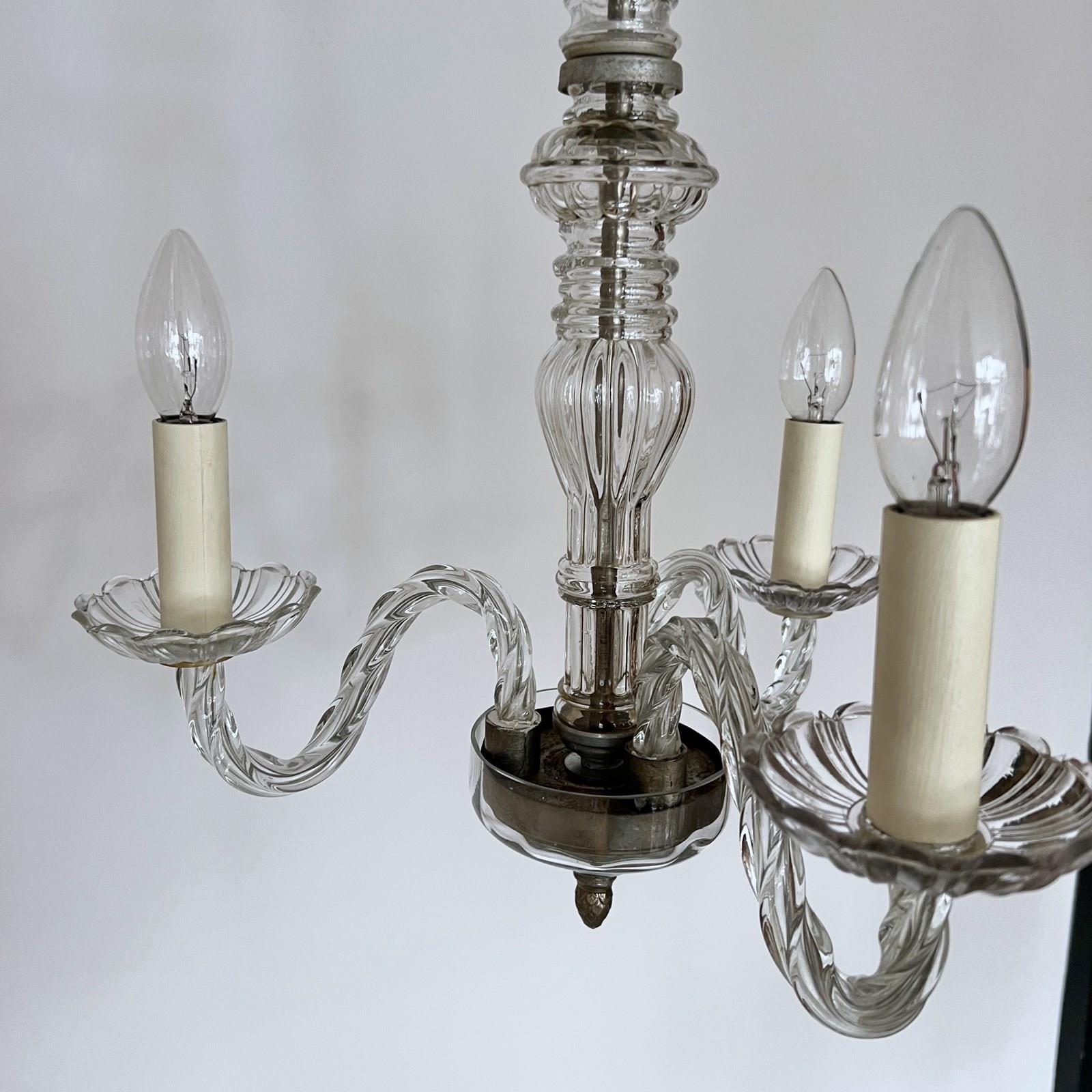 This glass chandelier originates from mid 20th Century France. It has a large glass stem and clear glass base . It has three elegant twisted glass swan neck arms each holding a lamp. The chandelier comes supplied with braided flex and chrome chain, ceiling rose and a chandelier hook plate. Chandelier requires SES lamps, these are not included but can be supplied.