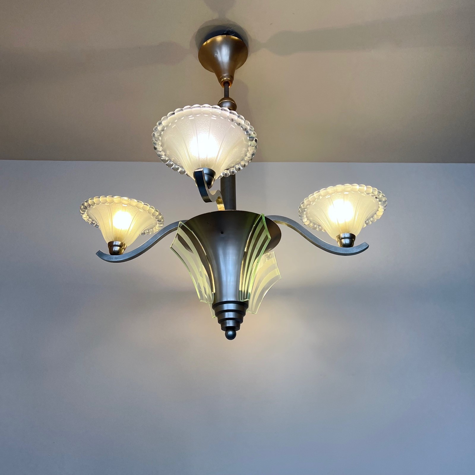 Elegant mid century chandelier with five clear glass textured shades. The chandelier requires BC lamps, these are not included and it fits directly to the ceiling. This chandelier has been fully restored and rewired here, in Stockport, near Manchester by our small team of experts and is now ready to be installed. We recommend that this pendant is installed by an electrician and into a joist or a supporting noggin. To clean the pendant dust the metal components regularly with a soft cloth. The shades can then be wiped with a glass wipe or a cloth that has been sprayed with glass cleaner. A final wipe with a paper towel will give a polished finish.