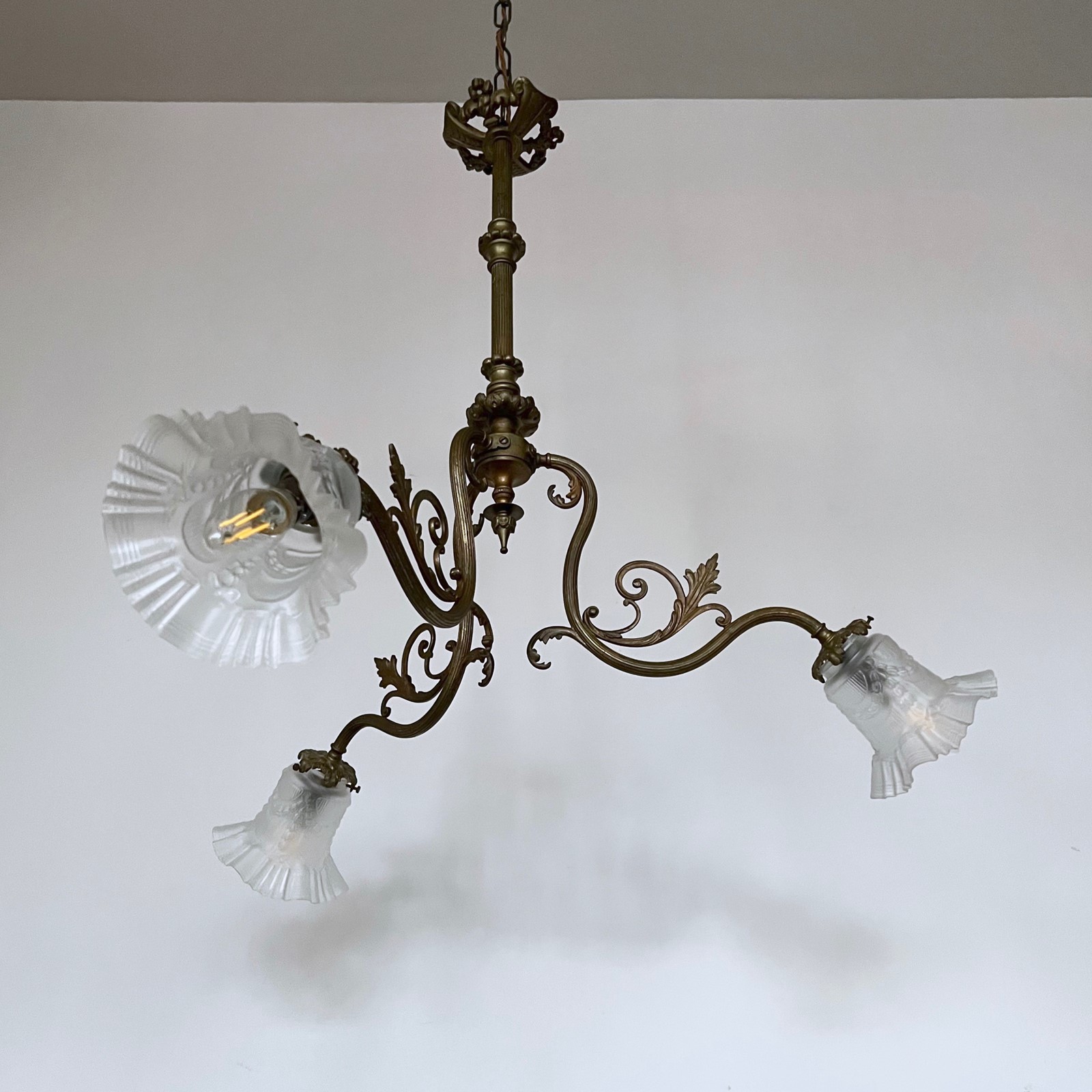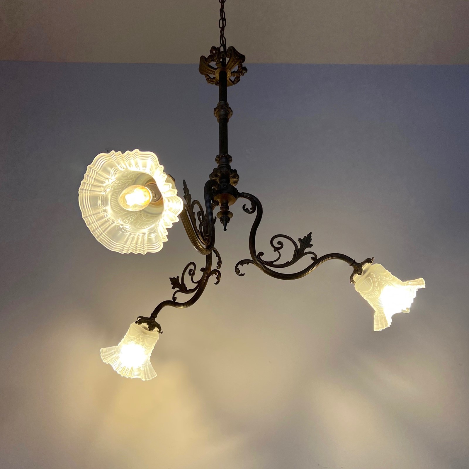 Large French brass downlighter with delicate frosted frilled shades. The chandelier comes rewired with braided flex, chain a matching ceiling rose and a chandelier hook plate. Chandelier requires three B22 lamps, these are not included. This chandelier has been fully restored and rewired here, in Stockport, near Manchester by our small team of experts and is now ready to be installed. We recommend that this chandelier is installed by an electrician into a joist or a supporting noggin. To clean the chandelier dust the metal components regularly with a soft cloth. The glass shades can then be wiped with a glass wipe or a cloth that has been sprayed with glass cleaner. A final wipe with a paper towel will give a polished finish.