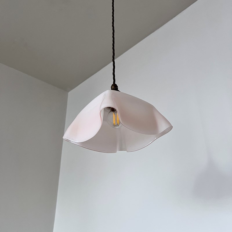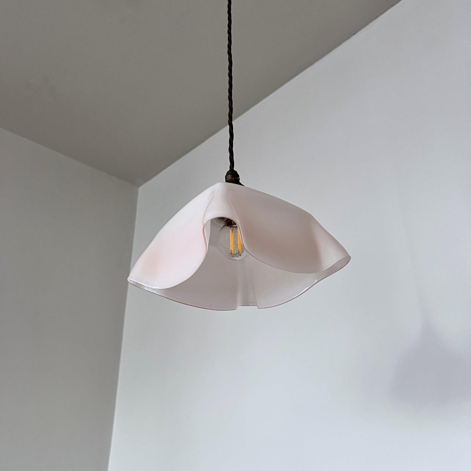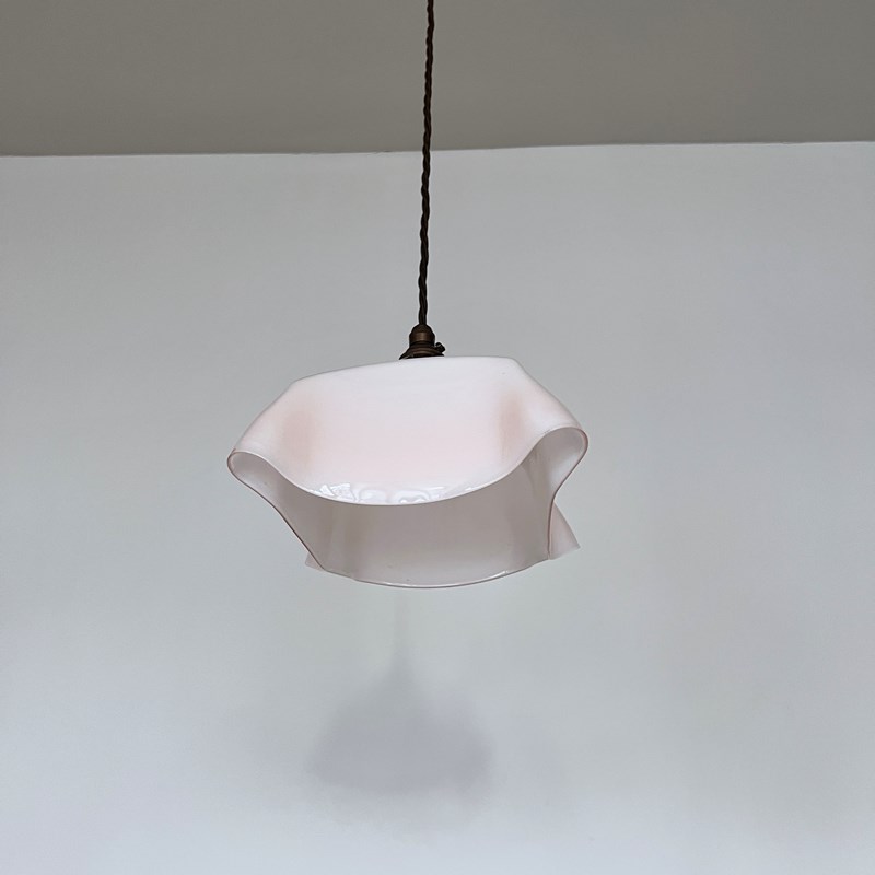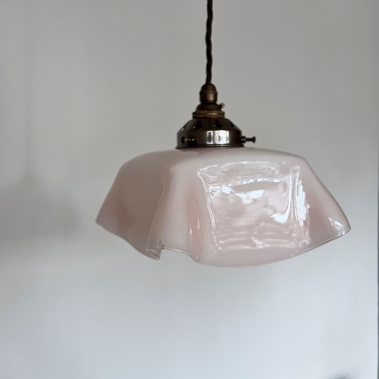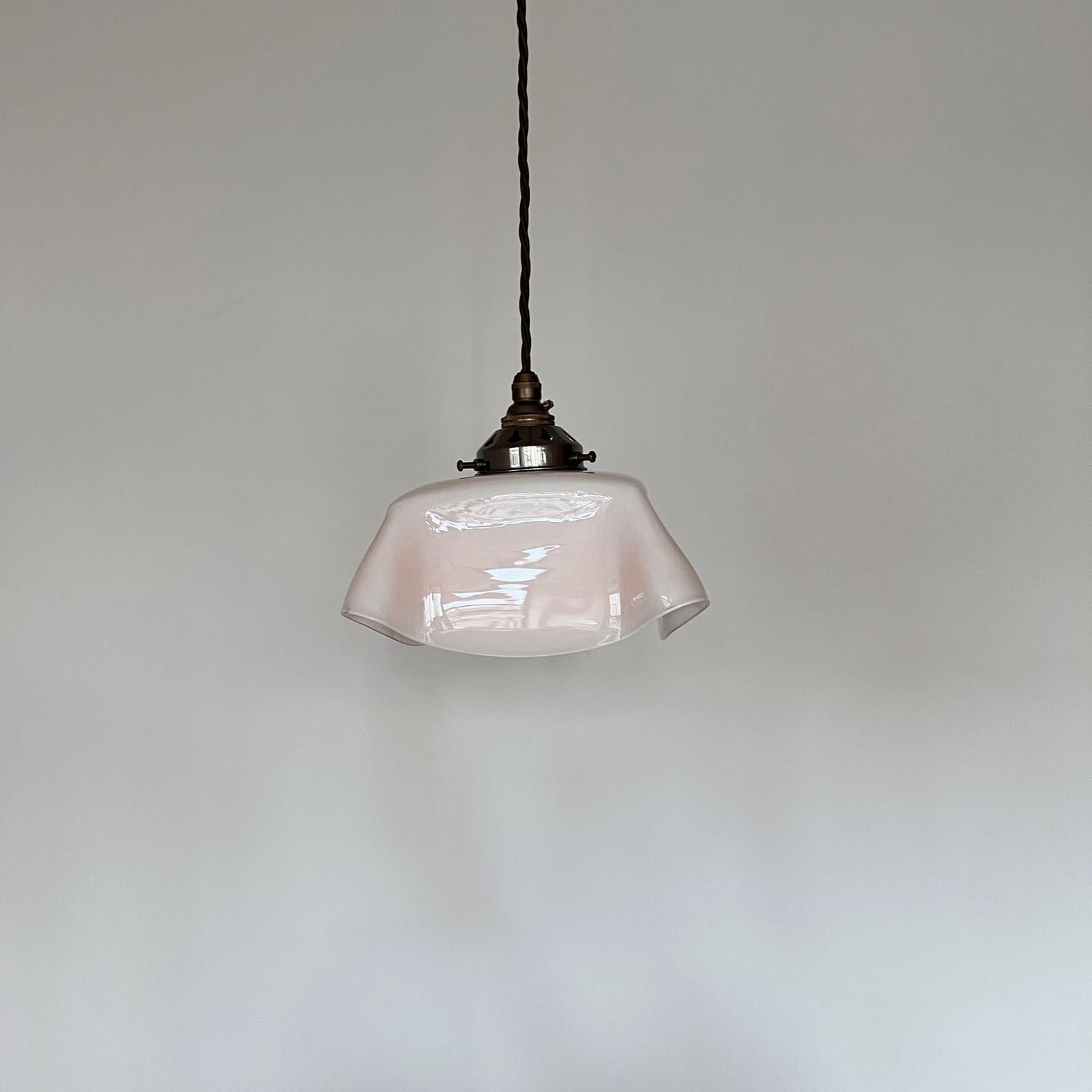 French pastel pink glass shade. Rewired with an antique fitting and dark brown braided flex. The coloured braided flex can be changed to your preference and a matching ceiling fitting is supplied. The shade requires one b22 bulb. This is not included but can be supplied.