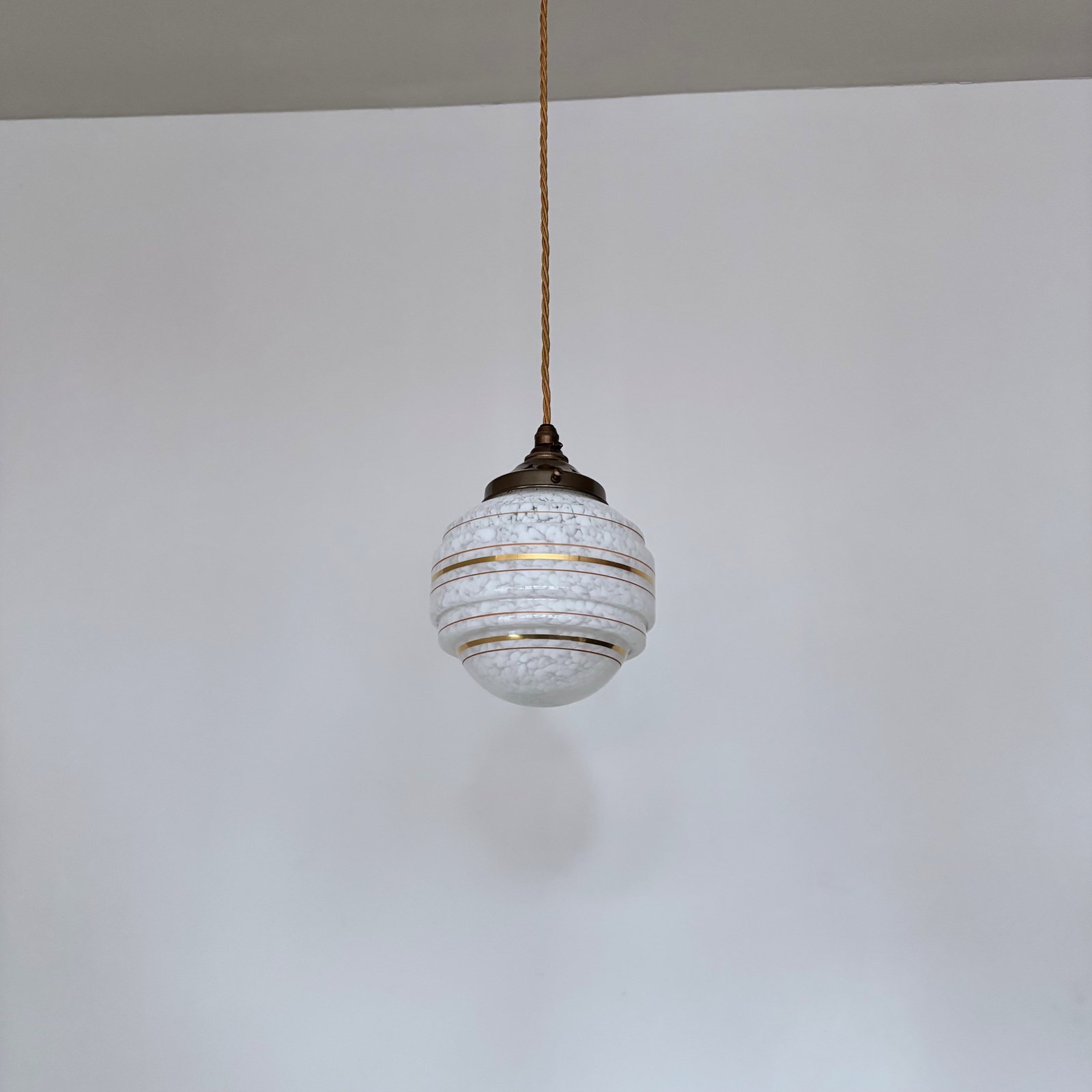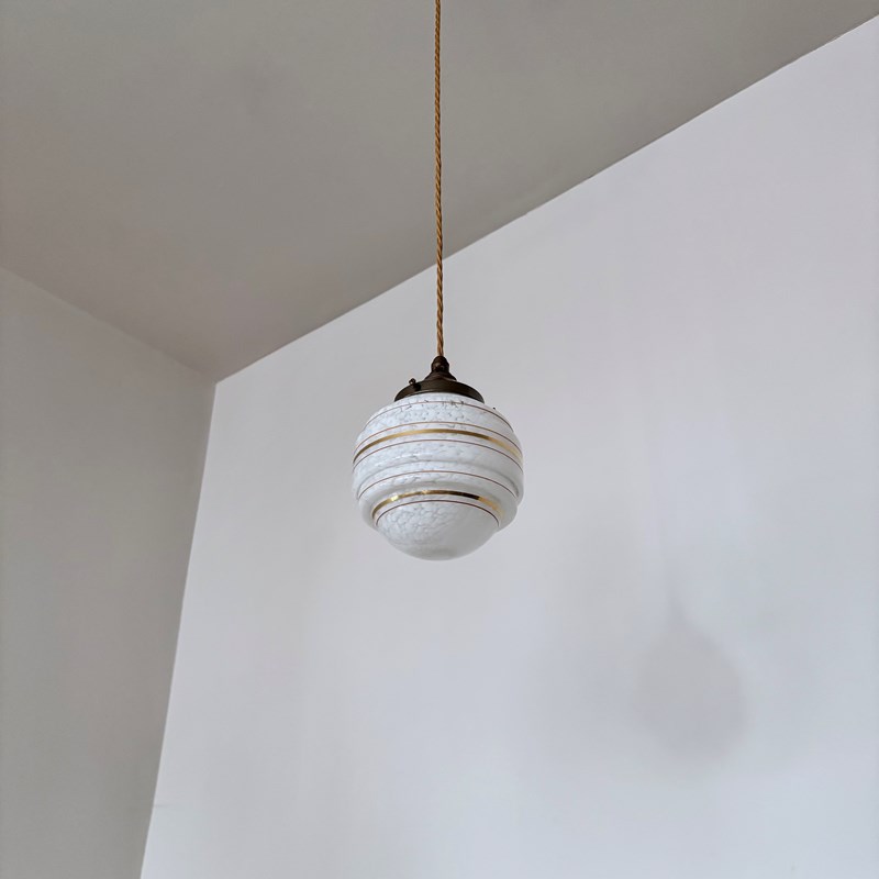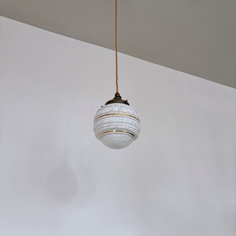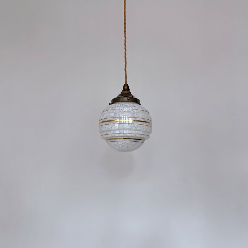 Clichy mottled white glass globe shade finished with an antique brass finish fitting and whiskey braided cable. The coloured braided flex can be changed to your preference and a matching ceiling fitting is supplied.