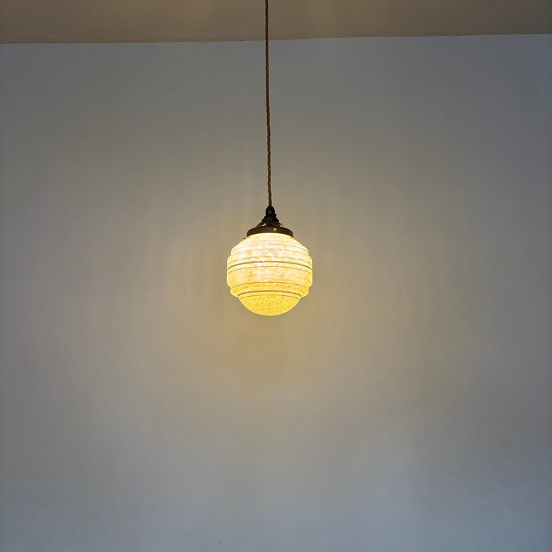 This shade has been fully rewired here, in Stockport, near Manchester by our small team of experts and is now ready to be installed. We recommend that this is installed by an electrician into a joist or a supporting noggin. To clean dust the flex and brass components regularly with a soft cloth. The glass shade can then be wiped with a glass wipe or a cloth that has been sprayed with glass cleaner. A final wipe with a paper towel will give a polished finish.