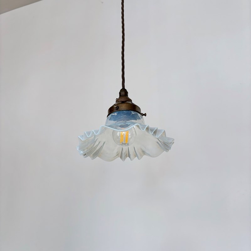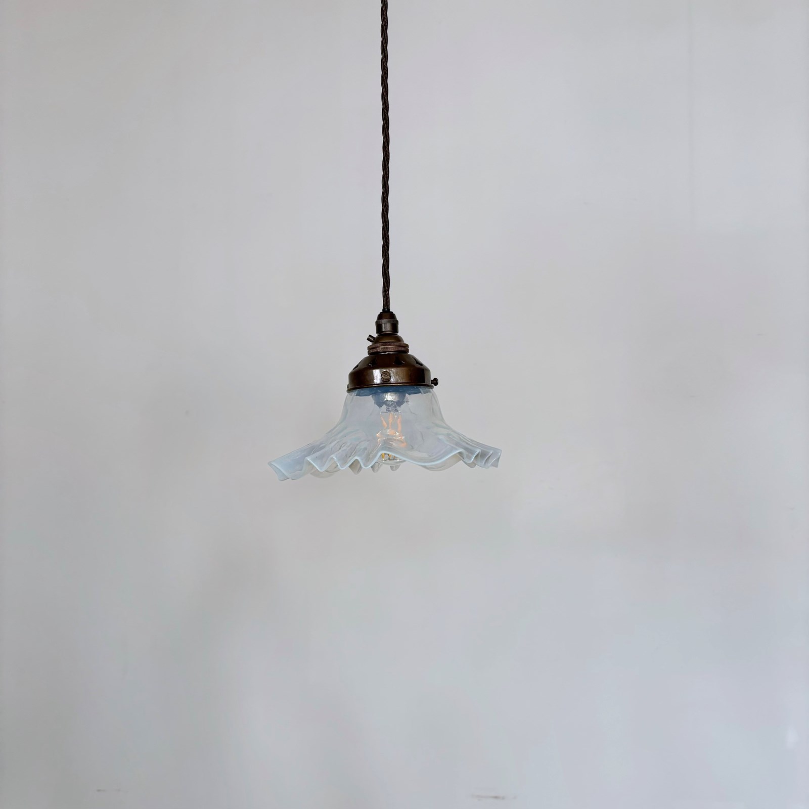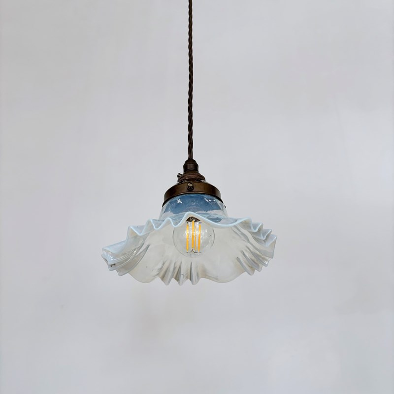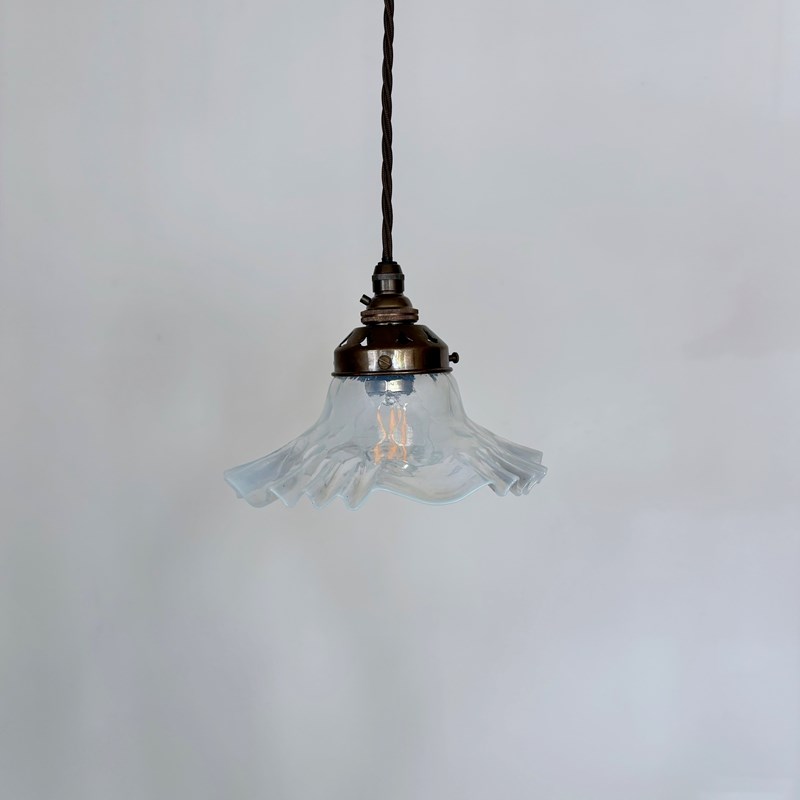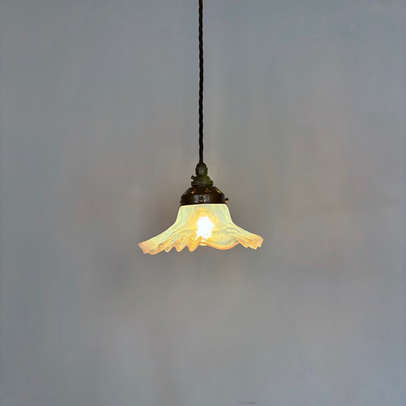 Small frilled Vaseline iridescent glass shade. Rewired with an antique brass finish lamp holder and dark brown braided cable. The shade requires one b22 lamp, this is not included. The coloured cable can be changed to your preference and a matching ceiling fitting is supplied.