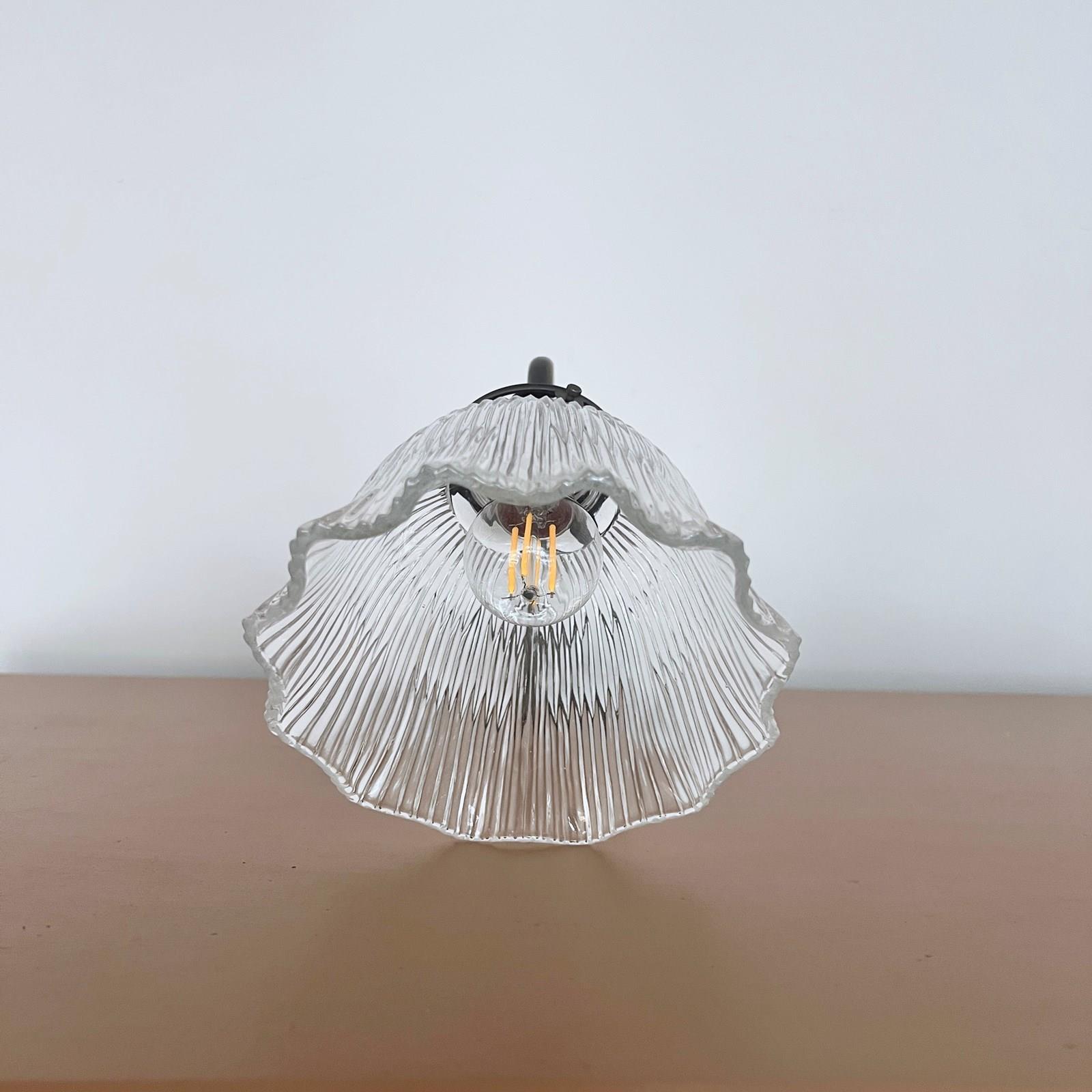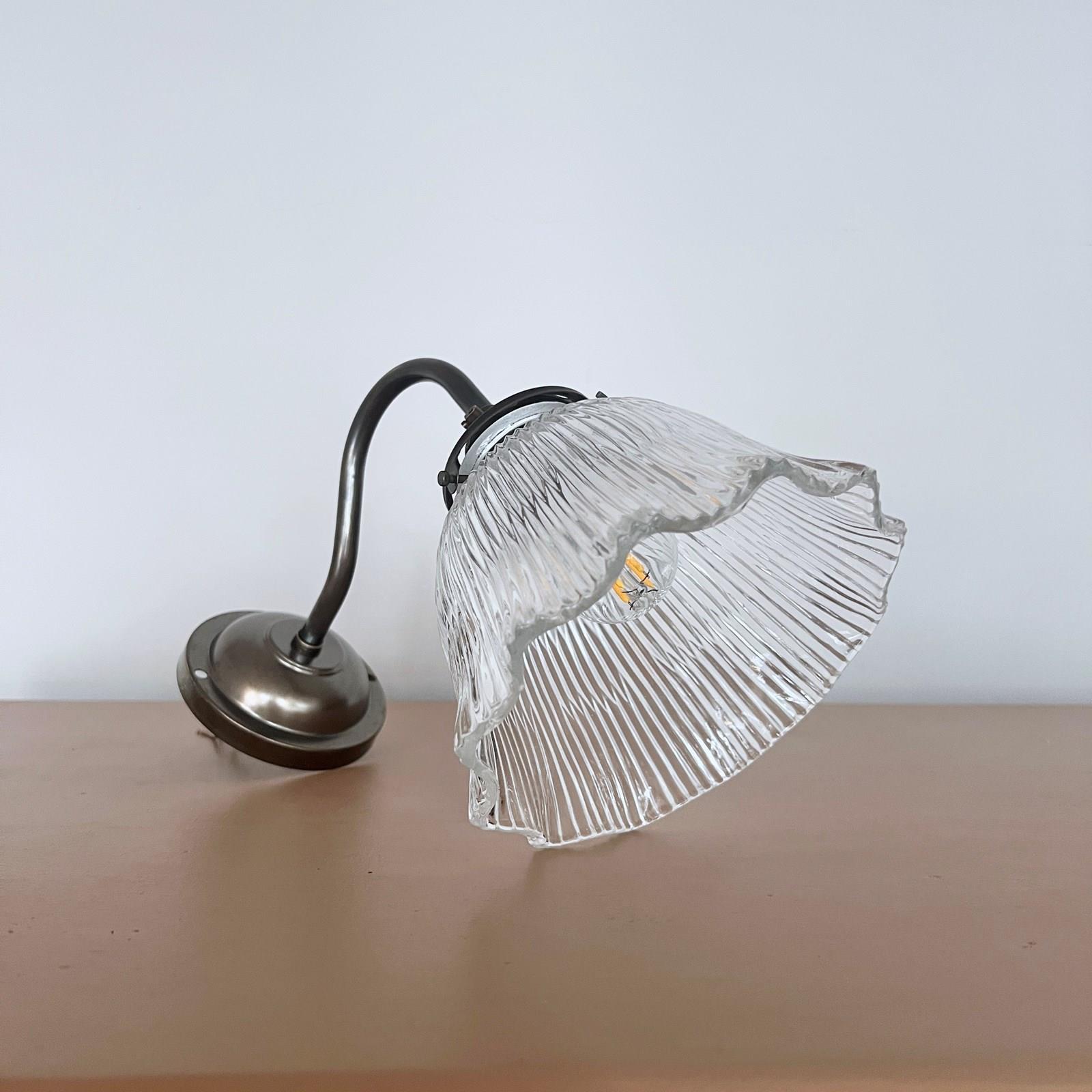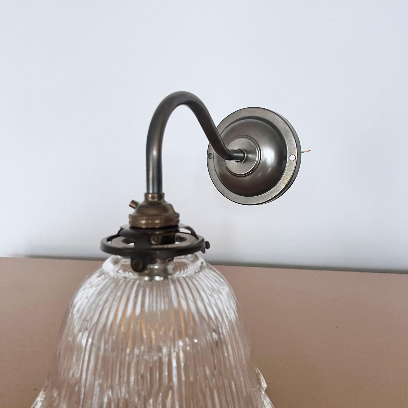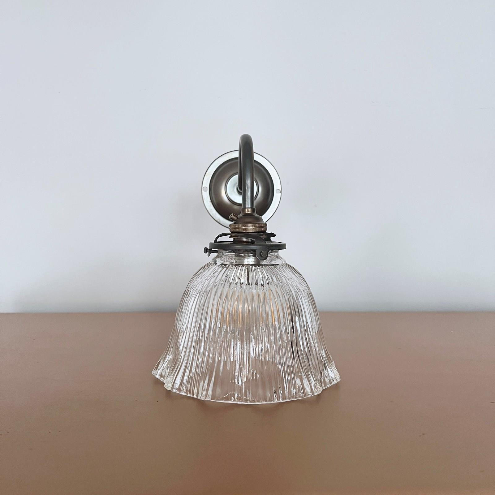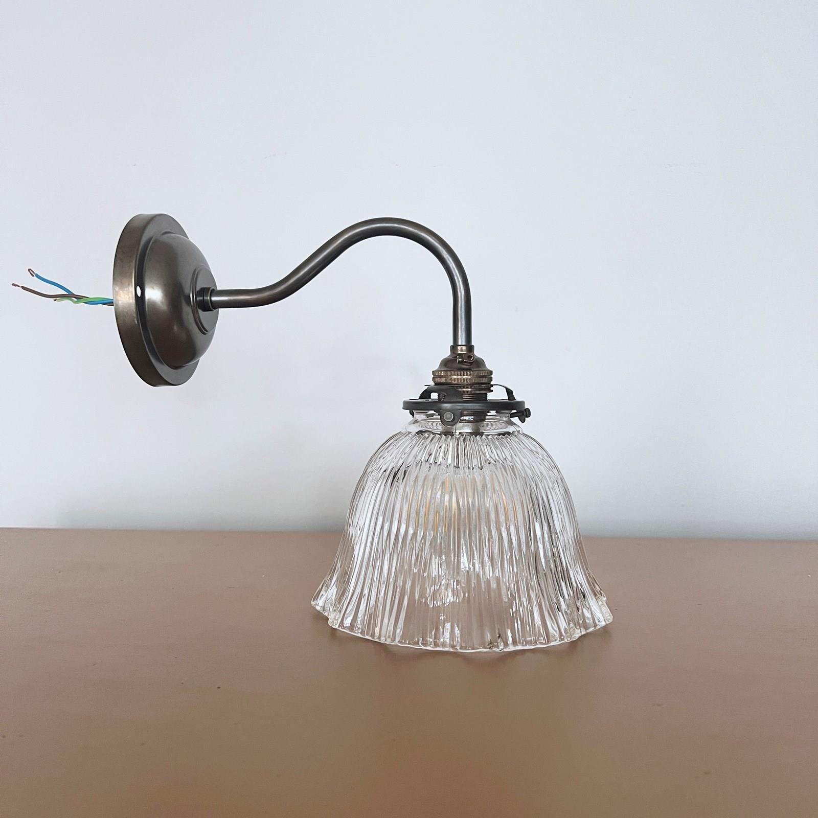 This wall light has been made using new brass parts with a single lamp. The piece is shown in antique brass finish. The wall light features a vintage frilled holophane glass shade.