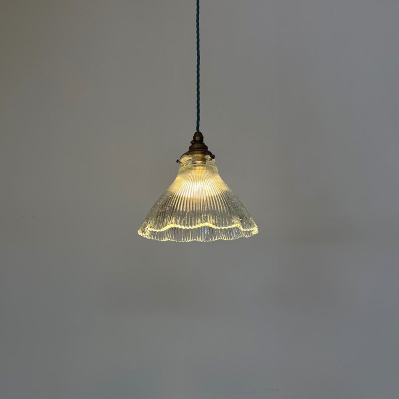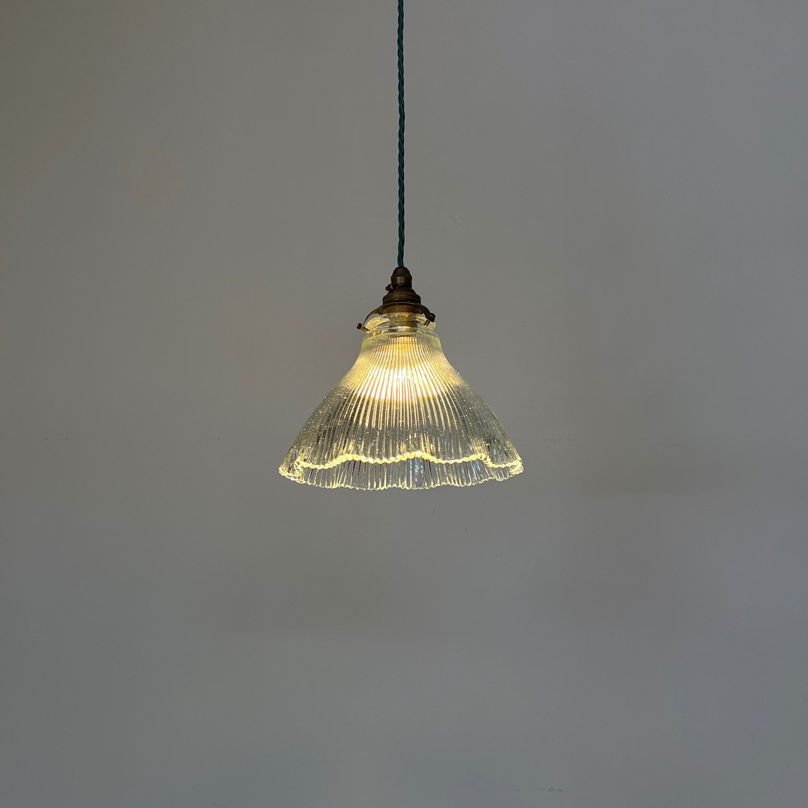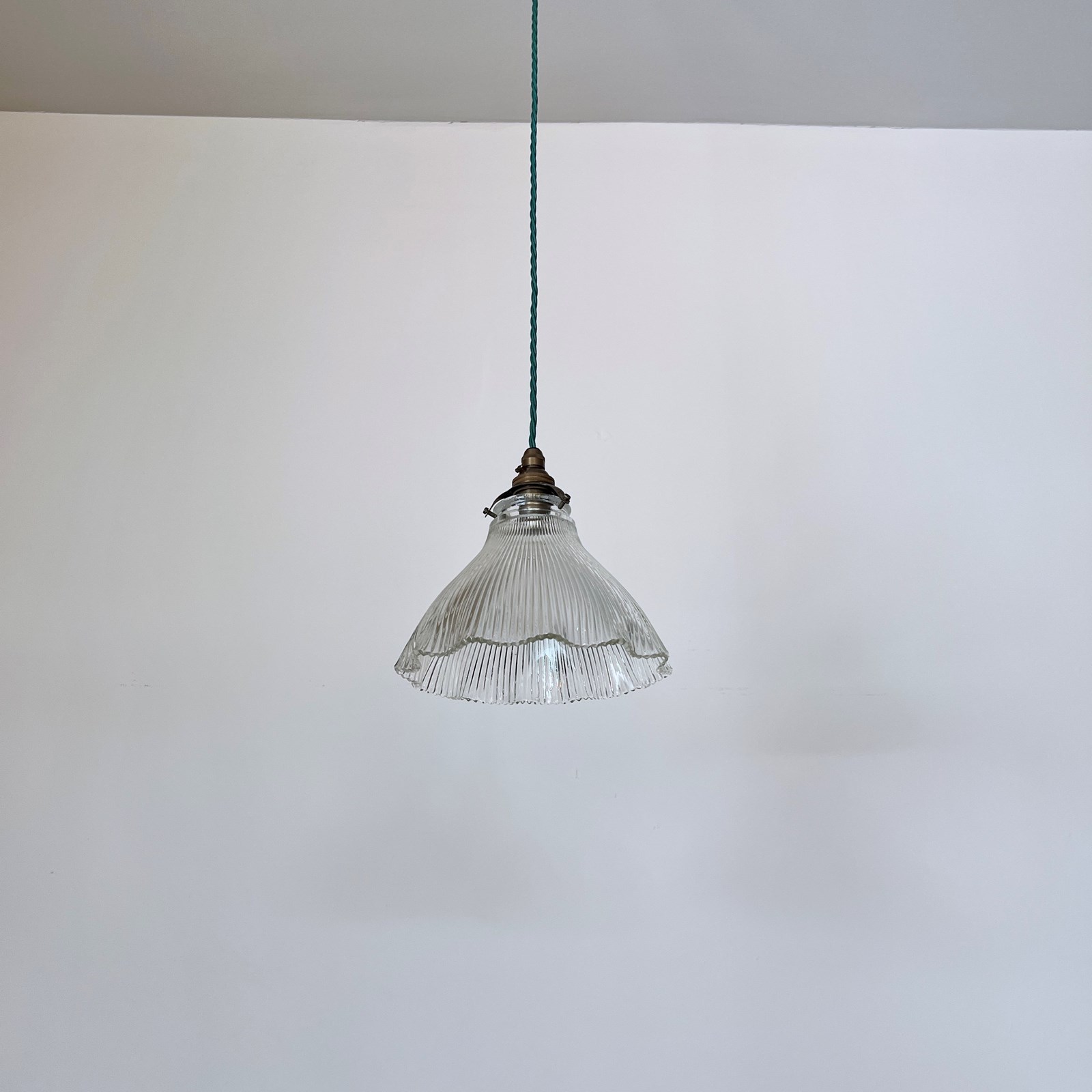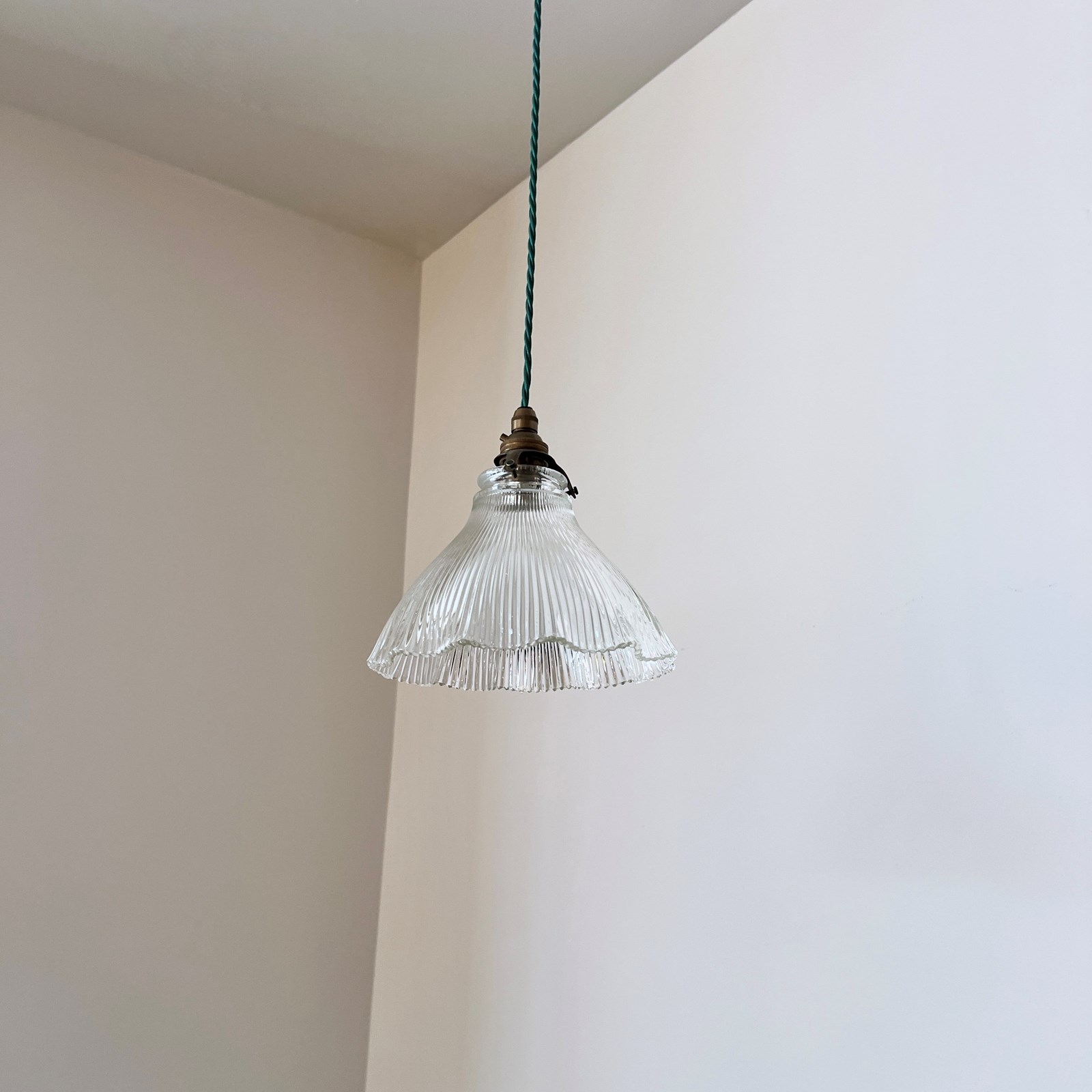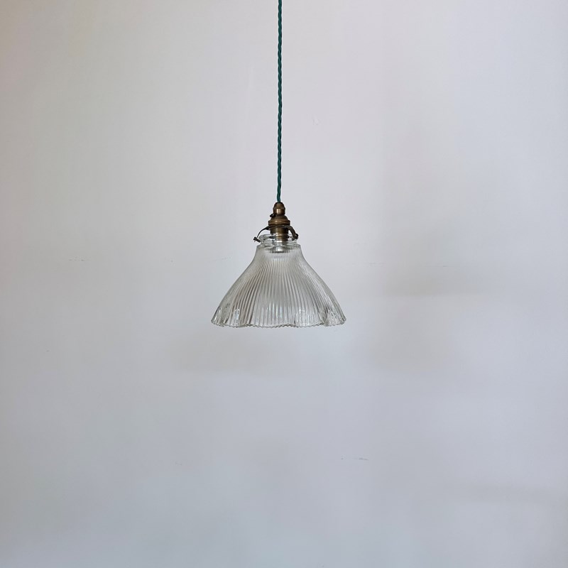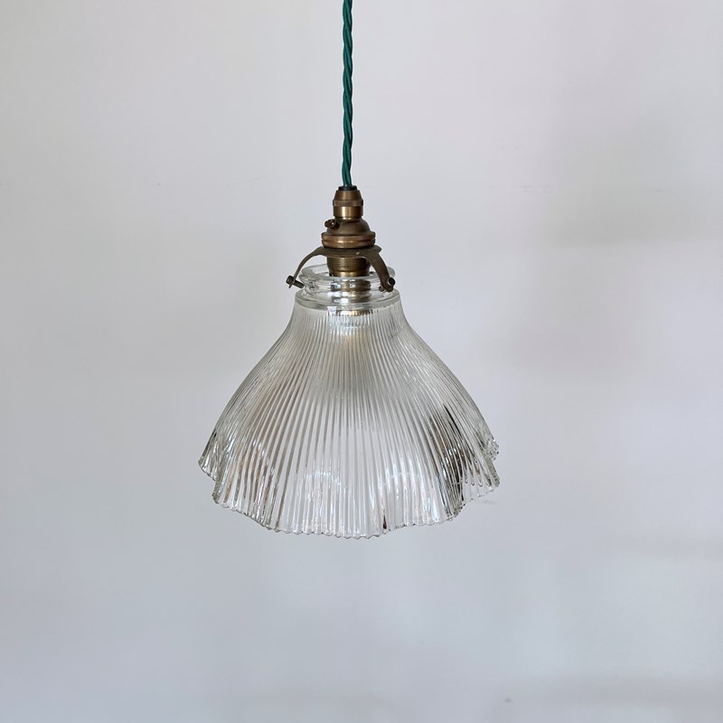 Holophane style fluted glass shade. Rewired with an antique brass finish lamp holder and skeleton fitting with turquoise braided flex. The shade requires one B22 lamp. The coloured flex can be changed to your preference and a matching ceiling fitting is supplied.