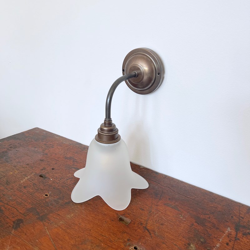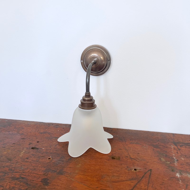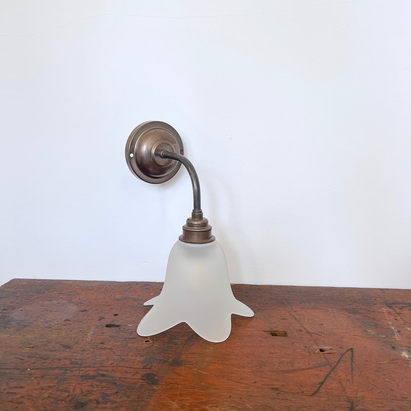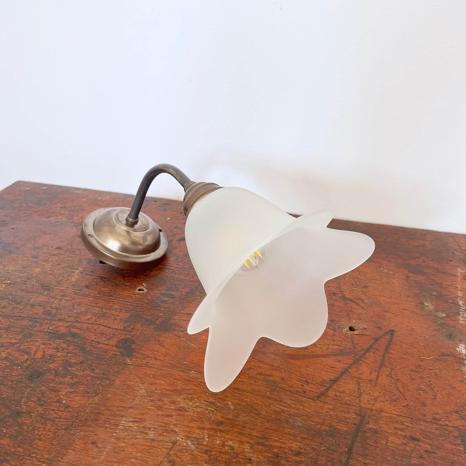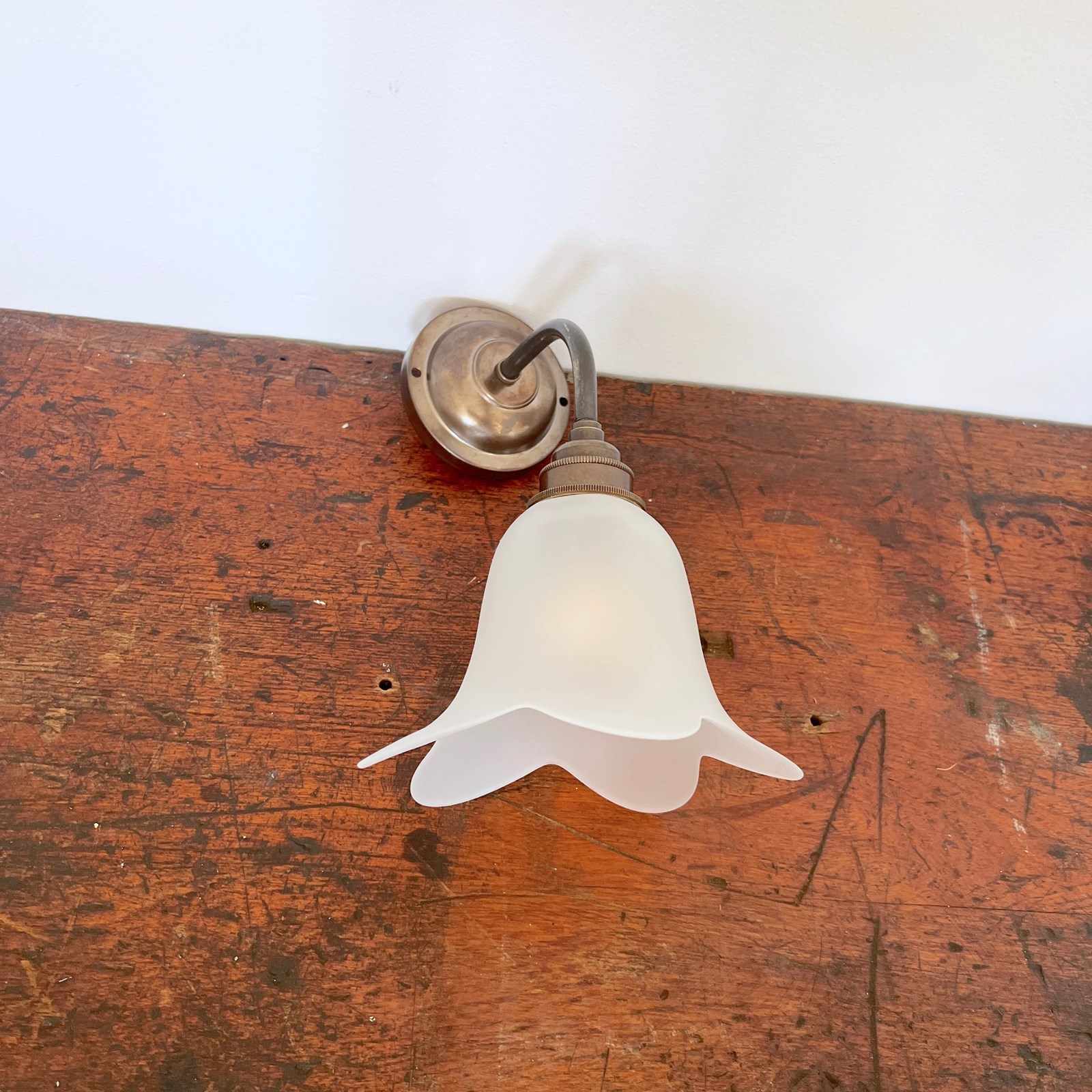 These bespoke wall lights have been made using new brass parts each with a single lamp. We have multiples available. These pieces are shown in an antique brass finish. Each light features a floral frosted shade.